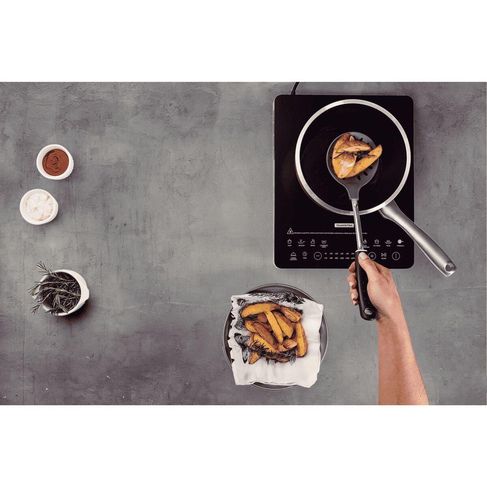 Espumadeira Nylon/inox Cabo Preto - Tramontina Utilitá 25691/100Detalhes do produtoCozinhar é uma delícia, mas pode ser um problema se você não tiver os utensílios adequados. A Espumadeira Tramontina Utilitá em Nylon com Cabo de Polipropileno Preto da linha Utilitá é um desses itens que são verdadeiros amigos de quem cozinha. É ideal para uso em panelas com revestimento antiaderente e cerâmico. Utensílio de nylon com resistência até 180 graus, haste de aço inox e cabo em polipropileno, a espumadeira é indispensável em diversos preparos.Informações técnicasEspumadeira de Nylon que permite uso em temperaturas de até 180 °C e haste de aço inox.O cabo de polipropileno possui furo passante possibilitando que seja pendurado na sua cozinha.Utensílio ideal para uso em panelas com revestimentos antiaderentes e cerâmicos, pois não danifica o produto.Pode ir à máquina de lavar louças facilitando seu dia a dia.Recomendações de usoPara maior durabilidade do produto recomenda-se secar bem antes de guardar, mesmo após lavagem em máquina.Para descarte dos produtos e embalagens siga as orientações de reciclagem vigentes.