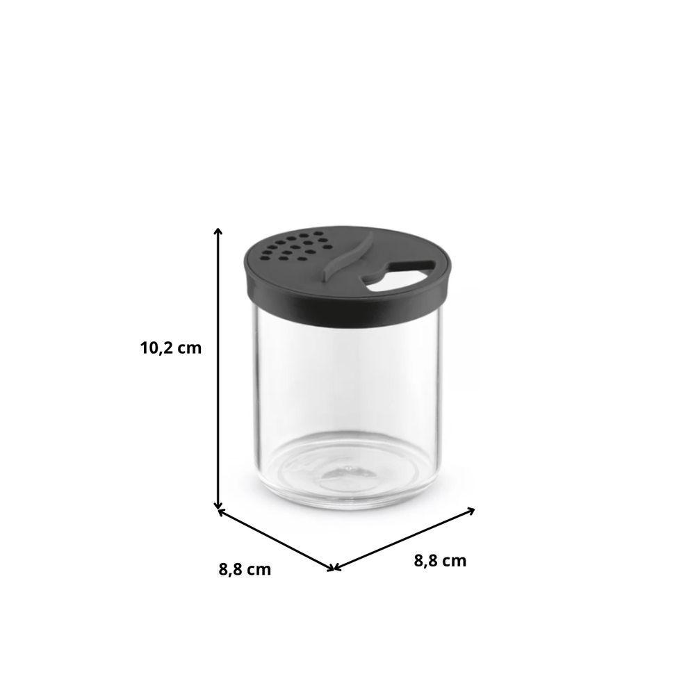 Queijeira/farinheira P Preto - UzO Farinheiro Slim P UZ é perfeito para armazenar e servir todo tipo de farináceos e temperos. Permite que você escolha o que melhor combina com os seus demais utensílios domésticos. Sua tampa possui duas saídas de dosagem, com ótima vedação, e fácil abertura. Feito de poliestireno (ps) cristal e polipropileno (pp) com pigmentos de coloração sólida, é fácil de manusear, lavar e secar. Além disso, o corpo do seu modelo é completamente transparente, possibilitando a visão integral do conteúdo interno. Com um design inteligente e compacto, a praticidade vai dominar a sua mesa e a sua cozinha.vantagens: Dosagem controlada: as duas opções de distribuição disponíveis, permitindo medir tanto grandes quantidades quanto pequenas porções com precisão. Organização e praticidade: ideal para armazenar farinhas, açúcar, cacau em pó e outros ingredientes secos, mantendo-os sempre à mão e prontos para uso. Fácil limpeza: pode ser lavado à mão ou na lava-louças, garantindo uma manutenção prática e rápida. Duas opções de dosagem: o farinheiro possui duas saídas de dosagem – uma maior para despejar quantidades generosas e outra menor para uma dosagem mais controlada, perfeita para polvilhar ou medir pequenas porções.especificações:Cor da tampa: Preto- Capacidade: 250ml- Material: Poliestireno- Medidas: 8,7x16cm
