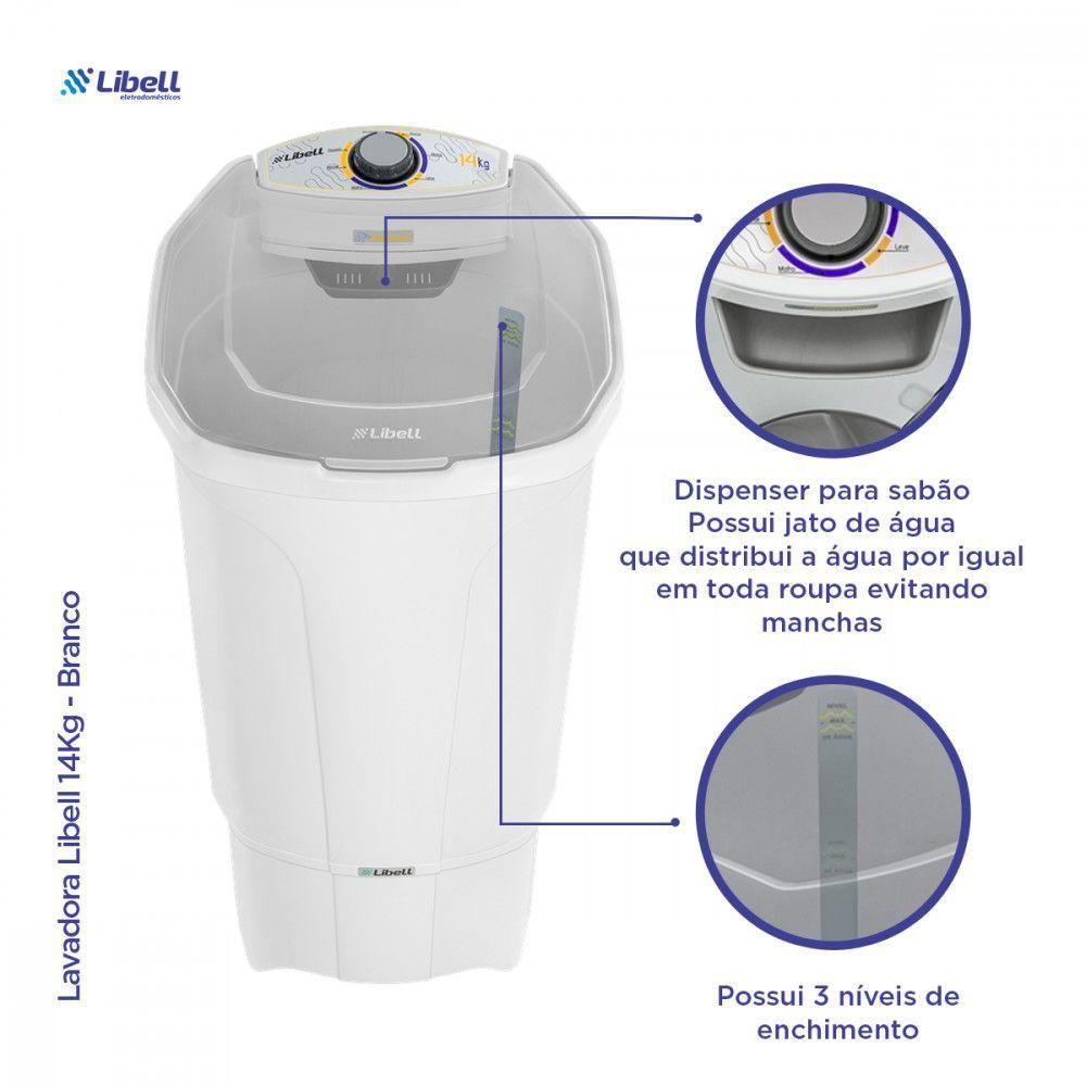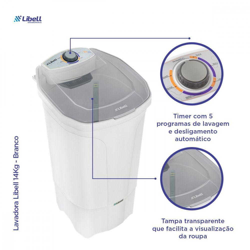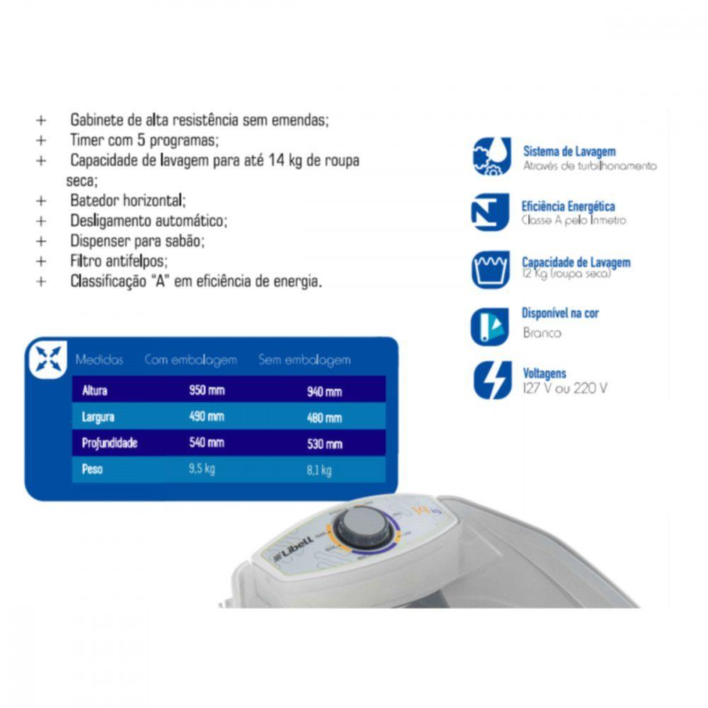 Lavadora De Roupas 14kg Branca Libell 110VA Lavadora de Roupas Libell 14kg e ideal para familias que buscam praticidade e eficiencia. Com capacidade para 14kg e voltagem de 110V, lava grandes volumes com rapidez e economia de agua. Seu design compacto e moderno na cor branca se adapta a qualquer lavanderia. Robusta, facil de usar e perfeita para o dia a dia.Dimensoes:Altura: 94 cm | Largura: 48 cm | Profundidade: 53 cmCaracteristicas:- Capacidade para lavar 14kg de roupa seca- Dispenser de sabao em po e amaciante- Timer com 5 programas- Tampa em plastico propileno- Batedor horizontal- Sistema de lavagem atraves de turbilhonamento- Filtro de drenagem- Filtro de antifelpos- Classificacao A em eficiencia de energia- Potencia 1/5hp- Rotacao do motor 1535rpm- Corrente eletrica 2,8A- Capacitor do motor 35- Garantia: 12 meses** Imagens ilustrativas. Objetos nao acompanham o produto.** O produto e enviado desmontado.AVISO: Esclarecemos que a Opcao Moveis se responsabilizara pela dos produtos adquiridos ate a porta de entrada (casas) ou portaria (predios ou condominios) do endereco indicado, ou seja: e de total responsabilidade do cliente a montagem, desmontagem e instalacao do produto adquirido. Para evitar futuros desagrados ou imprevistos com a , tambem e necessario que o cliente confira as dimensoes do produto escolhido, antes de finalizar a compra, devendo certificar-se de que a mercadoria passara normalmente por elevador, porta, escada e corredor.
