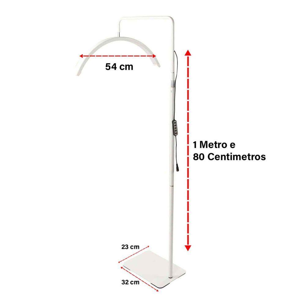 Luminaria Estetica Meia Lua 36w Arco Dentista Salao Beleza Maquiagem Cilios Iluminaçao Estudio Foto Sobrancelha ManicureA luminária meia lua foi projetada para oferecer um ambiente mais aconchegante e funcional. Perfeita para limpeza de pele, manicure, sobrancelha, cílios, o que você precisar!Você pode realizar seu serviço enquanto grava e fotografa tudo.Foi projetada em forma de meia lua que pode reduzir as sombras e proteger os olhos.A luminária possui rotação de 360 graus e é conveniente para mudar de direção, fornecendo luz natural e cuidando demais áreas da pele.A luminária possui LED de alta qualidade, proporcionando uma iluminação brilhante e uniforme, além de ser extremamente eficiente.A facilidade de uso é outra vantagem dessa luminária. Ela possui um painel de controle intuitivo, com botões para ligar/desligar, ajustar a intensidade da luz e alterar a temperatura de cor.Você pode escolher entre luz branca quente, luz mista e luz branca fria.Então, se você busca uma luminária versátil, funcional e elegante, a luminária arco meia lua é a escolha perfeita. Aproveite a comodidade de ter sua iluminação ao seu alcance em um único dispositivo.ATENÇÃO VOLTAGEM: BIVOLTCaracteristicas:Potência: 36wBivolt2800LMCor: BrancoMaterial: Ferro, alumínio e AbsLuminaria Meia LuaTamanho AjustavelFácil de MontarIluminação AjustávelDimensões Aproximadas:Altura Máxima: 1 Metro e 96cmAltura Mínima: 1 Metro e 55cmLargura dos suportes: 2cmCircunferencia dos suportes: 6cmBase:Largura: 23cmComprimento: 32,5cmLampada:Largura: 5cmComprimento: 54cmEspessura: 3cmComprimento do cabo da fonte: 2 metros e 30 centímetrosConteúdo da embalagem:1 Luminária Meia Lua1 Fonte 24V-2S1 Controle Remoto3 Meses de Garantia Contra Defeito de Fabricação.*4400g MOD: SU-LUMI-LUA-1 / BSL3474