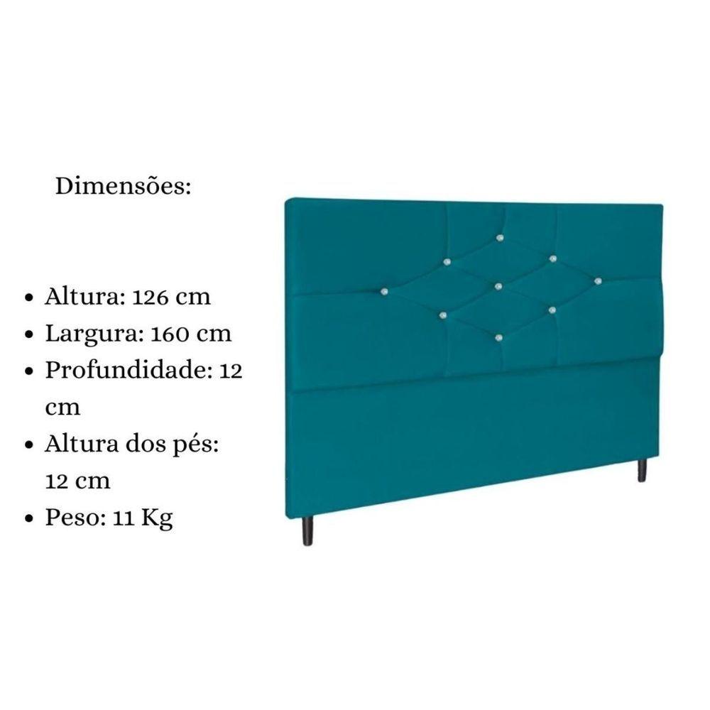 Cabeceira Queen 160 Cm Camboriú Suede Azul Tiffany E FrameA Cabeceira Para Cama Box Camboriú é o móvel ideal pra você que busca mais conforto e elegância para o seu quarto, sem abrir mão da qualidade! Possui um design único e detalhes 9 Capitonê em Strass que dão um toque de sofisticação e luxo ao seu ambiente. Revestida em suede e fabricada em madeira eucalipto de alta qualidade. É ideal para cama box de 158 cm, é o acessório perfeito para valorizar a decoração do seu quarto!Compre já e deixe seu ambiente ainda mais aconchegante com essa linda Cabeceira!Dimensões:Altura: 126 cmLargura: 160 cmProfundidade: 12 cmAltura dos pés: 12 cmPeso: 11 KgEspecificações do Produto:Estrutura: Madeira reflorestada 100% Eucalipto tratada fixada com grampos 14/38 galvanizados.Densidade da Espuma: De poliurteano de alta resiliência, densidade 30mm.Tecido: Suede Animale 100% poliéster.Material dos pés: Madeira Eucalipto cor tabaco com parafuso para rosquear.Acompanha kit framers com fixação de parafusos em formato de chave fenda (parafusos já embutidos na cabeceira).Garantia: 90 dias contra defeito de fabricação.Montagem: O produto vai montado, necessitando apenas rosquear os pés (2).Instruções de Limpeza: Utilizar um pano limpo e levemente úmido.Você irá receber: 01 volume.Observações Relevantes:- Todos os produtos vão embalados com total segurança;- As cores dos produtos podem sofrer alterações dependendo do seu monitor;- Para futuras compras, não garantimos a mesma tonalidade de cor, pois existe variação a cada lote do fabricante do tecido;- As imagens são meramente ilustrativas, não acompanham objetos de decoração e eletros;- Confira as dimensões do produto no momento da compra e certifique-se de que passará normalmente por escadas, elevadores, portas e corredores;- Importante: Por se tratar de estofado as medidas podem ter uma pequena variação em até 3 cm;