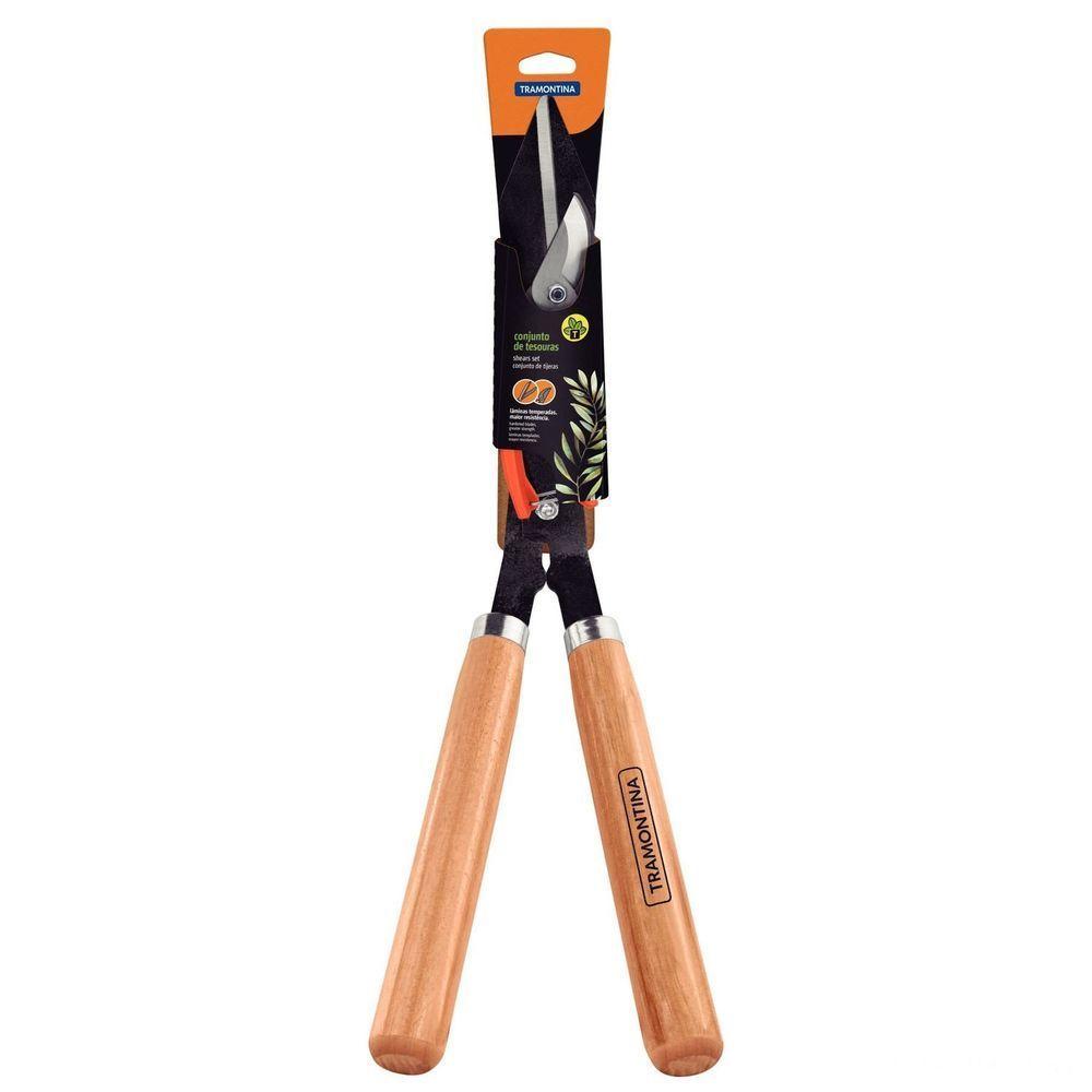 Conjunto De Tesoura De Poda E Tesoura Para Cerca-viva/grama Tramontina 2 Peças TramontinaConjunto de Tesoura de Poda e Tesoura para Cerca-Viva/Grama Tramontina 2 Peças Tramontina -Conjunto de Tesoura de Poda e Tesoura para Cerca-Viva/Grama Tramontina 2 PeçasPara manter o seu jardim muito mais bonito e com um belo visual, conte com o conjunto de tesoura de poda e tesoura para cerca-viva/grama Tramontina 2 peças. Com a tesoura de poda você consegue cortar pequenos galhos de árvores ou flores. Já, com a tesoura para cerca-vida/grama é possivel realizar os acabamentos nos arbustos ou naqueles cantinhos do gramado, onde o acesso é mais difícil. Com este conjunto você garante a exuberância do seu quintal. - As tesouras possuem lâminas temperadas fabricadas em aço carbono especial de alta qualidade, proporcionando maior resistência e menor desgaste durante o uso.- A afiação das lâminas é feita em máquinas CNC, proporcionando excelente durabilidade do fio e um corte mais preciso e macio.- A tesoura de poda possui cabos ergonômicos curvos com batentes internos, produzidos em polipropileno de alta resistência.- A tesoura de cerca-viva possui cabo de madeira de origem renovável, com acabamento envernizado, para um melhor acabamento e apresentação do produto. A camada protetora em verniz incolor realça sua tonalidade, concedendo brilho e um toque mais liso ao produto.- Produtos leves, que geram menos esforço físico do usuário e tornam o trabalho mais prazeroso.- Um lindo e prático conjunto de tesouras, ideal para poda e manutenção do jardim.Titulo 03- A tesoura para cerca-viva/grama é própria para desbaste e acabamento de cerca-viva, arbustos e para aparar a grama. Também pode ser utilizada na topiaria (arte de podar plantas em formas ornamentais).- A tesoura de poda é própria para poda de frutíferas, flores e plantas ornamentais.- Conservar a ferramenta limpa, secando-a depois de lavá-la. Aplique fina camada de óleo sobre as lâminas e articulações.- Cuidado: A lâmina é afiada. O contato pode resultar em lesões. Manuseie com cuidado e mantenha fora de alcance das crianças.- Para descarte dos produtos e embalagens siga as orientações de reciclagem vigentes.Garantia90 dias de garantia legal para vícios ou defeitos de fabricação.Características Gerais do Produto:Garantia:- 3 meses Contra defeitos de fabricação