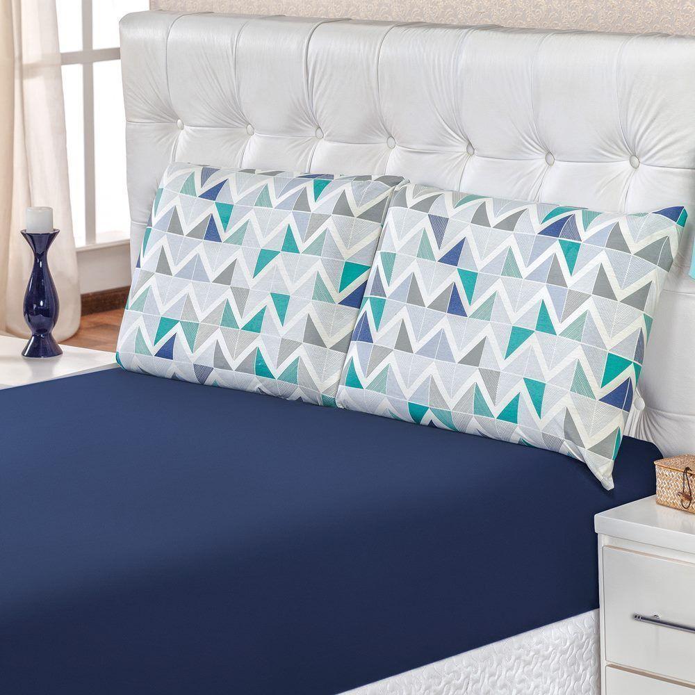 Edredom 2,60m X 2,40m + Jogo De Cama Malha Quality King 04 Peças 100% Algodão - Geométrico Azul