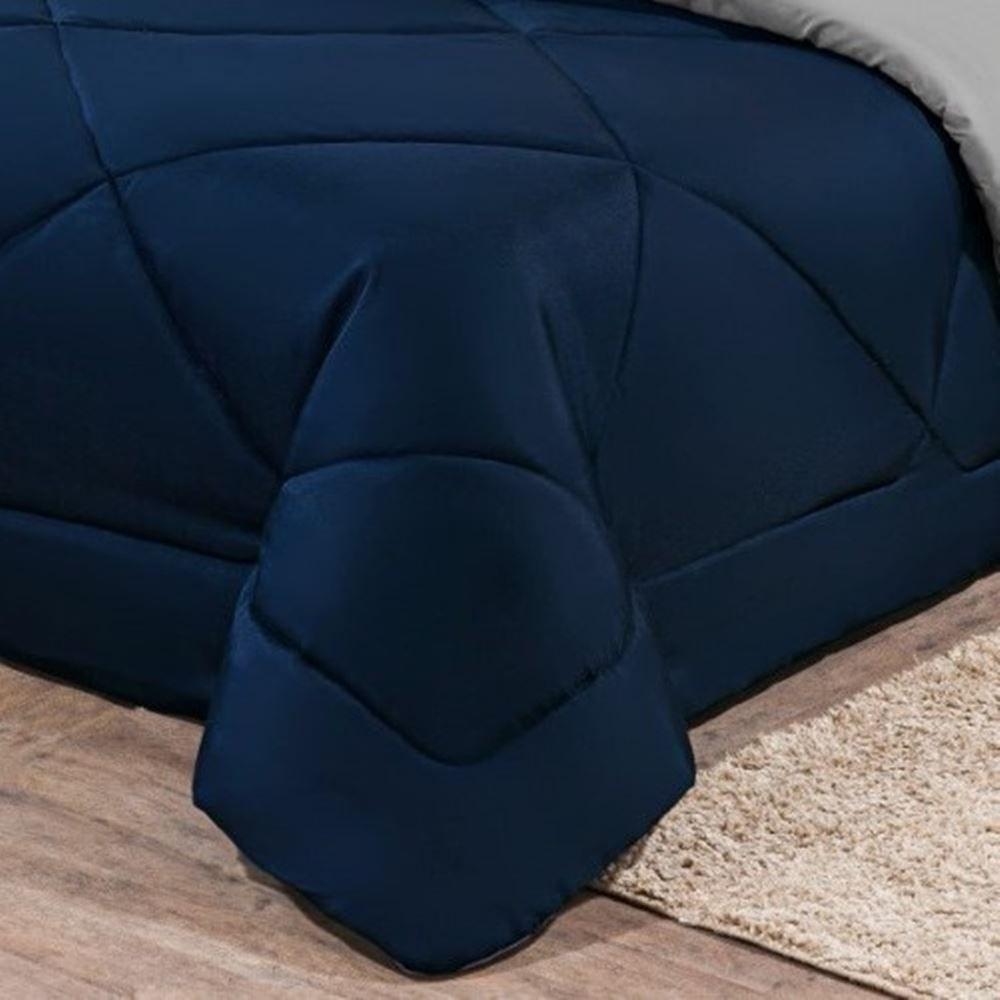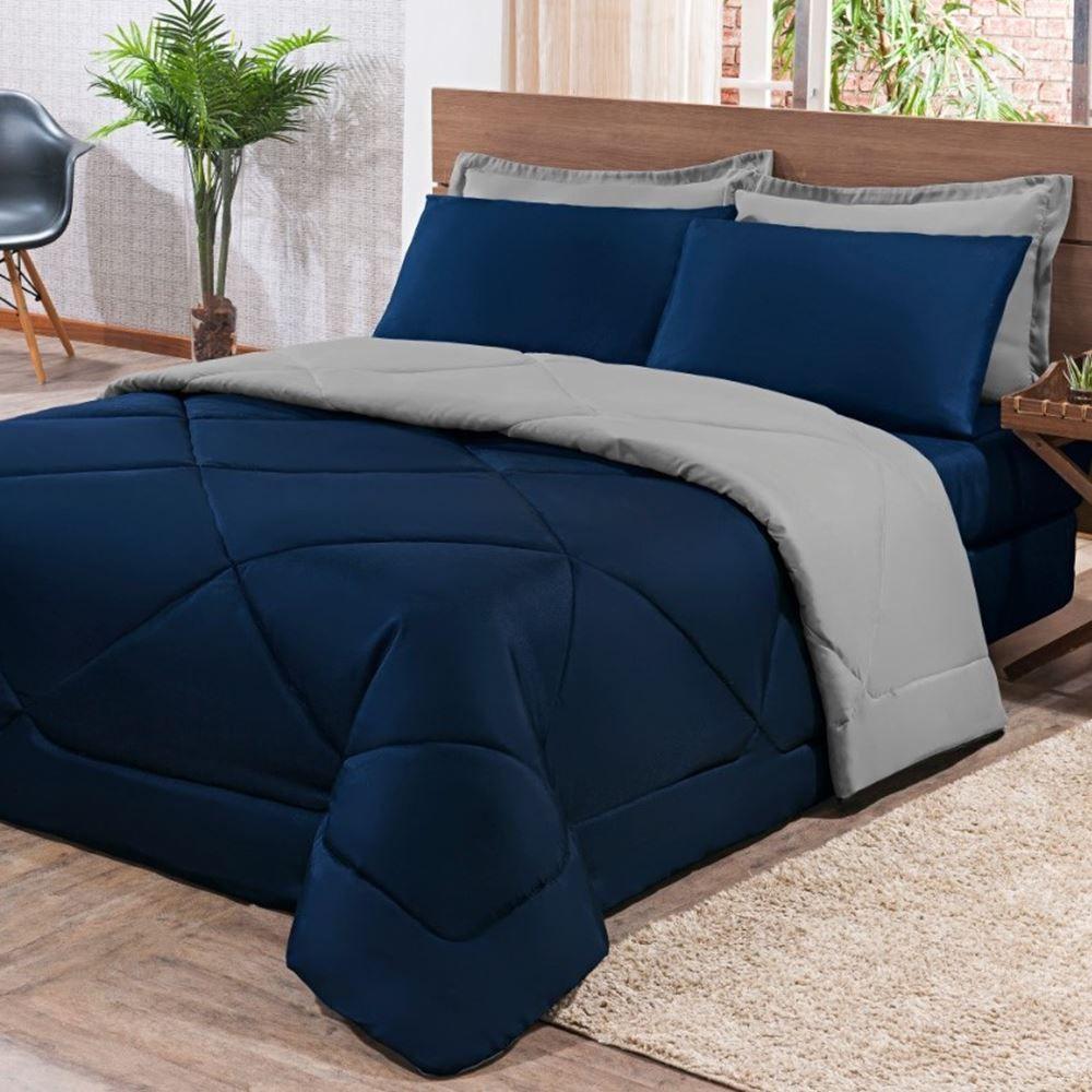 Kit Edredom + Jogo De Lençol Aconchego Look House Casal Padrão 6 Peças 80% Algodão , 20% Poliéster- Azul E CinzaRenove o visual do seu quarto com o Kit Cama Casal Padrão Look House 06 Peças. Uma combinação pensada para oferecer noites de sono tranquilas e uma decoração impecável, unindo a maciez do tecido misto com a praticidade de um enxoval completo e coordenado.Por que o Kit Look House é uma ótima escolha?Conforto e Durabilidade: Produzido em tecido 80% Algodão e 20% Poliéster, o kit oferece o toque macio do algodão com a resistência do poliéster.Cama Posta Completa: A união do Edredom com o Jogo de Lençol garante uma cama volumosa, aconchegante e visualmente harmônica.Praticidade no Ajuste: O lençol de baixo possui elástico, facilitando a arrumação e garantindo que ele permaneça firme no colchão.Camadas de Estilo: Com 2 porta-travesseiros e 2 fronhas, você cria camadas na decoração, elevando a sofisticação do ambiente.Produto composto por (Total 06 Peças):Do Kit Edredom (03 Peças):01 Edredom 2,50m x 2,20m02 Porta Travesseiros 70cm x 50cmDo Jogo de Lençol (03 Peças):01 Lençol de baixo com elástico (para colchão de 1,38m x 1,98m x 30cm alt.)02 Fronhas 70cm x 50cmAtenção: Este kit é composto pelo jogo de cama essencial (3 peças) e não inclui o lençol de cima (sobre lençol).Composição:Tecido: 80% Algodão e 20% Poliéster