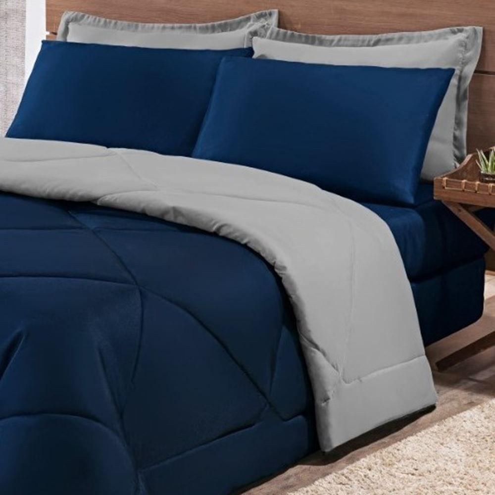 Kit Edredom + Jogo De Lençol Aconchego Look House Casal Padrão 6 Peças 80% Algodão , 20% Poliéster- Azul E Cinza
