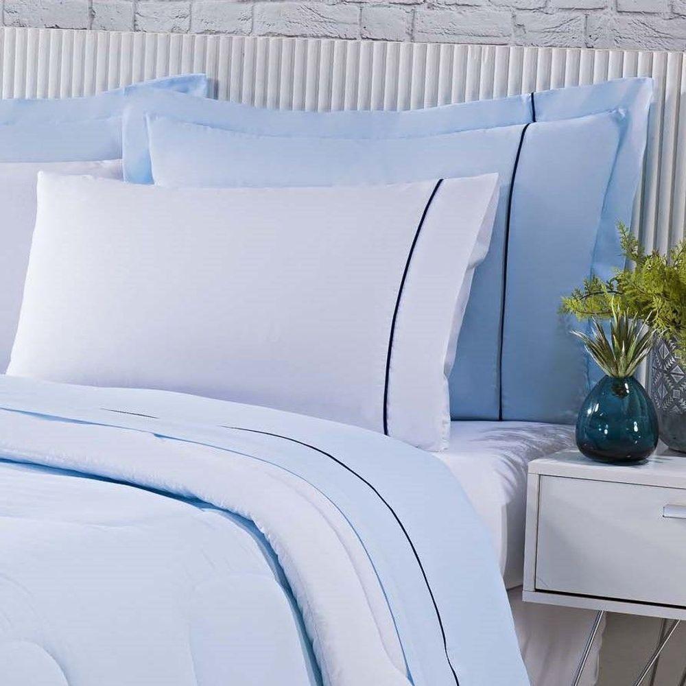 Kit Edredom 100% Algodão Percal 150 Fios Dupla Face King + Jogo De Cama Gran Moratta 7 Peças - Branco/ AzulO Edredom Gran Moratta é confeccionado com tecido Percal 100% Algodão, é dupla face, ou seja, pode ser dos dois lados, sendo um com detalhe em Vivo.O jogo de cama possui tecido Percal 100% Algodão, acompanha lençol de baixo, lençol de cima e fronhas.A combinação perfeita para suas noites de sono!Produto composto por:01 Edredom 2,40m x 2,90m02 Porta Travesseiro 70cm x 50cm01 Lençol de Cima 2,40m x 2,90m01 Lençol de Baixo para Colchão 1,93m x 2,03m x 0,40m02 Fronhas 70cm x 50cmComposição:Percal 150 Fios 100% AlgodãoEnchimento 100% Poliéster (120 Gramas)