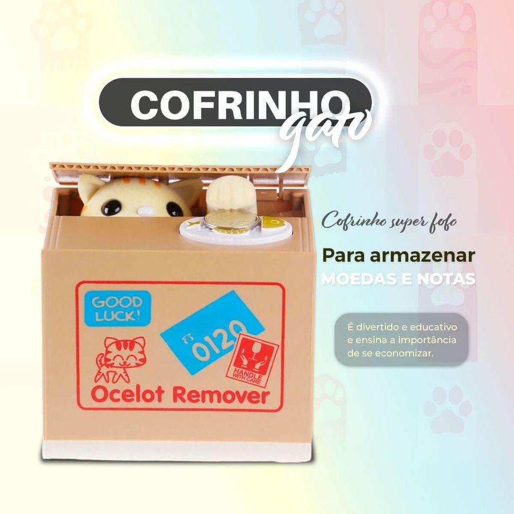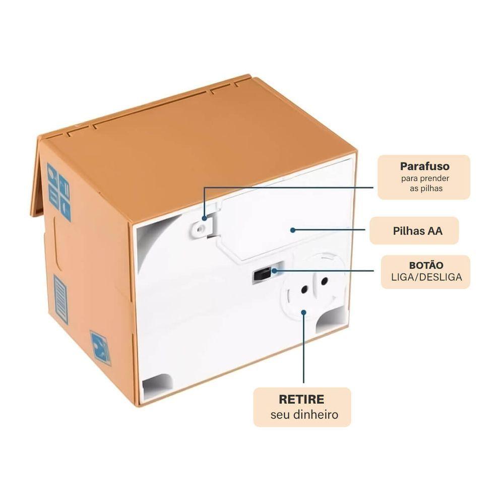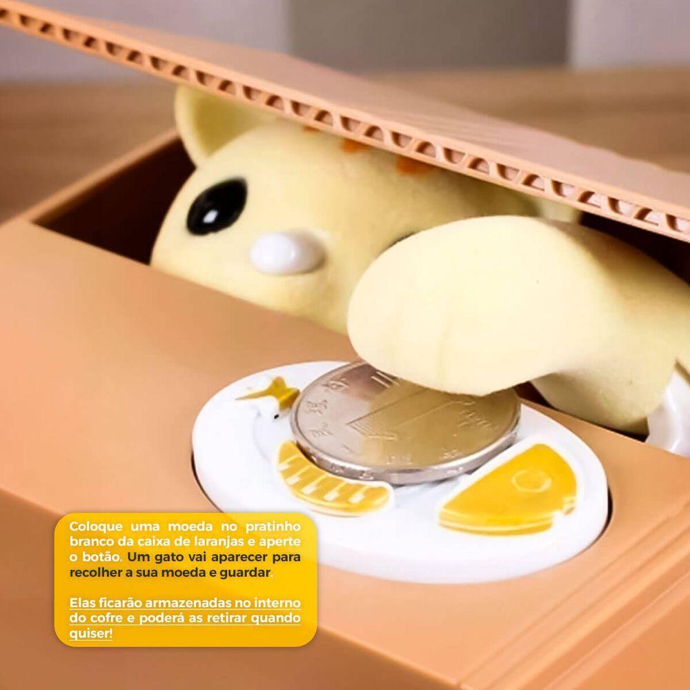 Cofrinho Eletronico Interativo Gatinho Que Puxa MoedaCores dos Desenhos: conforme disponibilidade.Coloque uma moeda no pratinho branco da caixa de laranjas e aperte o botão. Um gato vai aparecer para recolher a sua moeda e guardar. Elas ficarão armazenadas no interno do cofre e poderá as retirar quando quiser!Informações Técnicas:Alimentação: 2 pilhas AA (não inclusas) Material: Plástico + componentes eletrônicos O gatinho recolhe moedas de qualquer tamanho e peso Possui efeitos sonoros Deve ser colocado no pratinho 1 moeda por vezItens Inclusos:1x Cofrinho Gatinho que Puxa Moeda