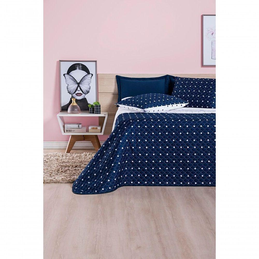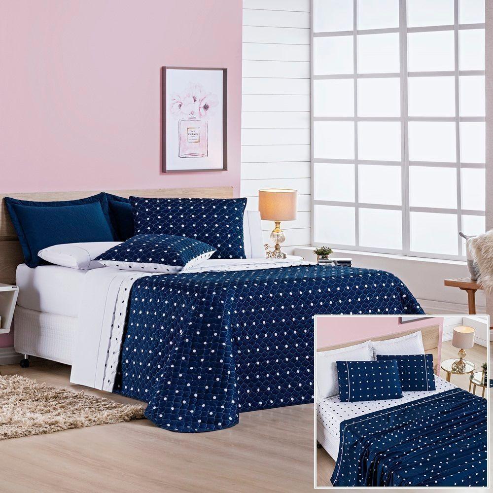 Cobre Leito + Jogo De Cama Queen + Jogo De Banho Petit Poá 12 Peças 100% Poliéster - Marinho