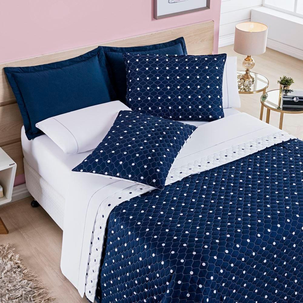 Cobre Leito + Jogo De Cama Solteiro + Jogo De Banho Petit Poá 10 Peças 100% Poliéster - Marinho