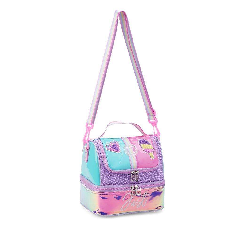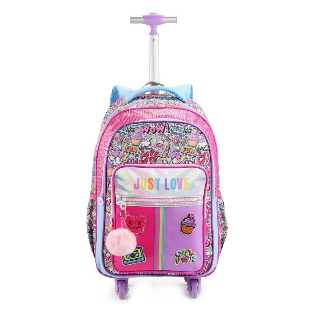 Kit Mochila De Rodinhas + Lancheira + Estojo Just Love Rainbow Chaveiro Denlex