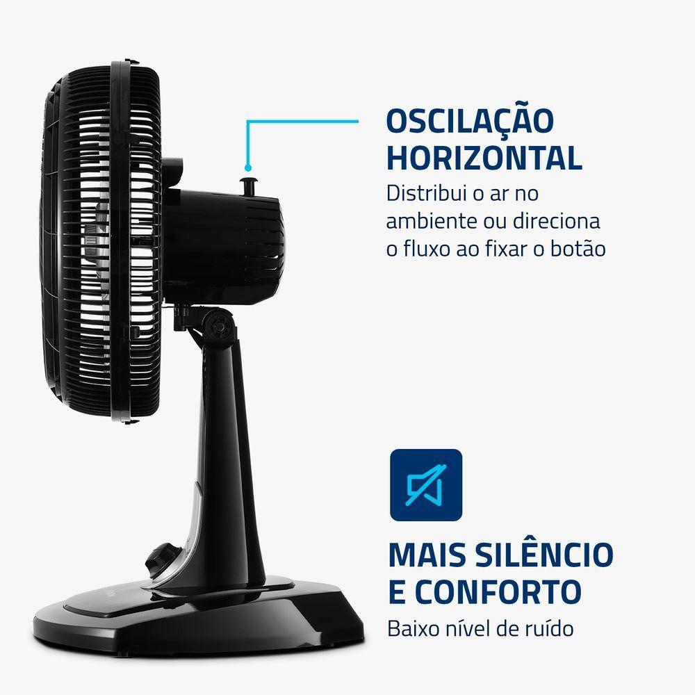 Ventilador De Mesa Mondial 30cm 6 Pás Turbo VT-30-NB Preto Prata 220VO Ventilador de Mesa Mondial Turbo VT-30-NB foi projetado para garantir um ambiente mais fresco e arejado. Com 30 cm de diâmetro e uma hélice de 6 pás, seu design aerodinâmico proporciona uma forte ventilação e uma melhor distribuição de ar. O aparelho conta com três opções de velocidade (Máxima Turbo, Média Conforto e Mínima Silencioso) e um sistema oscilante contínuo, permitindo que você ajuste o fluxo de ar para o seu conforto. Além disso, o ventilador apresenta baixo nível de ruído, sendo ideal para uso em qualquer ambiente, inclusive durante o sono ou momentos de concentração.Principais Características:Vento Turbo: Hélice de 6 pás para maior fluxo de ar.Baixo Nível de Ruído: Conforto e silêncio para uso noturno ou em escritórios.Sistema Oscilante Contínuo: Garante uma distribuição de ar mais ampla no ambiente.3 Opções de Velocidade: Permite ajustar a intensidade do vento.Fácil de Limpar: A grade frontal é removível, simplificando a higienização.Especificações Técnicas:Modelo: VT-30-NBMarca: MondialCor: Preto/PrataVoltagem: 220VPotência: 60WQuantidade de Pás: 6Diâmetro: 30 cmRecursos Adicionais: Inclinação vertical regulável, função oscilante, alça de transporte e porta-fio.Dimensões Aproximadas: 61,5 cm (A) x 39 cm (L) x 35,4 cm (P)Peso: 2 Kg