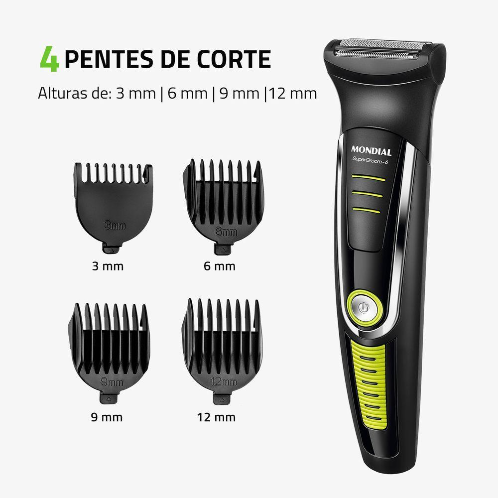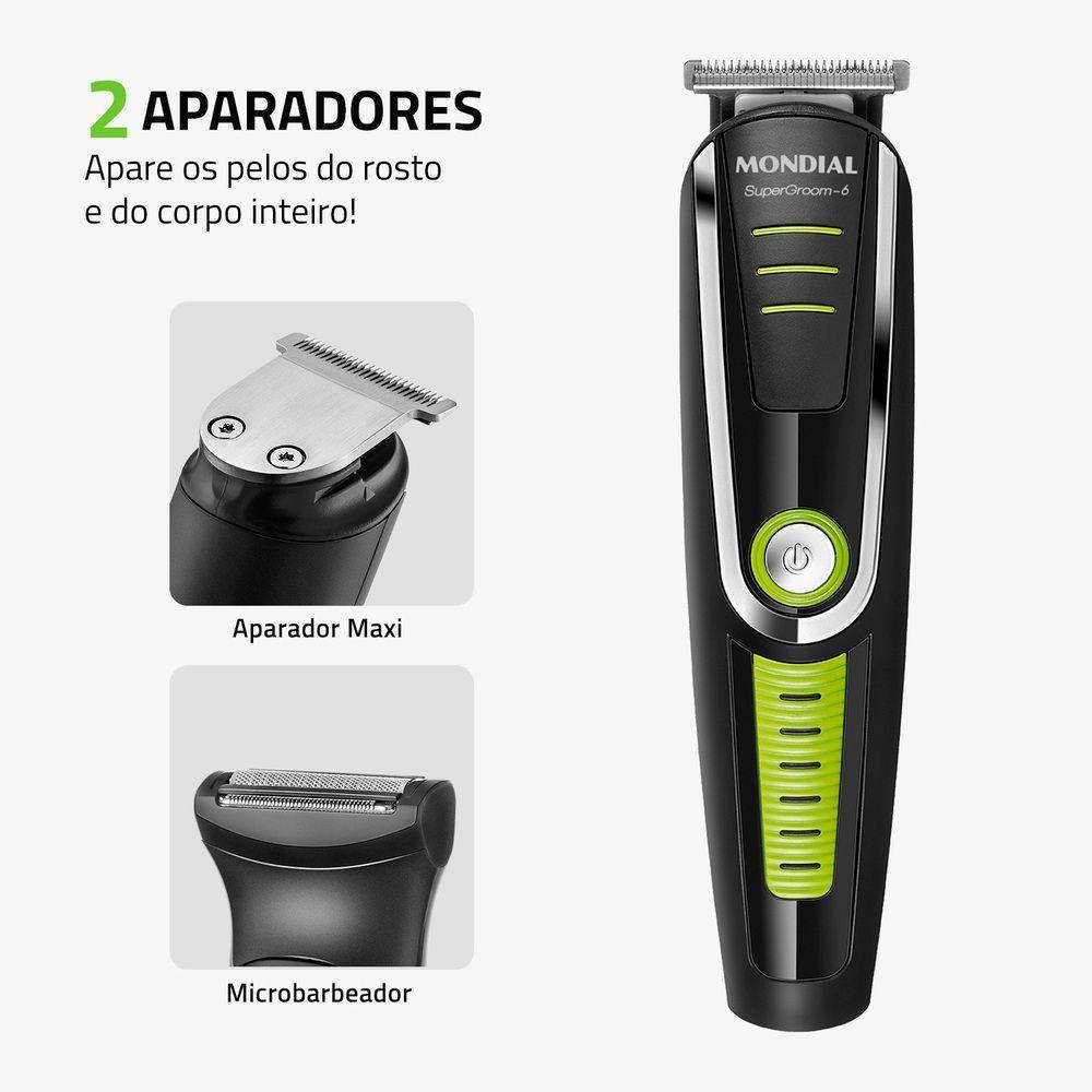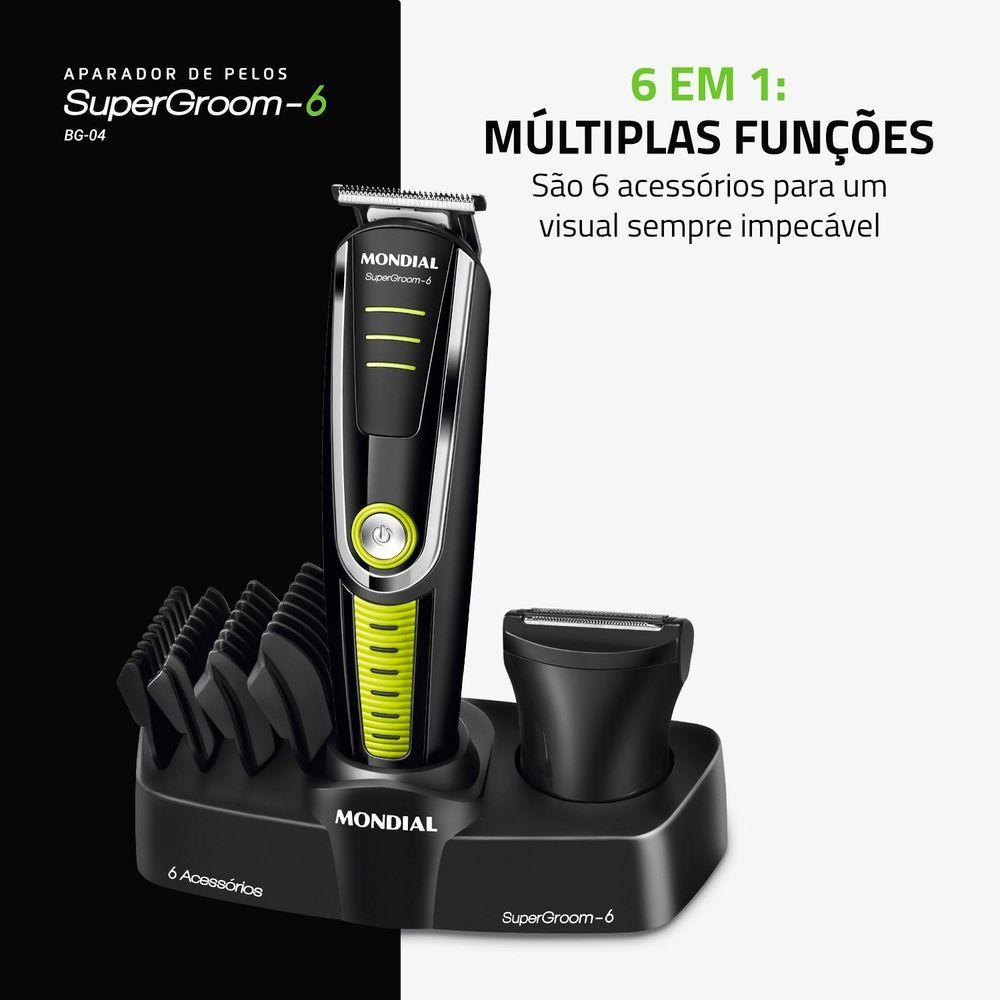 Aparador De Pelos Mondial Super Groom Lâminas Em Aço Inox 6w Bg-04 Preto/verde BivoltAparador de Pelos Mondial Super Groom 6W BG-04 Preto/Verde BivoltO Aparador de Pelos SuperGroom Mondial é ideal para manter o visual sempre em dia, com muita praticidade! O aparelho conta com 2 tipos de aparadores para cabelo, rosto e corpo e 4 pentes de corte com guias de 3, 6, 9 e 12mm, para a remoção dos pelos no comprimento que preferir. Suas lâminas em aço inox oferece alto desempenho para um corte rente, preciso e suave.6 EM 1: O aparador de pelos da Mondial vem com 6 acessórios: são 2 tipos de aparadores de alto desempenho e 4 pentes de corte com diferentes opções de altura para aparar e remover os pelos do rosto e do corpo inteiro. Você pode ter uma aparência impecável sem sair de casa!PENTES DE CORTE: Acompanha 4 pentes de corte com 3mm, 6mm, 9mm e 12mm para aparar os pelos no comprimento que preferir.APARADOR MAXI: Ideal para aparar os pelos do rosto, pescoço e corpo com total praticidade. Garante o corte rente à pele quando usado sem pente de corte.MICROBARBEADOR: Sistema exclusivo para aparar e raspar com suavidade os pelos rente à pele.LÂMINAS EM AÇO INOX: As lâminas em aço inox asseguram um corte rente, preciso e suave. Além disso, garantem maior durabilidade ao produto.MAIS TEMPO DE USO: A bateria recarregável de Ion Lithium garante até 90 minutos de uso sem fio. Além disso, o produto é bivolt, perfeito para usar em qualquer lugar!BASE CARREGADORA: Perfeita para armazenar e recarregar o aparador diretamente na base.LUZ INDICADORA: Indica o nível da bateria para carregamento.Mondial, a escolha inteligente!Especificações Técnicas:Modelo: BG-04Cor: Preto/VerdeVoltagem: BivoltItens inclusos: 01 Aparador de Pelos, 01 Cabeça aparadora, 04 Pentes de corte, 01 Base carregadora, 01 Carregador e Manual de Instruções.Lâmina: Aço inoxRecarregável: SimAlimentação: Energia ElétricaTipo de tomada: 10AFunções: Aparador, microbarbeador e cortadorUso seco ou molhado: Apenas secoUso sem fio: SimIndicador de bateria: SimDimensões e Peso Aproximados do Produto:Altura:18,5 cmLargura:18 cmProfundidade: 7,5 cmPeso:250gGarantia Produto: 1 Ano (3 meses de garantia legal e 9 meses para defeitos de fabricação).Importante: Imprescindível à conferência no ato da entrega. Em caso de anormalidade, recuse o recebimento.Todas as informações divulgadas são de responsabilidade do fabricante, podendo sofrer alterações sem nenhum aviso prévio.Imagem meramente ilustrativa.Aparador de Pelos Mondial Super Groom lâminas em aço inox 6W BG-04 Preto/Verde Bivolt