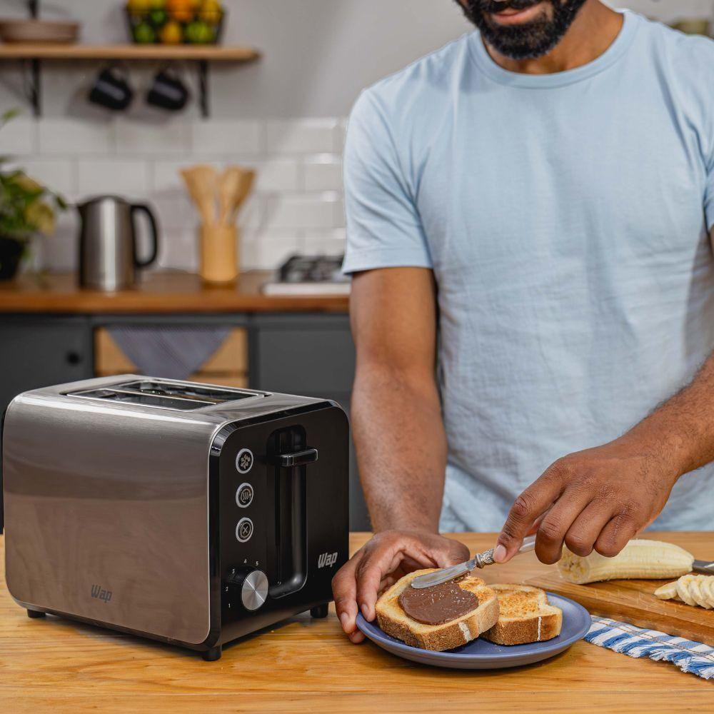 Torradeira Elétrica Wap WTE1 110VAprimore Suas Manhãs com a Torradeira Elétrica WAP - Estilo e Praticidade em Cada Fatia!A Torradeira Elétrica WAP (WTE1) é a escolha perfeita para o seu dia a dia. Combinando seus níveis de tostagem, acabamento em inox e design moderno, esta torradeira oferece praticidade e estilo.Com seus 7 níveis de tostagem, você tem o poder de escolher a crocância perfeita para o seu pão. Desde um toque leve e crocante até um dourado irresistível, sua torrada será sempre do jeito que você gosta. Além disso, ela possui aberturas extralargas que acomodam fatias de diversos tipos e tamanhos, tornando o processo de torrar mais versátil e eficiente.O recurso de elevação automática proporciona praticidade e . Suas fatias de pão são elevadas automaticamente assim que atingem a tostagem desejada. Além disso, a Torradeira Elétrica da WAP possui desligamento automático, trazendo e economia de energia.Descongele pães congelados e transforme-os em deliciosas fatias torradas em questão de minutos com a função descongelar. Reaqueça pães do dia anterior, revivendo sabor e textura, graças à função reaquecer. E com a função cancelar, você tem total controle para interromper o processo de tostagem a qualquer momento.E para facilitar o uso, a bandeja coletora de migalhas removível simplifica a limpeza após o uso, tornando-a uma tarefa rápida e simples.Seja para um café da manhã apressado ou um brunch descontraído, a Torradeira Elétrica WAP é a parceira ideal em todas as horas do seu dia. Sua cozinha ganhará um toque de elegância e praticidade, tornando cada refeição uma experiência deliciosa.WAP | Deixa tudo mais fácil!Níveis de tostagem: 7 Porta fio: Sim Bandeja de migalhas: Sim Potência: 127V (900W) / 220V (800W) Frequência: 60 Hz Voltagem: 127V ou 220V (Escolher no momento da compra) Peso líquido: 1,19 kg Peso bruto: 1,74 kg Quantidade de pães: 2 Dimensões da caixa (C x L x A): 31,6 x 20,2 x 22 cm Desligamento automático: Sim Pés Antiderrapantes: Sim Cor: Preto e cinza Código EAN: 7899831312641 (127V) / 7899831312658 (220V) Código WAP: FW009519 (127V) / FW009520 (220V) Funções: Cancelar, reaquecer e descongelar Dimensões do produto (C x L x A): 26 x 18,7 x 16,6 cm Comprimento do cabo elétrico: 0,8 m