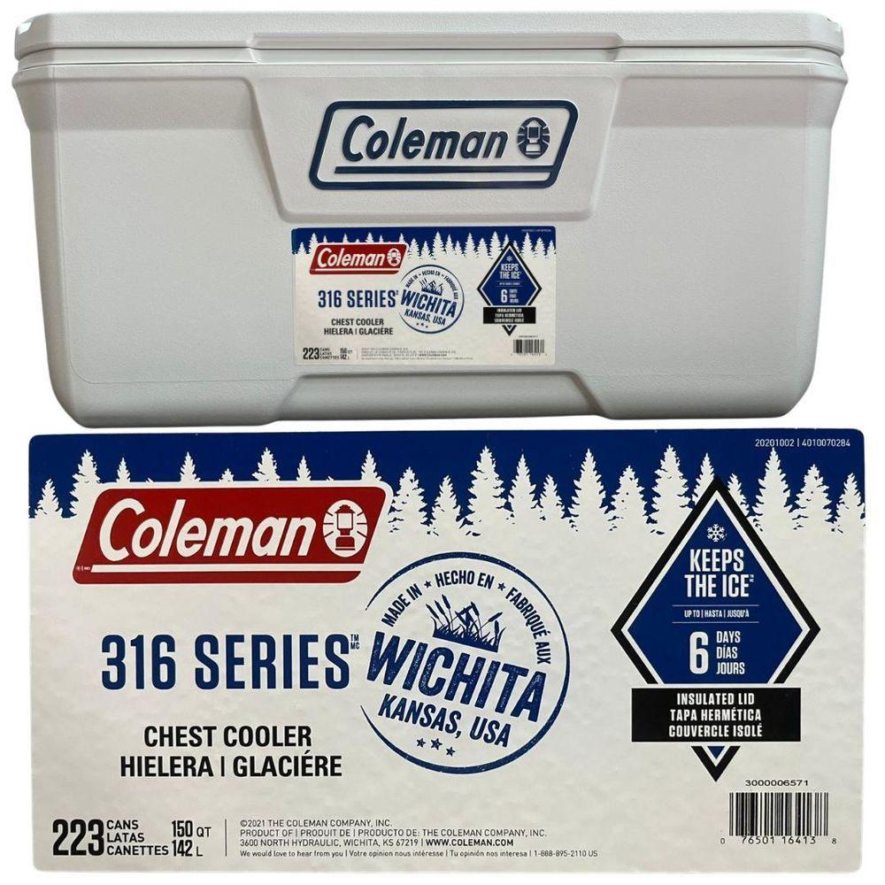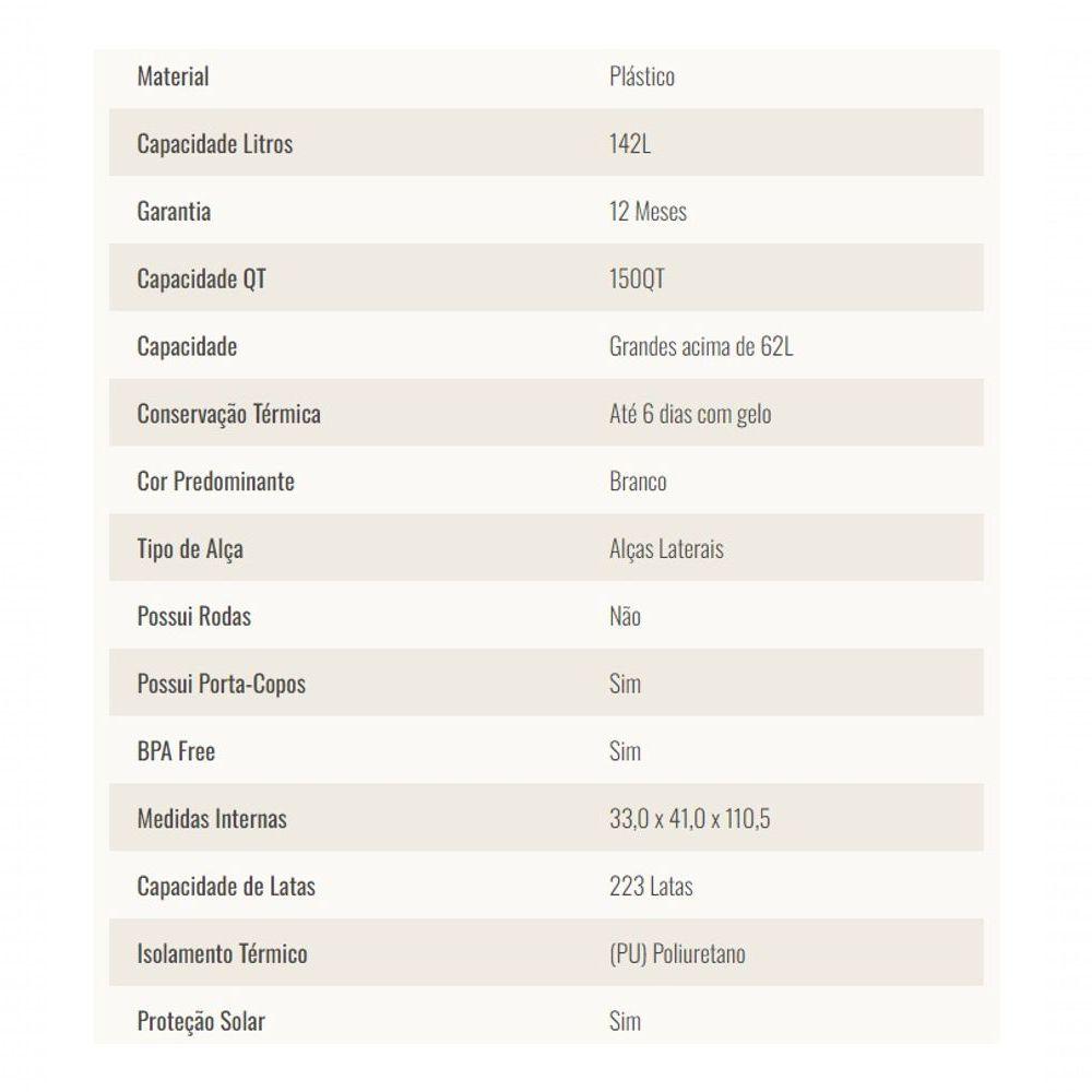 Caixa Térmica Cooler 150 Qt 142 Lt Marine Branca ColemanCaixa Térmica Coleman 150Qt 142L Coleman , é ideal para manter os alimentos e as bebidas frias por mais tempo, com capacidade de refrigeração de até 03 dias, conta com cantos chanfrados para isolamento, porta-copos embutidos na tampa, forro tratado com antimicrobiano resiste à formação de odor, mofo e bolor, tudo isso para você conseguir conservar suas bebidas com toda qualidade e cuidado.Caixa Térmica Coleman 150Qt 142L ColemanDiferenciais:Alimentos e bebidas refrigerados por até 3 dias, mesmo quando as temperaturas estão elevadas.Possui alças laterais que facilitam o transporte e o levantamento da caixa.Possui também tampa com o sistema ?Have a Seat? que suporta até 113kg.Cantos chanfrados para isolamento.Ideal mantendo alimentos e bebidas mais frios por mais tempo.Não se preocupe, os porta-copos embutidos na tampa manterão sua bebida segura eevitarão derramamentos.Conta também com forro tratado com antimicrobiano resiste à formação de odor, mofo e bolor.Dreno para escoamentoProteção UV..Cuidados:1º Ao término de uso lavar a caixa térmica com esponja macia e sabão neutro;2º Não lavar com materiais abrasivos;3º Guardar a caixa térmica seca.Sua tampa é articulada com 3 dobradiças, possui 4 porta-copos e suporta até 113kg que pode ser usada para deixar outra caixa em cima ou se sentar sobre ela, possui régua em sua tampa e também conta com alças laterais grandes e fixas reforçadas que facilitam seu transporte.Trazendo as Tecnologias exclusivas da linha 316 Series que a diferença de outras caixas a tornando mais Premium, sendo elas:Tampa Have-A-Seat: Que suporta até 113kgTempLock: Bloqueio de temperatura com revestimento interno de PUEZ-CLEAN: Facilidade limpezaFlow: Evita o contato direto com a superfície do fundo da caixa de modo a evitar a influência da temperatura externa.Atributos do Produto:Marca: ColemanModelo: TérmicoMaterial: PlásticoIsolamento Térmico: Poliuretano (PU)Conservação Térmica: 3 a 4 dias ( com gelo)Capacidade: 141,9L- 150QTCapacidade: Até 223 LatasDimensões do Produto:Profundidade: 97,0cmAltura: 44,0cmLargura: 47,0cmPeso: 14,0KgDimensões Internas:Profundidade: 38,0cmAltura: 38,0cmLargura: 84,0cm