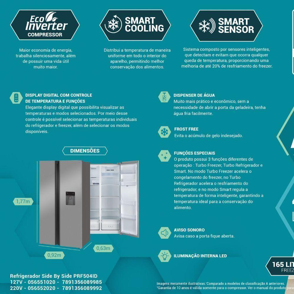 Geladeira Philco Frost Free Inverter Side By Side 486L Prf504id Inox 220VMuita Tecnologia e Economia de EnergiaRefrigerador Side by Side PRF504IDMuita qualidade, com muita economiaEste produto tem a melhor classificação energética disponível no mercado: A+++Eco InverterCompressorEste Refrigerador Philco possui compressor Inverter. Esta tecnologia trabalha de maneira muito mais otimizada em relação a um compressor tradicionalEntendaUm compressor tradicional on/off oscila durante o funcionamento do refrigerador, ligando e desligando para manter a temperatura do aparelhoO EcoInverter da Philco, por sua vez, otimiza a potência do compressor durante seu funcionamento ? abertura e fechamento de portas e quantidade de alimentos em seu interior ? por exemplo. Dessa forma, o Refrigerador EcoInverter Philco não causa picos de energia prejudiciais, mantém a temperatura estável, garante menor ruído e consome menos energiaSide by SideCom visual moderno e elegante que agrega muito mais requinte para a cozinha, proporcionando o aproveitamento inteligente de espaço colocando freezer e refrigerador lado a lado, valorizando o espaço vertical e garantindo alta capacidadeSmart CoolingDistribui a temperatura de maneira uniforme em todo o interior do aparelho, permitindo melhor conservação dos alimentosSmart SensorSistema composto por sensores inteligentes que evitam o aumento de temperatura no interior do refrigerador e freezerDispenser de ÁguaBeba Água sem precisar abrir a porta do refrigerador: muito mais praticidade e economia de energiaCARACTERÍSTICASCapacidade de 486L (321L no refrigerador e 165L no freezer)Classificação ?A? em eficiência energéticaSistema de refrigeração Frost FreeSide by Side (freezer na porta esquerda e refrigerador na porta direta)Dispenser de Água na porta com abastecimento manual (2,5L de capacidade)Painel touchControle de temperatura do freezer e refrigerador de forma independenteFreezer com temperaturas de -15°C a -22°CRefrigerador com temperaturas de 2 a 8°CFunções smart, turbo freezer e turbo refrigeradorAlarme de porta abertaPorta em aço com tratamento anti-corrosãoPrateleiras em vidro temperadoIluminação interna LEDDivisão do refrigerador: 5 prateleiras, 1 gaveta, 3 prateleiras de porta e reservatório de ÁguaDivisão do freezer: 5 prateleiras, 1 gaveta, 4 prateleiras de portaCompressor InverterAtenção:1. Verifique a voltagem correta para o seu equipamento. Grande parte dos eletrodomésticos no está disponível em duas voltagens: 110V ou 220V. Certifique-se qual a voltagem de sua residência e selecione o produto conforme essa especificação.2. Devido às normas da ABNT e às resoluções nº 13 de 2006, nº 2 de 2007 e nº 8 de 2009 do CONMETRO, os fabricantes estão mudando as tomadas para o padrão. Para utilizar este produto, será preciso adaptador ou a troca da tomada antiga. Não nos responsabilizamos por esta alteração.