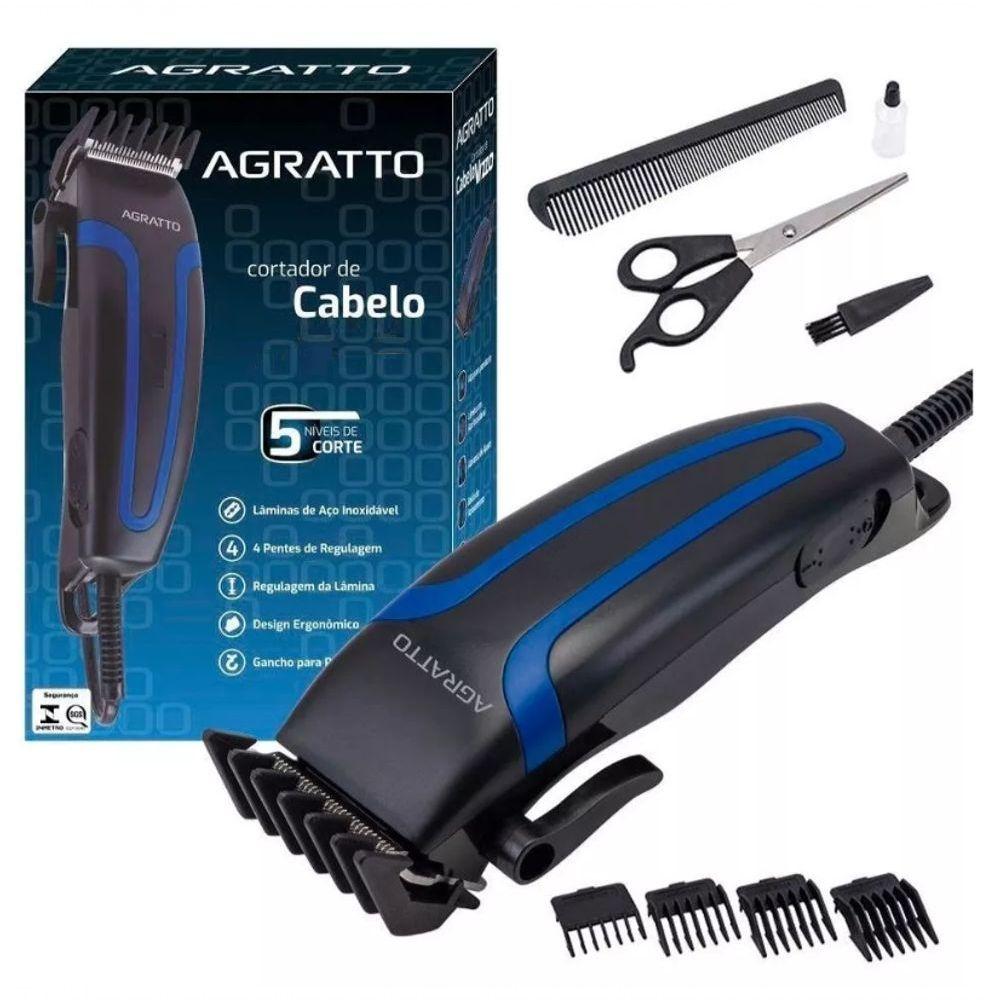 Maquina Cortar Cabelos Agratto Blueluxx 10w Com 4 Pentes 127vConheça o cortador De Cabelos Preto 10W Agratto. É fácil de usar, leve e ergonômico, com suas lâminas em aço inoxidável, possui alta precisão de corte e maior durabilidade. Ele também conta com um alavanca de regulagem de altura das lâminas com ajuste fácil e rápido. Veja por que o Cortador De Cabelos Preto 10W Agratto é o melhor do mercado. Possui Lâminas de aço inoxidável de Alta durabilidade e corte preciso. Acompanha 4 pentes de regulagem, sendo 4 pentes de regulagem de nível e ainda pode ser sem nenhum pente. Possui Alavanca de regulagem da lâmina, para regular a altura do corte da lâmina. Seu Design é ergonômico, a empunhadura é de fácil manuseio. Também conta com uma alça para pendurar, assim facilitando o uso. E não poderia faltar o Kit de beleza, que é composto por; pente, tesoura, escovinha de limpeza e óleo dos Pentes:Pente N1 - Aproximadamente 3mm de comprimentoPente N2 - Aproximadamente 6mm de comprimentoPente N3 - Aproximadamente 9mm de comprimentoPente N4 - Aproximadamente 12mm de comprimentoFicha Técnica:Potência: 10WComplementar: Lâminas de aço inoxidávelAlta durabilidade e corte preciso4 pentes de regulagem de nívelAlavanca de regulagem da lâminaDesign ergonômicoEmpunhadura de fácil manuseioAlça para pendurarAcompanha pente, tesoura, escovinha de limpeza e óleo lubrificanteAltura: 220mmLargura: 60mmComprimento: 145mmPeso: 0,390Kg