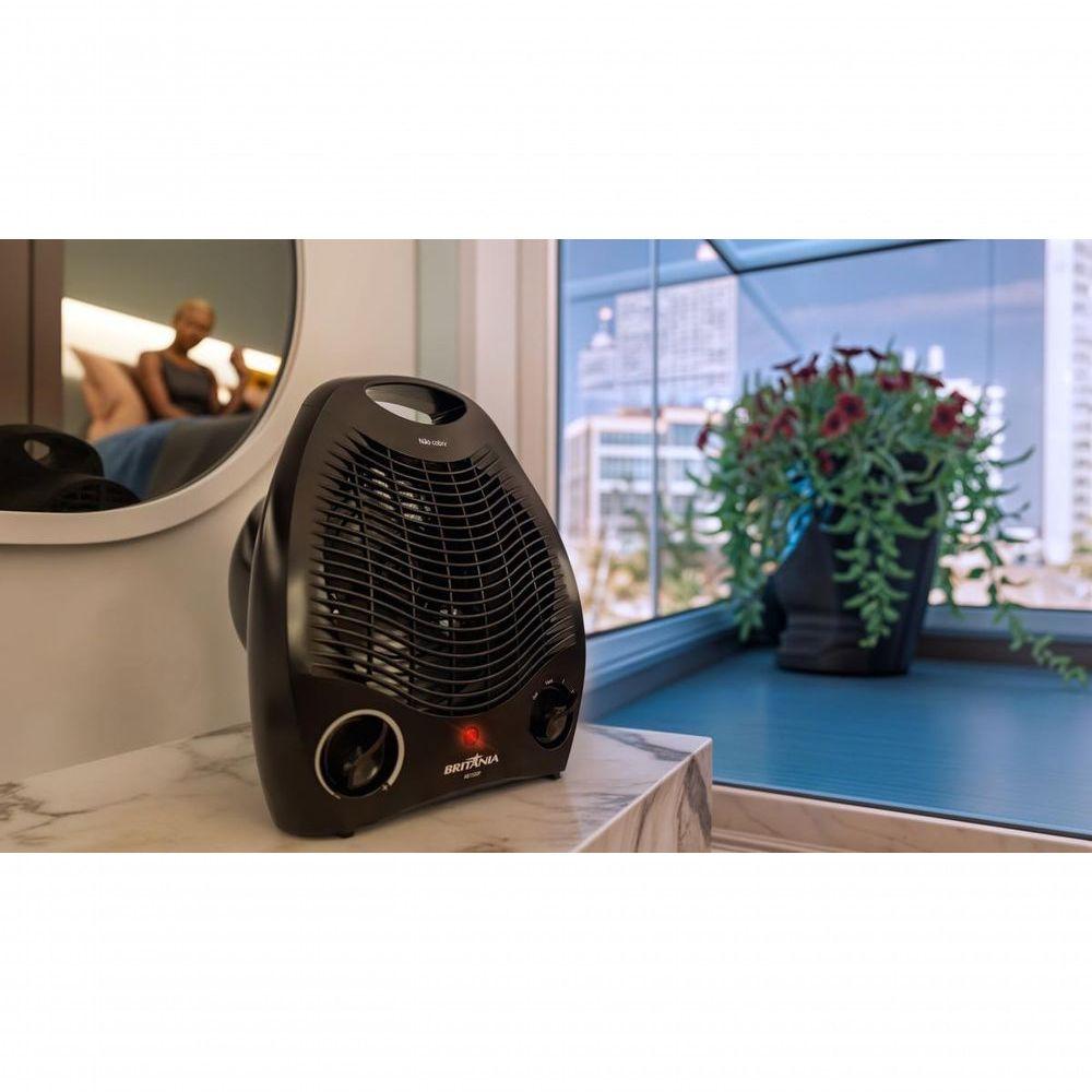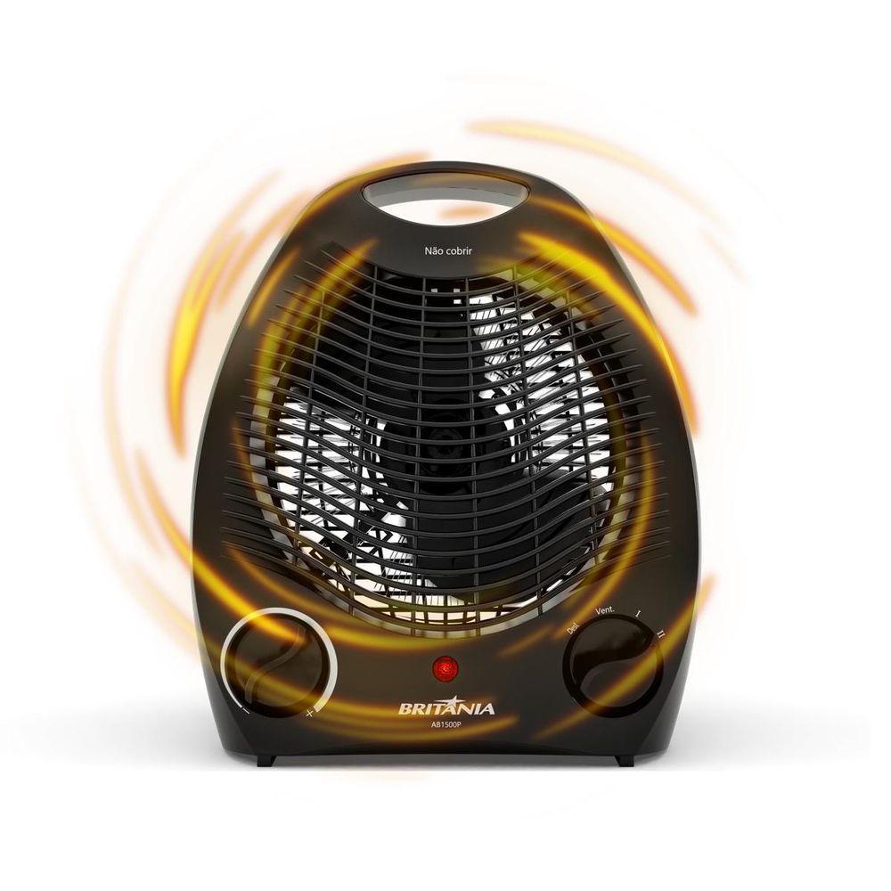 Aquecedor Britânia 2 Em 1 Com 3 Níveis De Potência AB1500P 110VSabe aquele conforto que faz toda diferença nos dias frios ou quentes? O Aquecedor Britânia 2 em 1 com 3 Níveis de Potência AB1500P entrega tudo isso em um só aparelho. Versátil e compacto, ele aquece e ventila com praticidade e segurança, deixando seu ambiente sempre na temperatura ideal.Com 3 níveis de potência sendo 2 para aquecer e 1 para ventilar, você ajusta o clima do espaço conforme sua necessidade. E mais: o controle de temperatura e a luz indicadora trazem praticidade total no uso diário, sem complicações.Pensado para o seu bem-estar, conta com desligamento automático para evitar superaquecimento, alça de transporte e cordão elétrico de 1,45m, facilitando o posicionamento em qualquer cômodo da casa.Ideal para quem busca conforto térmico em todas as estações, com a confiança e a qualidade da Britânia. Um produto leve, eficiente e essencial para sua rotina.- 2 em 1: aquecedor e ventilador- 3 níveis de potência (2 para aquecer e 1 para ventilar)- Controle de temperatura ajustável- Desligamento automático em caso de superaquecimento- Luz indicadora de funcionamento- Alça para transporte- Cordão elétrico com 1,45m- Potência: 1500W- Material: plástico e metal.Especificações Técnicas:Marca: BritâniaModelo: AB1500PCor: PretoPotência (W): 1500W Consumo (kW/h): 1,5Modo de aquecimento: ResistênciaControle de temperatura: 3 opçõesAltura do produto: 27 cmLargura do produto: 22,5 cmComprimento do produto: 13,5 cmPeso do produto: 0,934 kgAltura com embalagem: 26 cmLargura com embalagem: 22 cmComprimento com embalagem: 14 cmPeso com embalagem: 1,072 kgGarantia (meses): 12Observação: Somente faturamos para o nosso consumidor final, ou seja, não faturamos pedidos para CNPJ por este portal de vendas;