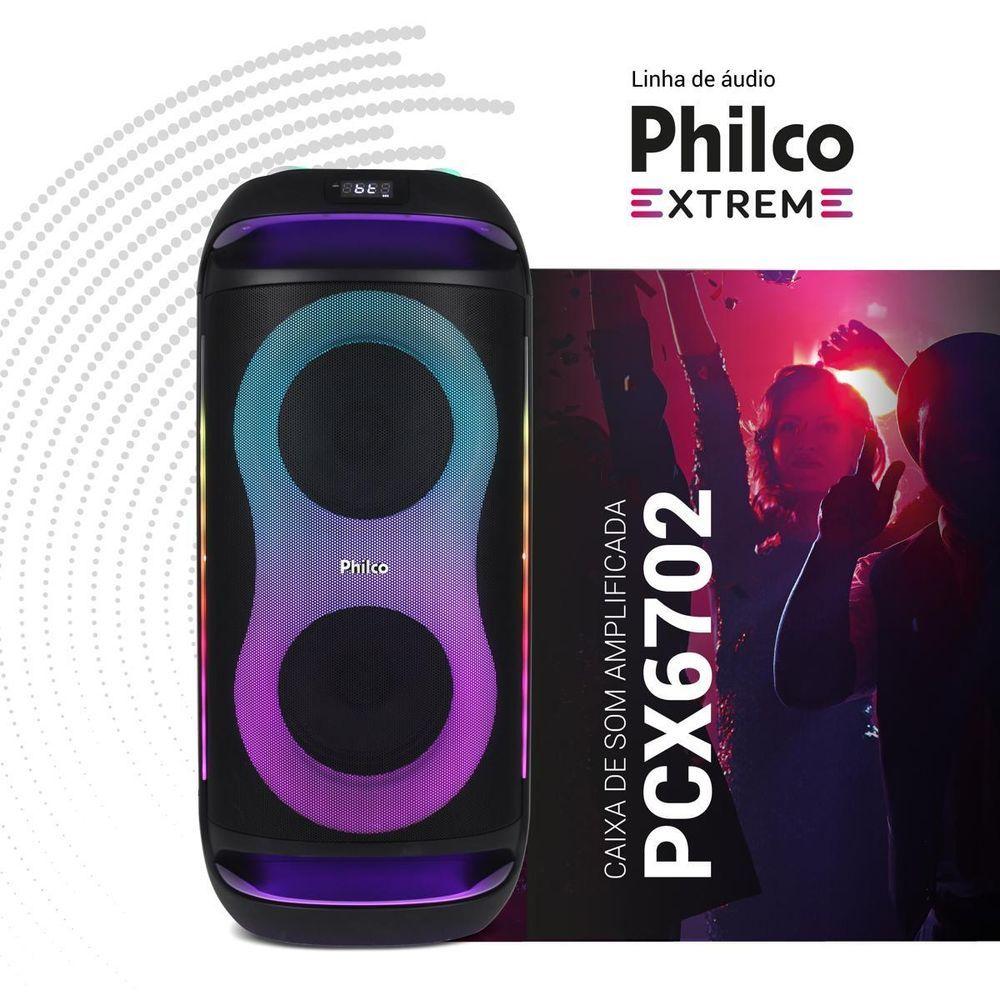 Caixa de Som Amplificada 800W Philco Ex Bass PCX6702 BivoltImagine animar suas festas com uma caixa de som que entrega potência e qualidade incomparáveis!A Caixa de Som Amplificada 800W Philco Ex Bass PCX6702 é a escolha ideal para quem busca uma experiência sonora superior. Com 800W de potência, esta é a caixa de som mais potente da categoria. Seus 2x woofers de 6,5” e tweeter garantem graves profundos e som cristalino, proporcionando uma experiência auditiva envolvente. Além disso, a tecnologia EX BASS intensifica os graves, fazendo você sentir cada batida. Desfrute de até 12 horas de bateria, garantindo que a festa continue sem interrupções. A conectividade Bluetooth V5.3 oferece a melhor experiência, permitindo que você controle a música de qualquer lugar. Já as flash lights com cores e luzes personalizáveis criam o ambiente perfeito para qualquer ocasião. Não perca a oportunidade de transformar suas festas! Tenha uma Caixa de Som Amplificada Philco PCX6702 e descubra como é fácil levar mais potência e diversão para sua rotina.- Entrada USB para Pendrive- Entrada auxiliar - Bluetooth v5.3- Philco Connection (TWS)- Entrada de Microfone- Entrada de Guitarra- Flash Light- Equalizador- 2 Woofer de 6,5”- Tweeter- Bateria Interna.Especificações Técnicas:Marca: PhilcoModos Flash Lights: SimModelo: PCX6702Potência (W): 800WAutonomia (horas): 12hConexões: Microfone Bluetooth Entrada Auxiliar USBFunções: Guitarra EqualizadorQuantidade de Alto Falantes: 2Quantidade de Tweeters: 1Acessórios: Adaptador de energiaAltura do produto: 65,5 cmLargura do produto: 28 cmComprimento do produto: 29 cmPeso do produto: 8,25 kgAltura com embalagem: 69 cmLargura com embalagem: 35,5 cmComprimento com embalagem: 33,8 cmPeso com embalagem: 9,6 kgHomologação Anatel: 47232416592Garantia (Dias): 360Observação: Somente faturamos para o nosso consumidor final, ou seja, não faturamos pedidos para CNPJ por este portal de vendas;