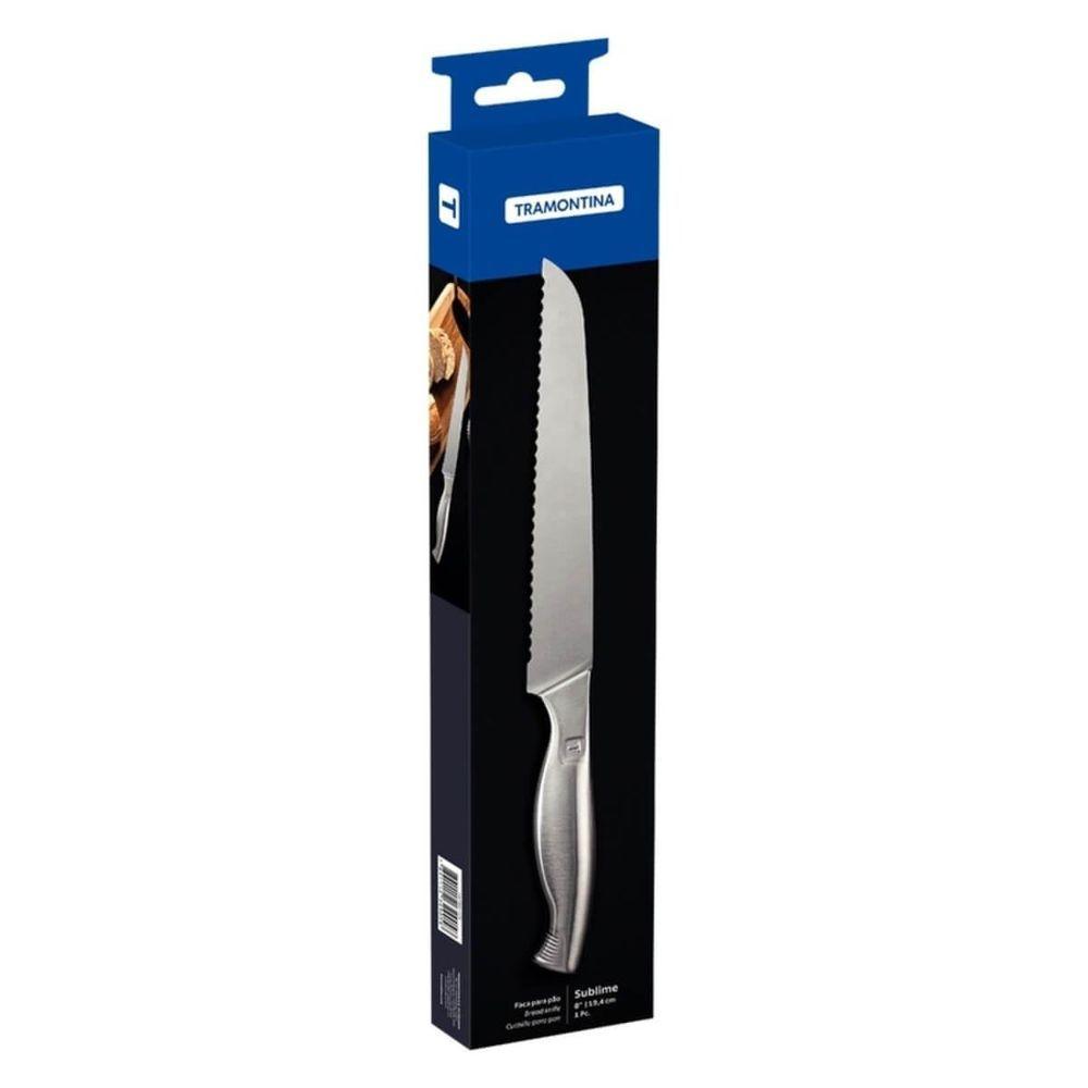 Faca Para Pão Tramontina Sublime Em Aço Inox 8Um item indispensável para seu café da manhã, a faca para pão Tramontina Sublime em aço inox 8 polegadas produzida totalmente em aço inox com lâmina serrilhada, irá cortar seu pão sem amassar e sem danificá-lo. Ela é uma faca diferenciada, com um design moderno e de linhas exclusivas, que deixa sua cozinha muito mais bonita e garante maior praticidade para seu dia a dia!Recomendações de Uso:Antes do Uso: Lave bem a peça e seque-a. Produto cortante e perfurante: tenha cuidado ao manusear e mantenha fora do alcance das crianças.Modo de Uso: Para maior durabilidade do produto recomenda-se secar bem antes de guardar, mesmo após lavagem em máquina. Recomenda-se o uso de tábuas de polipropileno ou madeira da Tramontina para maior durabilidade do fio da faca. Não é indicado o uso da faca para o corte de alimentos congelados. Para descarte dos produtos e embalagens siga as orientações de reciclagem vigentes.- Foto meramente ilustrativa.Informações Adicionais:- A lâmina serrilhada corta sem amassar o seu pão;- Pode ir à máquina de lavar louças facilitando seu dia a dia;- Lâmina e cabo de aço inox que mantém suas características garantindo durabilidade e higiene.