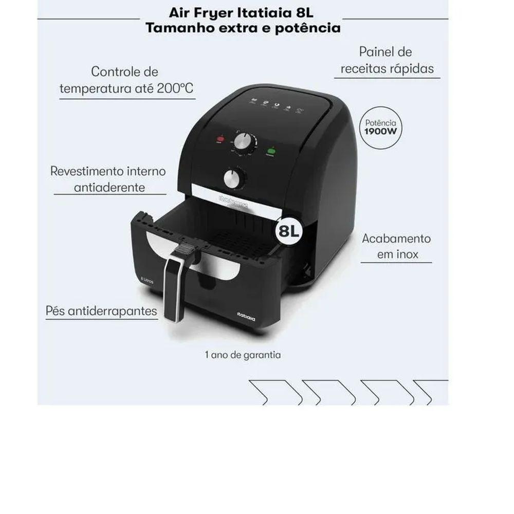 Fritadeira Air Fryer Itatiaia 8L 110VTransforme suas refeições com a Fritadeira Elétrica Air Fryer Itatiaia AFITA1003, que alia saúde, sabor e praticidade em um único aparelho. Com impressionantes 8 litros de capacidade, ela é ideal para famílias maiores ou para quem gosta de preparar porções generosas e variadas — perfeita para assar, fritar, gratinar e tostar alimentos sem o uso de óleo, garantindo refeições muito mais saudáveis e crocantes.Com tecnologia de circulação de ar quente em alta velocidade, a AFITA1003 proporciona textura crocante por fora e maciez por dentro, mantendo o sabor original dos alimentos. Sua interface simples e intuitiva facilita o uso no dia a dia, enquanto o design moderno valoriza sua bancada.Diferenciais do ProdutoCapacidade XXL – 8 Litros: ideal para grandes porçõesCozimento sem óleo: refeições mais leves e saudáveisCirculação de ar quente 360°: crocância e rapidez no preparoTemperatura ajustável: controle preciso para cada receitaTimer programável: praticidade e segurança no usoDesign moderno e robusto: combina com qualquer cozinhaCesto removível: fácil limpeza e manuseioIdeal Para PrepararBatatas fritas e snacks crocantesCarnes, frango e peixesPães, bolos e tortasLegumes assadosPetiscos para toda a famíliaA Air Fryer Itatiaia AFITA1003 é a escolha perfeita para quem busca praticidade, capacidade e alimentação mais saudável, sem abrir mão do sabor. Faça seus pratos favoritos com rapidez, economia e menos gordura — e surpreenda no dia a dia ou nos momentos especiais!