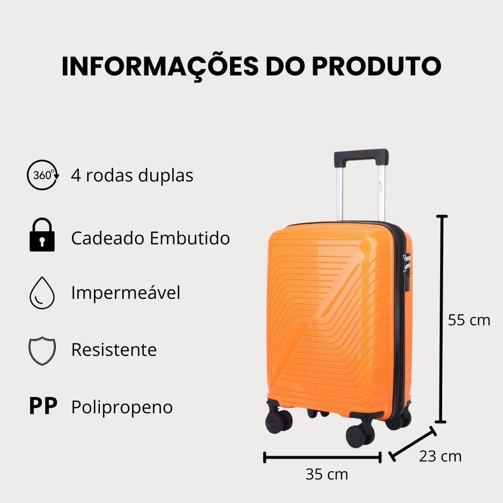 Mala De Bordo 10kg Viagem Zíper Expansível Em Polipropileno Rodinhas 360º Tsa - Rocha - Cruzeiro LaranjaMarca: CruzeiroModelo: RochaMaterial: Polipropileno inquebrável resistente à impactos e riscosTamanho: Mala de bordo 10kgZíper expansível: Sim, expansível em 30% de capacidadeIndicação: Ideal para levar à bordo em viagens de avião, ideal para viagens de carro, trem, ônibus e metrôCarrinho puxador: Embutido em alumínio antiferrugem com regulagens de alturaRodinhas: 4 rodas duplas com giro 360º para maior conforto no manuseioTipo de rodinhas: RemovíveisCadeado: Embutido com segredo numérico de 3 dígitos para maior Alça: Superior para maior conforto ao carregarFecho: Zíper duplo para maior praticidade e Impermeável: SimOrganização interna: Divisória e cinta elástica fixadoraBolso interno: Contém bolso interno na divisória da malaForro interno: Completamente forrada com poliéster resistentePés de apoio laterais: SimPossui TSA: SimEspecificações da mala (medidas dentro do padrão da ANAC)Medidas com expansor fechado: 55 cm x 35 cm x 23 cm - contando as rodas e alça (padrão ANAC)Medidas com expansor aberto: 55 cm x 35 cm x 27 cm - contando as rodas e alça (padrão ANAC)Capacidade em volume: 40 litros (expansor fechado) / 52 litros (expansor fechado)Peso: kgDiâmetro das rodinhas: 5 cmFabricada em polipropileno resistente, a mala garante durabilidade e proteção contra impactos.As rodinhas duplas 360º da mala proporcionam mobilidade suave e confortável, facilitando o deslocamento em qualquer superfície.O cadeado embutido oferece reforçada para seus pertences.A mala é ideal para quem busca leveza, organização e resistência em um só produto.Principais benefícios desse modelo: Capacidade para 10kg e divisória interna Material em polipropileno resistente e leve Rodinhas duplas giratórias 360º para máxima mobilidade Cadeado embutido para proteção dos seus itens Design compacto, ideal para cabine de aviãoPerguntas Frequentes1. Essa mala é aceita como bagagem de mão nas companhias aéreas?Sim. A mala segue o padrão ANAC, sendo aceita como bagagem de mão em todas as companhias aéreas nacionais e internacionais.2. Qual é o peso máximo permitido dentro da mala?O limite de peso varia conforme a companhia aérea, mas geralmente é de até 10kg para bagagem de bordo.3. Qual o material da mala?As malas são feitas em polipropileno de alta resistência, materiais leves, duráveis e que oferecem proteção contra impactos e arranhões.4. A mala tem cadeado?Sim. Possui cadeado embutido com segredo numérico, garantindo maior para sua bagagem.5. As rodinhas giram 360°?Sim. As rodinhas são multidirecionais 360°, o que facilita a movimentação em qualquer direção e garante praticidade no .6. A alça é resistente?Sim. Conta com alça telescópica em alumínio, além da alça fixa e lateral, garantindo conforto e resistência.7. Qual a capacidade da mala em litros?A capacidade é de 45L, ideal para viagens curtas ou de fim de semana.8. Essa mala risca fácil?Não. Os materiais utilizados possuem acabamento que ajuda a minimizar riscos e arranhões comuns durante viagens.9. Tem garantia?Sim. Todas as malas possuem garantia de , assegurando qualidade e tranquilidade para o cliente.10. Qual o prazo de ?O prazo de é de no máximo 1 dia útil, podendo ser no mesmo dia da compra.11. A embalagem é resistente?Sim. Todas as nossas malas são enviadas em caixas de papelão resistentes, assim sua mala será enviada e transportada com , evitando danos e chegando em perfeito estado.