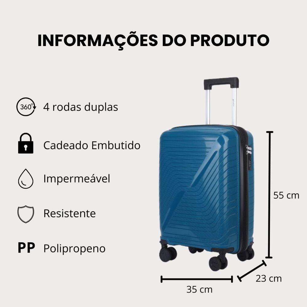 Mala De Bordo 10kg Viagem Zíper Expansível Em Polipropileno Rodinhas 360º Tsa - Rocha - Cruzeiro Azul PetróleoMarca: CruzeiroModelo: RochaMaterial: Polipropileno inquebrável resistente à impactos e riscosTamanho: Mala de bordo 10kgZíper expansível: Sim, expansível em 30% de capacidadeIndicação: Ideal para levar à bordo em viagens de avião, ideal para viagens de carro, trem, ônibus e metrôCarrinho puxador: Embutido em alumínio antiferrugem com regulagens de alturaRodinhas: 4 rodas duplas com giro 360º para maior conforto no manuseioTipo de rodinhas: RemovíveisCadeado: Embutido com segredo numérico de 3 dígitos para maior Alça: Superior para maior conforto ao carregarFecho: Zíper duplo para maior praticidade e Impermeável: SimOrganização interna: Divisória e cinta elástica fixadoraBolso interno: Contém bolso interno na divisória da malaForro interno: Completamente forrada com poliéster resistentePés de apoio laterais: SimPossui TSA: SimEspecificações da mala (medidas dentro do padrão da ANAC)Medidas com expansor fechado: 55 cm x 35 cm x 23 cm - contando as rodas e alça (padrão ANAC)Medidas com expansor aberto: 55 cm x 35 cm x 27 cm - contando as rodas e alça (padrão ANAC)Capacidade em volume: 40 litros (expansor fechado) / 52 litros (expansor fechado)Peso: kgDiâmetro das rodinhas: 5 cmFabricada em polipropileno resistente, a mala garante durabilidade e proteção contra impactos.As rodinhas duplas 360º da mala proporcionam mobilidade suave e confortável, facilitando o deslocamento em qualquer superfície.O cadeado embutido oferece reforçada para seus pertences.A mala é ideal para quem busca leveza, organização e resistência em um só produto.Principais benefícios desse modelo: Capacidade para 10kg e divisória interna Material em polipropileno resistente e leve Rodinhas duplas giratórias 360º para máxima mobilidade Cadeado embutido para proteção dos seus itens Design compacto, ideal para cabine de aviãoPerguntas Frequentes1. Essa mala é aceita como bagagem de mão nas companhias aéreas?Sim. A mala segue o padrão ANAC, sendo aceita como bagagem de mão em todas as companhias aéreas nacionais e internacionais.2. Qual é o peso máximo permitido dentro da mala?O limite de peso varia conforme a companhia aérea, mas geralmente é de até 10kg para bagagem de bordo.3. Qual o material da mala?As malas são feitas em polipropileno de alta resistência, materiais leves, duráveis e que oferecem proteção contra impactos e arranhões.4. A mala tem cadeado?Sim. Possui cadeado embutido com segredo numérico, garantindo maior para sua bagagem.5. As rodinhas giram 360°?Sim. As rodinhas são multidirecionais 360°, o que facilita a movimentação em qualquer direção e garante praticidade no .6. A alça é resistente?Sim. Conta com alça telescópica em alumínio, além da alça fixa e lateral, garantindo conforto e resistência.7. Qual a capacidade da mala em litros?A capacidade é de 45L, ideal para viagens curtas ou de fim de semana.8. Essa mala risca fácil?Não. Os materiais utilizados possuem acabamento que ajuda a minimizar riscos e arranhões comuns durante viagens.9. Tem garantia?Sim. Todas as malas possuem garantia de , assegurando qualidade e tranquilidade para o cliente.10. Qual o prazo de ?O prazo de é de no máximo 1 dia útil, podendo ser no mesmo dia da compra.11. A embalagem é resistente?Sim. Todas as nossas malas são enviadas em caixas de papelão resistentes, assim sua mala será enviada e transportada com , evitando danos e chegando em perfeito estado.
