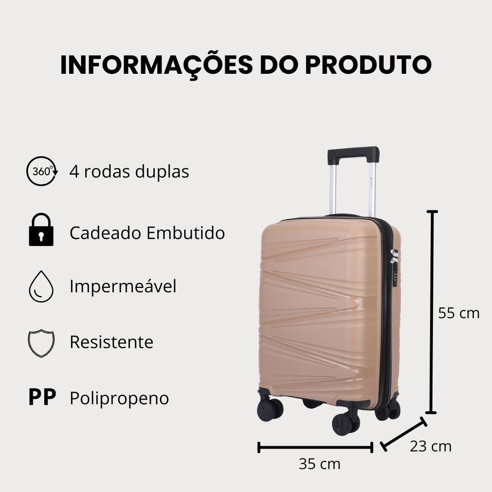Mala De Bordo 10kg Viagem Zíper Expansível Em Polipropileno Rodinhas 360º Tsa - Bocaiúva - Cruzeiro FendiMarca: CruzeiroModelo: BocaiúvaMaterial: Polipropileno inquebrável resistente à impactos e riscosTamanho: Mala de bordo 10kgZíper expansível: Sim, expansível em 30% de capacidadeIndicação: Ideal para levar à bordo em viagens de avião, ideal para viagens de carro, trem, ônibus e metrôCarrinho puxador: Embutido em alumínio antiferrugem com regulagens de alturaRodinhas: 4 rodas duplas com giro 360º para maior conforto no manuseioTipo de rodinhas: RemovíveisCadeado: Embutido com segredo numérico de 3 dígitos para maior Alça: Superior para maior conforto ao carregarFecho: Zíper duplo para maior praticidade e Impermeável: SimOrganização interna: Divisória e cinta elástica fixadoraBolso interno: Contém bolso interno na divisória da malaForro interno: Completamente forrada com poliéster resistentePés de apoio laterais: SimPossui TSA: SimEspecificações da mala (medidas dentro do padrão da ANAC)Medidas com expansor fechado: 55 cm x 35 cm x 23 cm - contando as rodas e alça (padrão ANAC)Medidas com expansor aberto: 55 cm x 35 cm x 27 cm - contando as rodas e alça (padrão ANAC)Capacidade em volume: 40 litros (expansor fechado) / 52 litros (expansor fechado)Peso: kgDiâmetro das rodinhas: 5 cmFabricada em polipropileno resistente, a mala garante durabilidade e proteção contra impactos.As rodinhas duplas 360º da mala proporcionam mobilidade suave e confortável, facilitando o deslocamento em qualquer superfície.O cadeado embutido oferece reforçada para seus pertences.A mala é ideal para quem busca leveza, organização e resistência em um só produto.Principais benefícios desse modelo: Capacidade para 10kg e divisória interna Material em polipropileno resistente e leve Rodinhas duplas giratórias 360º para máxima mobilidade Cadeado embutido para proteção dos seus itens Design compacto, ideal para cabine de aviãoPerguntas Frequentes1. Essa mala é aceita como bagagem de mão nas companhias aéreas?Sim. A mala segue o padrão ANAC, sendo aceita como bagagem de mão em todas as companhias aéreas nacionais e internacionais.2. Qual é o peso máximo permitido dentro da mala?O limite de peso varia conforme a companhia aérea, mas geralmente é de até 10kg para bagagem de bordo.3. Qual o material da mala?As malas são feitas em polipropileno de alta resistência, materiais leves, duráveis e que oferecem proteção contra impactos e arranhões.4. A mala tem cadeado?Sim. Possui cadeado embutido com segredo numérico, garantindo maior para sua bagagem.5. As rodinhas giram 360°?Sim. As rodinhas são multidirecionais 360°, o que facilita a movimentação em qualquer direção e garante praticidade no .6. A alça é resistente?Sim. Conta com alça telescópica em alumínio, além da alça fixa e lateral, garantindo conforto e resistência.7. Qual a capacidade da mala em litros?A capacidade é de 45L, ideal para viagens curtas ou de fim de semana.8. Essa mala risca fácil?Não. Os materiais utilizados possuem acabamento que ajuda a minimizar riscos e arranhões comuns durante viagens.9. Tem garantia?Sim. Todas as malas possuem garantia de , assegurando qualidade e tranquilidade para o cliente.10. Qual o prazo de ?O prazo de é de no máximo 1 dia útil, podendo ser no mesmo dia da compra.11. A embalagem é resistente?Sim. Todas as nossas malas são enviadas em caixas de papelão resistentes, assim sua mala será enviada e transportada com , evitando danos e chegando em perfeito estado.