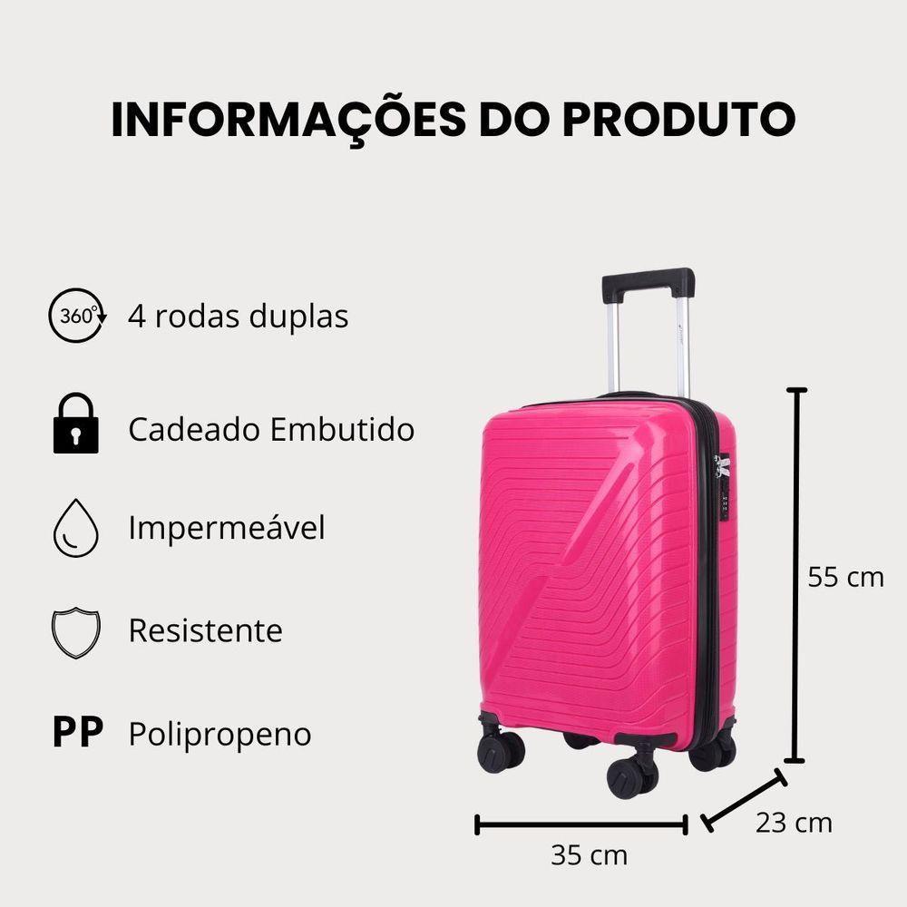 Mala De Bordo 10kg Viagem Zíper Expansível Em Polipropileno Rodinhas 360º Tsa - Rocha - Cruzeiro MarsalaMarca: CruzeiroModelo: RochaMaterial: Polipropileno inquebrável resistente à impactos e riscosTamanho: Mala de bordo 10kgZíper expansível: Sim, expansível em 30% de capacidadeIndicação: Ideal para levar à bordo em viagens de avião, ideal para viagens de carro, trem, ônibus e metrôCarrinho puxador: Embutido em alumínio antiferrugem com regulagens de alturaRodinhas: 4 rodas duplas com giro 360º para maior conforto no manuseioTipo de rodinhas: RemovíveisCadeado: Embutido com segredo numérico de 3 dígitos para maior Alça: Superior para maior conforto ao carregarFecho: Zíper duplo para maior praticidade e Impermeável: SimOrganização interna: Divisória e cinta elástica fixadoraBolso interno: Contém bolso interno na divisória da malaForro interno: Completamente forrada com poliéster resistentePés de apoio laterais: SimPossui TSA: SimEspecificações da mala (medidas dentro do padrão da ANAC)Medidas com expansor fechado: 55 cm x 35 cm x 23 cm - contando as rodas e alça (padrão ANAC)Medidas com expansor aberto: 55 cm x 35 cm x 27 cm - contando as rodas e alça (padrão ANAC)Capacidade em volume: 40 litros (expansor fechado) / 52 litros (expansor fechado)Peso: kgDiâmetro das rodinhas: 5 cmFabricada em polipropileno resistente, a mala garante durabilidade e proteção contra impactos.As rodinhas duplas 360º da mala proporcionam mobilidade suave e confortável, facilitando o deslocamento em qualquer superfície.O cadeado embutido oferece reforçada para seus pertences.A mala é ideal para quem busca leveza, organização e resistência em um só produto.Principais benefícios desse modelo: Capacidade para 10kg e divisória interna Material em polipropileno resistente e leve Rodinhas duplas giratórias 360º para máxima mobilidade Cadeado embutido para proteção dos seus itens Design compacto, ideal para cabine de aviãoPerguntas Frequentes1. Essa mala é aceita como bagagem de mão nas companhias aéreas?Sim. A mala segue o padrão ANAC, sendo aceita como bagagem de mão em todas as companhias aéreas nacionais e internacionais.2. Qual é o peso máximo permitido dentro da mala?O limite de peso varia conforme a companhia aérea, mas geralmente é de até 10kg para bagagem de bordo.3. Qual o material da mala?As malas são feitas em polipropileno de alta resistência, materiais leves, duráveis e que oferecem proteção contra impactos e arranhões.4. A mala tem cadeado?Sim. Possui cadeado embutido com segredo numérico, garantindo maior para sua bagagem.5. As rodinhas giram 360°?Sim. As rodinhas são multidirecionais 360°, o que facilita a movimentação em qualquer direção e garante praticidade no .6. A alça é resistente?Sim. Conta com alça telescópica em alumínio, além da alça fixa e lateral, garantindo conforto e resistência.7. Qual a capacidade da mala em litros?A capacidade é de 45L, ideal para viagens curtas ou de fim de semana.8. Essa mala risca fácil?Não. Os materiais utilizados possuem acabamento que ajuda a minimizar riscos e arranhões comuns durante viagens.9. Tem garantia?Sim. Todas as malas possuem garantia de , assegurando qualidade e tranquilidade para o cliente.10. Qual o prazo de ?O prazo de é de no máximo 1 dia útil, podendo ser no mesmo dia da compra.11. A embalagem é resistente?Sim. Todas as nossas malas são enviadas em caixas de papelão resistentes, assim sua mala será enviada e transportada com , evitando danos e chegando em perfeito estado.