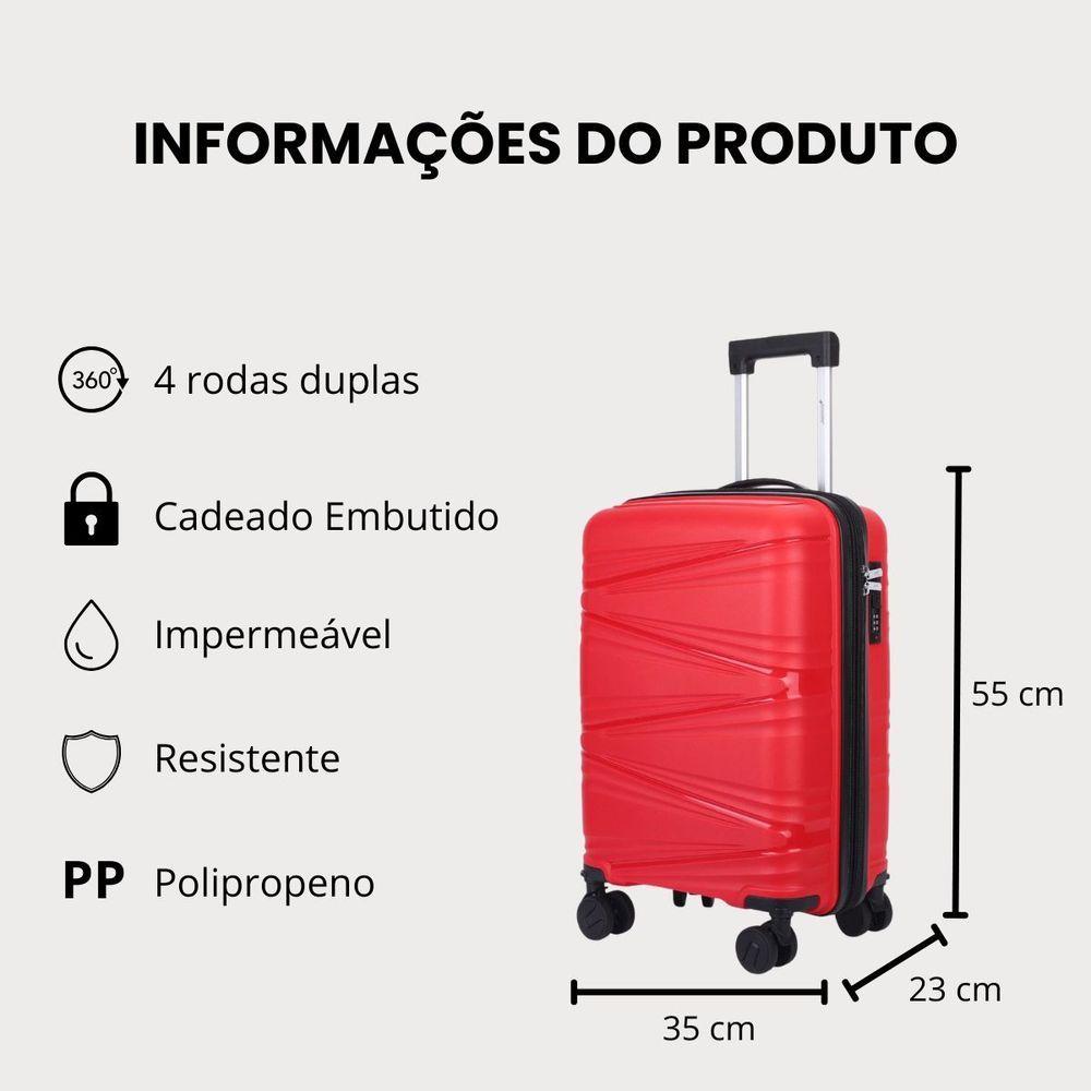 Mala De Bordo 10kg Viagem Zíper Expansível Em Polipropileno Rodinhas 360º Tsa - Bocaiúva - Cruzeiro VermelhoMarca: CruzeiroModelo: BocaiúvaMaterial: Polipropileno inquebrável resistente à impactos e riscosTamanho: Mala de bordo 10kgZíper expansível: Sim, expansível em 30% de capacidadeIndicação: Ideal para levar à bordo em viagens de avião, ideal para viagens de carro, trem, ônibus e metrôCarrinho puxador: Embutido em alumínio antiferrugem com regulagens de alturaRodinhas: 4 rodas duplas com giro 360º para maior conforto no manuseioTipo de rodinhas: RemovíveisCadeado: Embutido com segredo numérico de 3 dígitos para maior Alça: Superior para maior conforto ao carregarFecho: Zíper duplo para maior praticidade e Impermeável: SimOrganização interna: Divisória e cinta elástica fixadoraBolso interno: Contém bolso interno na divisória da malaForro interno: Completamente forrada com poliéster resistentePés de apoio laterais: SimPossui TSA: SimEspecificações da mala (medidas dentro do padrão da ANAC)Medidas com expansor fechado: 55 cm x 35 cm x 23 cm - contando as rodas e alça (padrão ANAC)Medidas com expansor aberto: 55 cm x 35 cm x 27 cm - contando as rodas e alça (padrão ANAC)Capacidade em volume: 40 litros (expansor fechado) / 52 litros (expansor fechado)Peso: kgDiâmetro das rodinhas: 5 cmFabricada em polipropileno resistente, a mala garante durabilidade e proteção contra impactos.As rodinhas duplas 360º da mala proporcionam mobilidade suave e confortável, facilitando o deslocamento em qualquer superfície.O cadeado embutido oferece reforçada para seus pertences.A mala é ideal para quem busca leveza, organização e resistência em um só produto.Principais benefícios desse modelo: Capacidade para 10kg e divisória interna Material em polipropileno resistente e leve Rodinhas duplas giratórias 360º para máxima mobilidade Cadeado embutido para proteção dos seus itens Design compacto, ideal para cabine de aviãoPerguntas Frequentes1. Essa mala é aceita como bagagem de mão nas companhias aéreas?Sim. A mala segue o padrão ANAC, sendo aceita como bagagem de mão em todas as companhias aéreas nacionais e internacionais.2. Qual é o peso máximo permitido dentro da mala?O limite de peso varia conforme a companhia aérea, mas geralmente é de até 10kg para bagagem de bordo.3. Qual o material da mala?As malas são feitas em polipropileno de alta resistência, materiais leves, duráveis e que oferecem proteção contra impactos e arranhões.4. A mala tem cadeado?Sim. Possui cadeado embutido com segredo numérico, garantindo maior para sua bagagem.5. As rodinhas giram 360°?Sim. As rodinhas são multidirecionais 360°, o que facilita a movimentação em qualquer direção e garante praticidade no .6. A alça é resistente?Sim. Conta com alça telescópica em alumínio, além da alça fixa e lateral, garantindo conforto e resistência.7. Qual a capacidade da mala em litros?A capacidade é de 45L, ideal para viagens curtas ou de fim de semana.8. Essa mala risca fácil?Não. Os materiais utilizados possuem acabamento que ajuda a minimizar riscos e arranhões comuns durante viagens.9. Tem garantia?Sim. Todas as malas possuem garantia de , assegurando qualidade e tranquilidade para o cliente.10. Qual o prazo de ?O prazo de é de no máximo 1 dia útil, podendo ser no mesmo dia da compra.11. A embalagem é resistente?Sim. Todas as nossas malas são enviadas em caixas de papelão resistentes, assim sua mala será enviada e transportada com , evitando danos e chegando em perfeito estado.