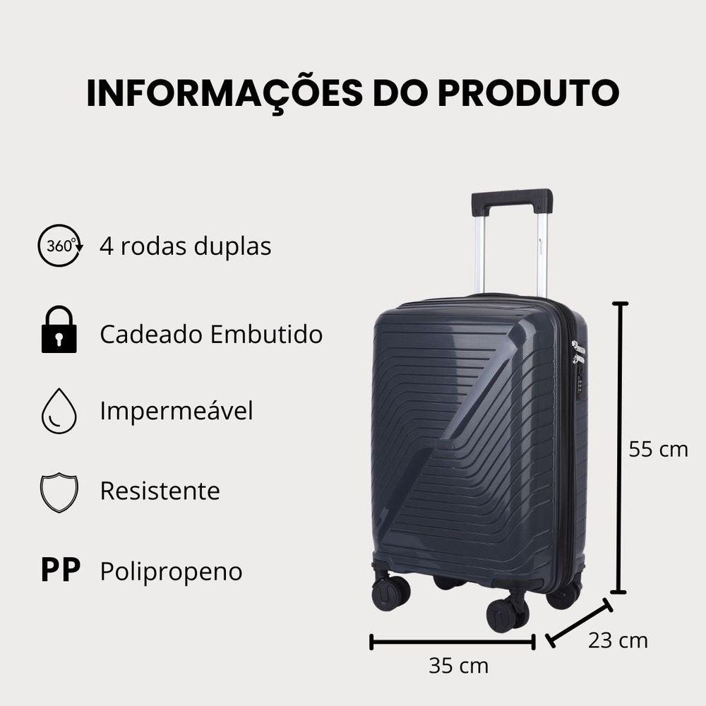 Mala De Bordo 10kg Viagem Zíper Expansível Em Polipropileno Rodinhas 360º Tsa - Rocha - Cruzeiro Marca: CruzeiroModelo: RochaMaterial: Polipropileno inquebrável resistente à impactos e riscosTamanho: Mala de bordo 10kgZíper expansível: Sim, expansível em 30% de capacidadeIndicação: Ideal para levar à bordo em viagens de avião, ideal para viagens de carro, trem, ônibus e metrôCarrinho puxador: Embutido em alumínio antiferrugem com regulagens de alturaRodinhas: 4 rodas duplas com giro 360º para maior conforto no manuseioTipo de rodinhas: RemovíveisCadeado: Embutido com segredo numérico de 3 dígitos para maior Alça: Superior para maior conforto ao carregarFecho: Zíper duplo para maior praticidade e Impermeável: SimOrganização interna: Divisória e cinta elástica fixadoraBolso interno: Contém bolso interno na divisória da malaForro interno: Completamente forrada com poliéster resistentePés de apoio laterais: SimPossui TSA: SimEspecificações da mala (medidas dentro do padrão da ANAC)Medidas com expansor fechado: 55 cm x 35 cm x 23 cm - contando as rodas e alça (padrão ANAC)Medidas com expansor aberto: 55 cm x 35 cm x 27 cm - contando as rodas e alça (padrão ANAC)Capacidade em volume: 40 litros (expansor fechado) / 52 litros (expansor fechado)Peso: kgDiâmetro das rodinhas: 5 cmFabricada em polipropileno resistente, a mala garante durabilidade e proteção contra impactos.As rodinhas duplas 360º da mala proporcionam mobilidade suave e confortável, facilitando o deslocamento em qualquer superfície.O cadeado embutido oferece reforçada para seus pertences.A mala é ideal para quem busca leveza, organização e resistência em um só produto.Principais benefícios desse modelo: Capacidade para 10kg e divisória interna Material em polipropileno resistente e leve Rodinhas duplas giratórias 360º para máxima mobilidade Cadeado embutido para proteção dos seus itens Design compacto, ideal para cabine de aviãoPerguntas Frequentes1. Essa mala é aceita como bagagem de mão nas companhias aéreas?Sim. A mala segue o padrão ANAC, sendo aceita como bagagem de mão em todas as companhias aéreas nacionais e internacionais.2. Qual é o peso máximo permitido dentro da mala?O limite de peso varia conforme a companhia aérea, mas geralmente é de até 10kg para bagagem de bordo.3. Qual o material da mala?As malas são feitas em polipropileno de alta resistência, materiais leves, duráveis e que oferecem proteção contra impactos e arranhões.4. A mala tem cadeado?Sim. Possui cadeado embutido com segredo numérico, garantindo maior para sua bagagem.5. As rodinhas giram 360°?Sim. As rodinhas são multidirecionais 360°, o que facilita a movimentação em qualquer direção e garante praticidade no .6. A alça é resistente?Sim. Conta com alça telescópica em alumínio, além da alça fixa e lateral, garantindo conforto e resistência.7. Qual a capacidade da mala em litros?A capacidade é de 45L, ideal para viagens curtas ou de fim de semana.8. Essa mala risca fácil?Não. Os materiais utilizados possuem acabamento que ajuda a minimizar riscos e arranhões comuns durante viagens.9. Tem garantia?Sim. Todas as malas possuem garantia de , assegurando qualidade e tranquilidade para o cliente.10. Qual o prazo de ?O prazo de é de no máximo 1 dia útil, podendo ser no mesmo dia da compra.11. A embalagem é resistente?Sim. Todas as nossas malas são enviadas em caixas de papelão resistentes, assim sua mala será enviada e transportada com , evitando danos e chegando em perfeito estado.