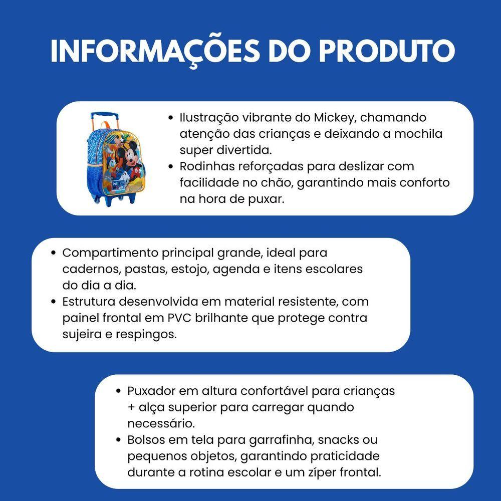 Mochila Mickey Mouse Disney Reforçada Resistente Com Rodinhas 16' - Mickey Mouse - Xeryus 11590A Mochila Mickey Mouse Disney Reforçada Resistente com Rodinhas 16' é a escolha perfeita para crianças cheias de energia que adoram praticidade e estilo. Com design vibrante e estampas coloridas do Mickey e seus amigos, essa mochila é ideal para a escola, passeios e viagens. As rodinhas resistentes e a alça retrátil garantem conforto e facilidade no transporte, evitando esforço nas costas. Seu material reforçado oferece durabilidade extra, suportando o uso diário intenso. Além disso, os bolsos laterais em tela ampliam a organização para garrafinhas e pequenos objetos. A Mochila Mickey Mouse une diversão e funcionalidade, conquistando pais e crianças que buscam qualidade e autenticidade em acessórios infantis.Principais atributos:- Tamanho 16' ideal para cadernos e livros escolares- Rodinhas resistentes com alça retrátil ergonômica- Material reforçado para maior durabilidade- Bolsos laterais em tela para fácil acesso a acessórios- Design oficial Disney com estampas vibrantes e alegresGaranta diversão e praticidade todos os dias com a Mochila Mickey Mouse Disney!Ficha Técnica: Marca: Xeryus Material: Poliéster Garantia: 03 meses Altura: 50 cm Largura: 30 cm Profundidade: 18 cm Capacidade em volume: 27 litros Peso líquido: 1200g Rodinhas: Sim Compartimentos: 1 compartimento Bolsos laterais para garrafinhas e sombrinhas: Sim (2)Informações da Mochila: 1 Bolso Principal e 2 Laterais para garrafinhas; Mochila de rodinhas e puxador resistente; Estampa Personalizada do Mickey Mouse;Dúvidas FrequentesQual o prazo de postagem?Nosso prazo de postagem é de no máximo 1 dia útil, podendo ser até no mesmo dia da confirmação da compra, dependendo do horário.Como o produto vem embalado?Nossos produtos são embalados com embalagens resistentes para que cheguem até você em perfeito estado.O produto possui garantia?Sim, todos os nossos produtos são originais e possuem garantia de fabricação de no mínimo 90 dias, conforme previsto no código de defesa do consumidor.