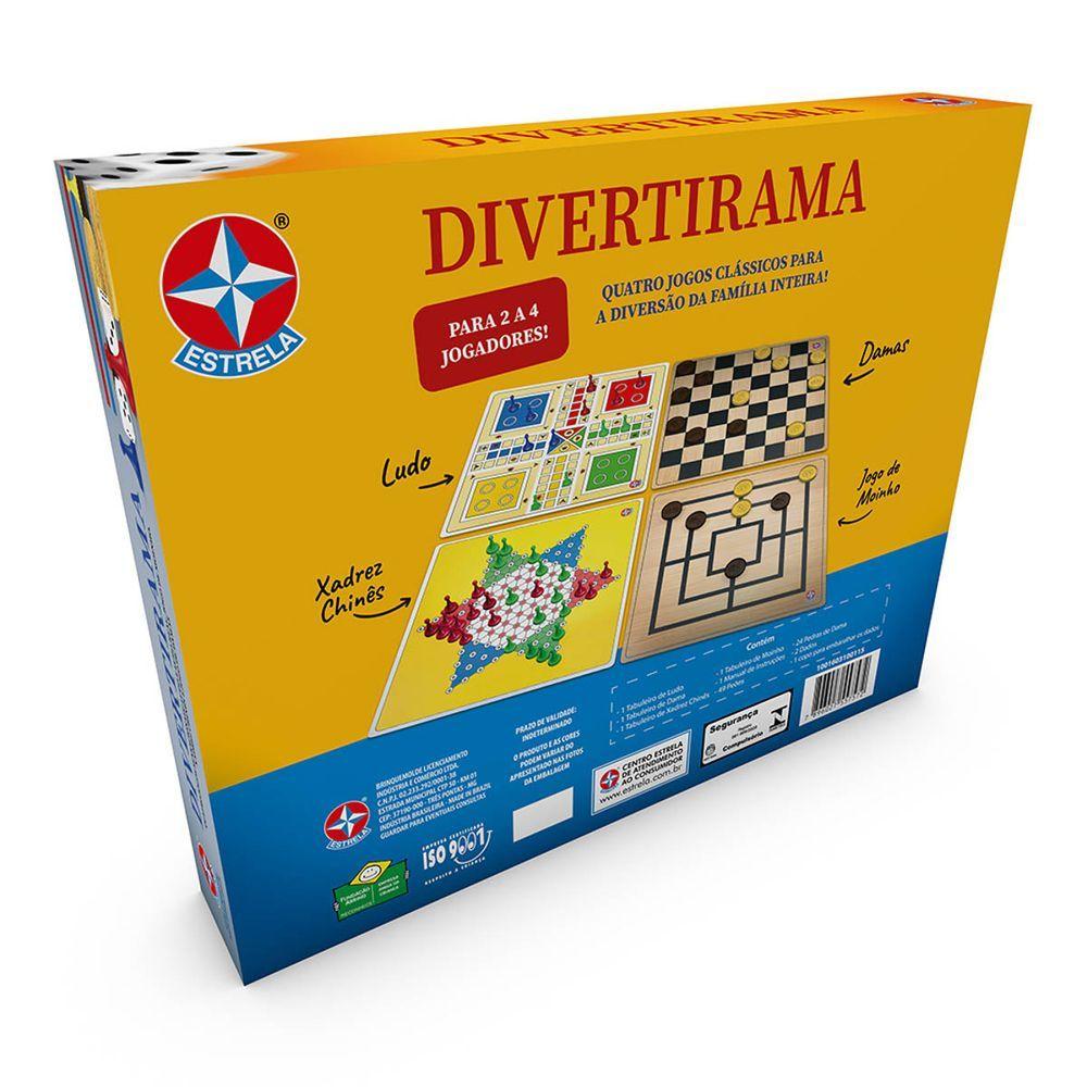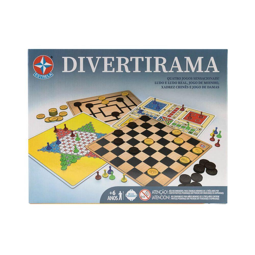 Jogo Divertirama - Brinquedos EstrelaNo jogo Divertirama, você tem acesso a quatro jogos sensacionais: Ludo e Ludo Real, Jogo do Moinho, Xadrez Chinês e Jogo de Damas! Diversão para a família inteira. Idade Recomendada: A partir de 6 anos | Material: Cartonado e plástico | Quantidade de Peças: 4 tabuleiros, 49 peões, 2 dados, 24 damas e manual de instruções | Código Inmetro: 001809/2020 000915/2019 | Formato: Físico | Nome do jogo de tabuleiro: Divertirama