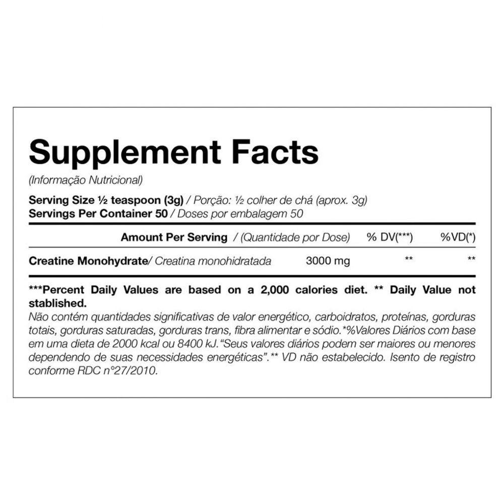 Creatine (300g) - Black SkullCreatine (300g)A creatina é um composto natural produzido pelo corpo e encontrado em carnes e peixes, armazenado principalmente nas fibras musculares. Ela desempenha um papel crucial ao fornecer energia para as células musculares durante exercícios de resistência e atividades de alta intensidade.A creatina monoidratada, um dos ativos mais amplamente estudados pela ciência recentemente, oferece benefícios não apenas para atletas, mas também para a saúde em geral. Além de melhorar o desempenho esportivo, demonstrou ter propriedades anti-inflamatórias, contribuindo para uma melhor saúde global. Além disso, atua como um neuroprotetor, reduzindo a demanda cerebral por oxigênio e, assim, melhorando o desempenho cognitivo.A CREATINE da BLACKSKULL USA é um produto de alta qualidade composto exclusivamente por creatina monoidratada. Ela é projetada para proporcionar energia adicional, melhorando o desempenho físico durante exercícios de curta duração e alta intensidade, o que pode favorecer o crescimento muscular e o aumento da resistência física.Benefícios: Maior força e explosão durante os treinos; Aumenta significativamente a energia muscular; Acelera a Hipertrofia Muscular; Estimula a hidratação muscular.Informação Nutricional Creatine (300g) - Black SkullPorção de aprox. 3g (1 dosador)Quantidade por porção%VD(*)Creatina3000mg * % Valores Diários com base em uma dieta de 2.000Kcal ou 8400kJ. Seus valores diários podem ser maiores ou menores dependendo das suas necessidades energéticas. Obs: Pode haver pequenas variações na informação nutricional, de acordo com o sabor. ** VD não estabelecido.