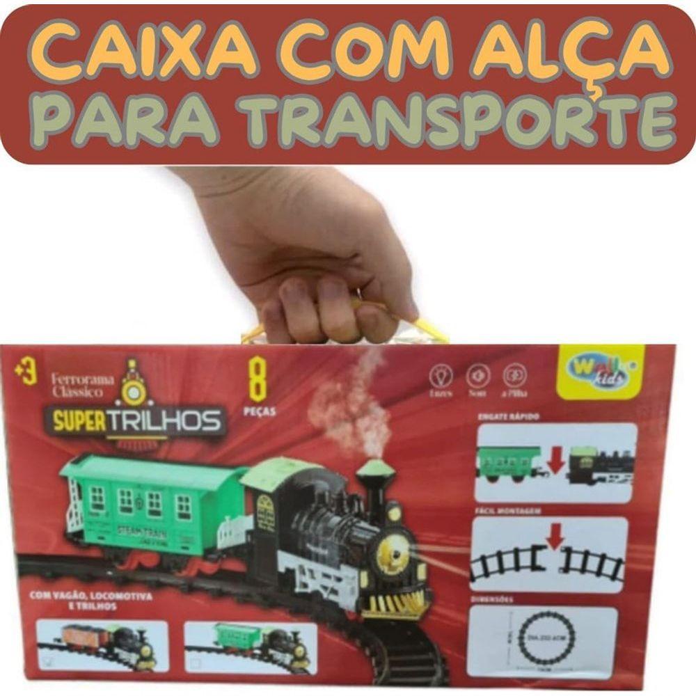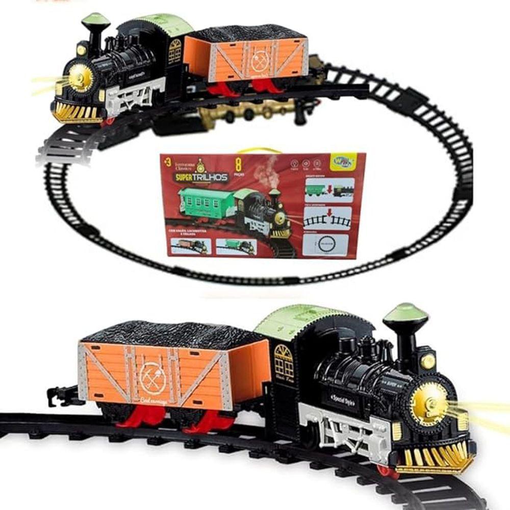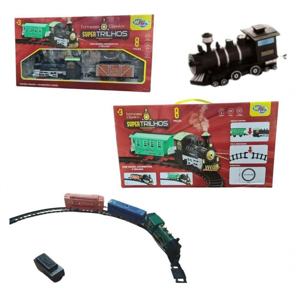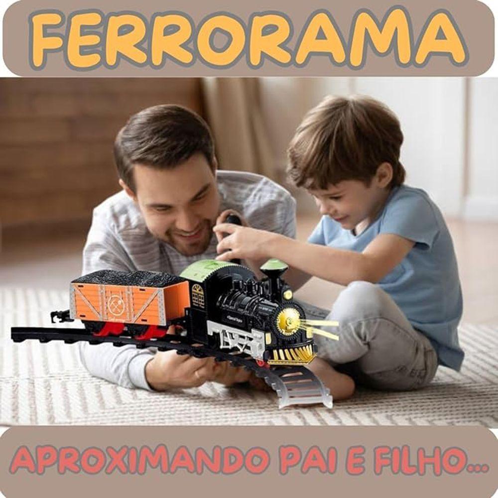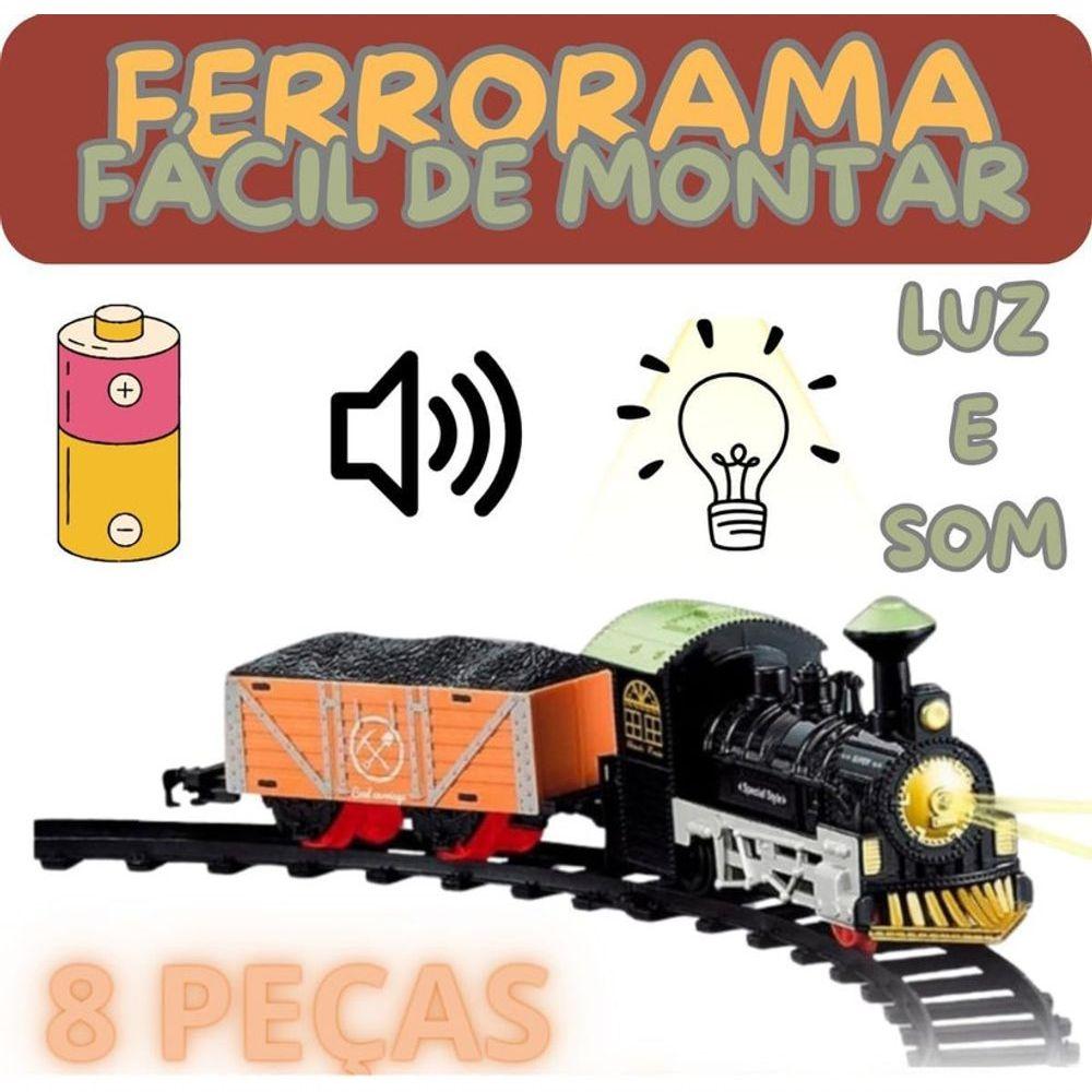 Ferrorama Clássico Super Trilhos, Vagão, Locomotiva Luzes SoFerrorama Clássico com Luzes e Sons | 8 Peças | Trilhos, Vagão e LocomotivaDesperte a imaginação das crianças com o Ferrorama Clássico com Luzes e Sons. Um brinquedo nostálgico e encantador que proporciona horas de diversão educativa. Composto por locomotiva, vagão e 6 trilhos, este kit transforma qualquer ambiente em uma verdadeira estação ferroviária.Destaques do Produto:Experiência Realista: A locomotiva percorre os trilhos emitindo sons autênticos de trem e luzes brilhantes, tornando a brincadeira muito mais envolvente.Fácil de Montar: O kit acompanha 6 trilhos, permitindo montar um circuito completo com facilidade.Estimula a Criatividade: Ideal para desenvolver coordenação motora, raciocínio espacial e imaginação.Brinquedo Clássico: Perfeito para presentear e reviver a magia dos trens em casa.Especificações Técnicas:Idade recomendada: A partir de 2 anosDimensões do produto (aprox.): 6 cm x 41 cm x 21 cmPeso: 410 gComposição: Plástico + Componentes eletrônicosFunciona com pilhas (não inclusas)Conteúdo da Embalagem:1 Locomotiva1 Vagão6 TrilhosManual de instruçõesLeve a magia dos trilhos para dentro de casa!Transforme o dia das crianças com um brinquedo clássico, educativo e cheio de diversão.Adicione ao carrinho agora e embarque nessa aventura com o Ferrorama!Envio rápido e seguro | Produto com qualidade garantida