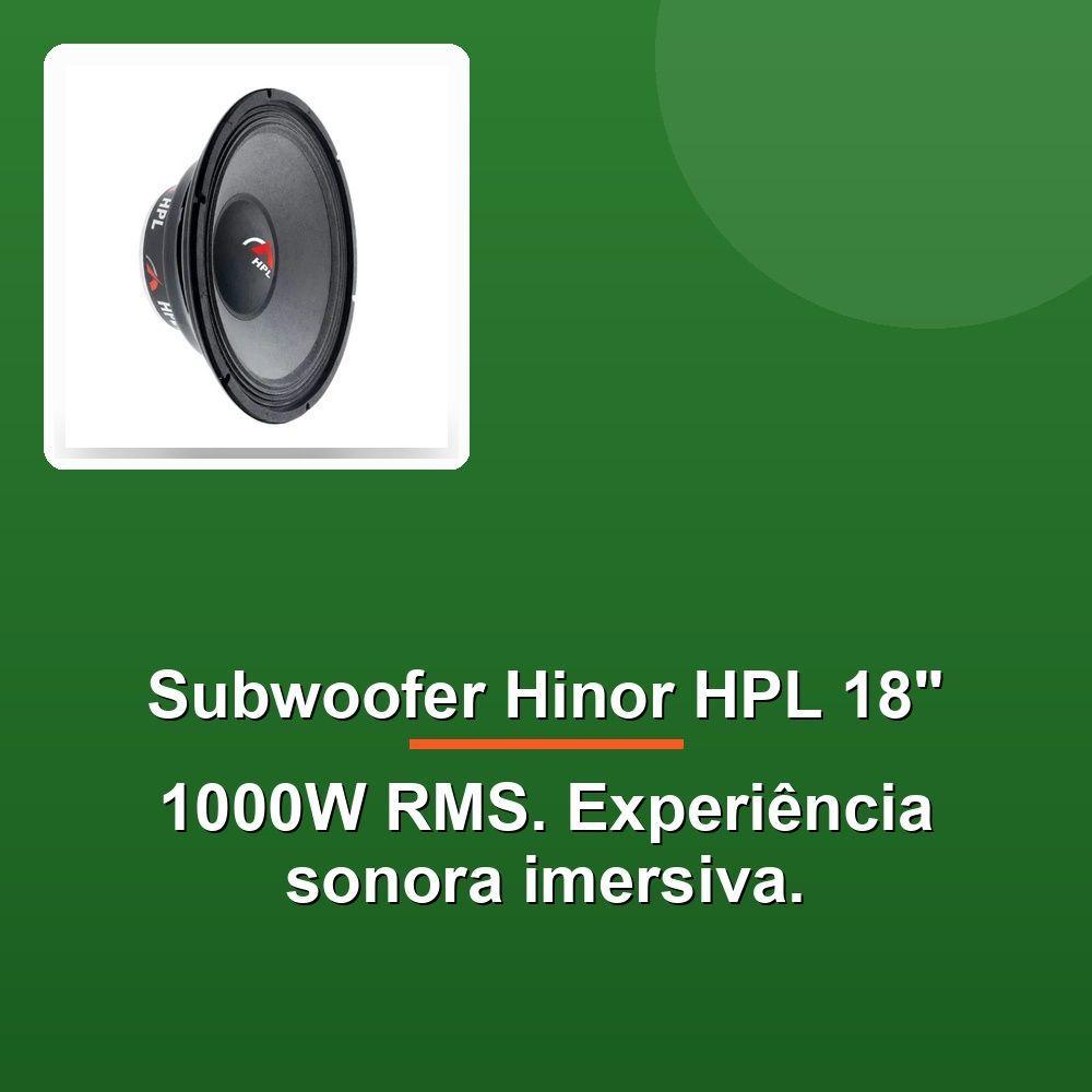 Alto Falante Hinor Hpl 18" 1000w Rms 8r SubwooferO Alto Falante Hinor HPL 18 1000W RMS 8R Subwoofer é a escolha perfeita para os amantes de som automotivo que buscam potência e qualidade em seus sistemas. Com impressionantes 1000 watts de potência RMS, este subwoofer garante desempenho robusto e sonoridade excepcional, entregando graves intensos e profundidade sonora que vão transformar sua experiência de áudio. A Hinor, marca reconhecida por sua excelência e inovação no mercado de equipamentos sonoros, traz nesta linha de alto-falantes um produto que une durabilidade e eficiência.Construído com materiais de alta resistência, o Hinor HPL 18 foi projetado para suportar os desafios do uso contínuo, garantindo longevidade e confiabilidade. O design robusto e eficiente do cone melhora a dispersão do som, fazendo com que as notas mais baixas sejam reproduzidas com precisão e clareza, sem distorções mesmo em volumes elevados. A bobina de 8 ohms proporciona flexibilidade no planejamento do sistema de som, facilitando a combinação com outros componentes.O diferencial deste subwoofer está em sua capacidade de alcançar frequências ultrabaixas, proporcionando uma envolvência sonora que coloca o ouvinte no centro da ação, quer você esteja ouvindo música ou assistindo a filmes. Além disso, a instalação é facilitada graças às suas dimensões padronizadas, permitindo ajustes em uma ampla variedade de veículos.Escolher o Alto Falante Hinor HPL é investir em um produto que eleva a experiência auditiva a um novo nível. Seja para entusiastas que gostam de sentir a potência de um bom som ou para quem busca qualidade impecável, este subwoofer é uma opção imbatível. Transforme sua viagem em uma experiência memorável com a qualidade acústica superior que só a Hinor pode proporcionar.O Alto Falante Hinor HPL 18 1000W RMS 8R Subwoofer é a escolha perfeita para os amantes de som automotivo que buscam potência e qualidade em seus sistemas. Com impressionantes 1000 watts de potência RMS, este subwoofer garante desempenho robusto e sonoridade excepcional, entregando graves intensos e profundidade sonora que vão transformar sua experiência de áudio. A Hinor, marca reconhecida por sua excelência e inovação no mercado de equipamentos sonoros, traz nesta linha de alto-falantes um produto que une durabilidade e eficiência.Construído com materiais de alta resistência, o Hinor HPL 18 foi projetado para suportar os desafios do uso contínuo, garantindo longevidade e confiabilidade. O design robusto e eficiente do cone melhora a dispersão do som, fazendo com que as notas mais baixas sejam reproduzidas com precisão e clareza, sem distorções mesmo em volumes elevados. A bobina de 8 ohms proporciona flexibilidade no planejamento do sistema de som, facilitando a combinação com outros componentes.O diferencial deste subwoofer está em sua capacidade de alcançar frequências ultrabaixas, proporcionando uma envolvência sonora que coloca o ouvinte no centro da ação, quer você esteja ouvindo música ou assistindo a filmes. Além disso, a instalação é facilitada graças às suas dimensões padronizadas, permitindo ajustes em uma ampla variedade de veículos.Escolher o Alto Falante Hinor HPL é investir em um produto que eleva a experiência auditiva a um novo nível. Seja para entusiastas que gostam de sentir a potência de um bom som ou para quem busca qualidade impecável, este subwoofer é uma opção imbatível. Transforme sua viagem em uma experiência memorável com a qualidade acústica superior que só a Hinor pode proporcionar.