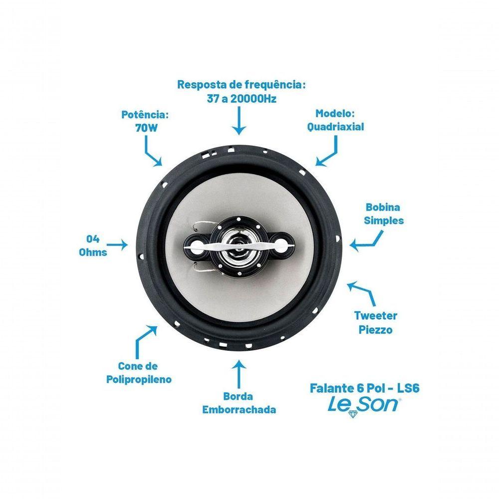 Kit Alto Falante Quadriaxial 6 Pol Ls6 140 WTransforme cada viagem em uma experiência sonora inesquecível com o Kit Alto Falante Quadriaxial 6 Polegadas Leson LS6. Cansado de um som automotivo sem vida e que não entrega a profundidade que suas músicas merecem? Prepare-se para uma revolução sonora que eleva o padrão de áudio do seu veículo a um novo patamar de excelência.Cada alto-falante Leson LS6 entrega uma potência impressionante de 70 Watts RMS, totalizando 140 Watts de pura energia para o seu sistema. Isso significa um som potente e envolvente, capaz de preencher o interior do seu carro com clareza e dinamismo. O grande diferencial está no seu design quadriaxial: essa tecnologia avançada garante uma reprodução de áudio incrivelmente rica e completa, com graves profundos que fazem você sentir a batida, médios nítidos que revelam cada detalhe instrumental e agudos cristalinos que dão brilho e vivacidade à sua playlist.A Leson prioriza a durabilidade e a performance a longo prazo, mesmo em ambientes desafiadores. Por isso, o LS6 é construído com componentes de alta qualidade, como o cone de polipropileno (PP), que oferece resistência e leveza para uma resposta acústica superior, e o tweeter piezo, responsável por agudos claros e sem distorção. A bobina simples e a borda emborrachada trabalham em harmonia para proporcionar uma resposta precisa e suave, garantindo que cada nota seja reproduzida com fidelidade, seja qual for o seu estilo musical preferido.Projetado para se adequar perfeitamente às portas do seu veículo, o Kit Leson LS6 de 6 polegadas oferece uma instalação descomplicada, permitindo que você desfrute rapidamente de um áudio superior. Este kit é a escolha ideal para quem busca a combinação perfeita de qualidade sonora premium, potência e um preço acessível. Não apenas ouça sua música; sinta-a.Transforme cada viagem em uma experiência sonora inesquecível com o Kit Alto Falante Quadriaxial 6 Polegadas Leson LS6. Cansado de um som automotivo sem vida e que não entrega a profundidade que suas músicas merecem? Prepare-se para uma revolução sonora que eleva o padrão de áudio do seu veículo a um novo patamar de excelência.Cada alto-falante Leson LS6 entrega uma potência impressionante de 70 Watts RMS, totalizando 140 Watts de pura energia para o seu sistema. Isso significa um som potente e envolvente, capaz de preencher o interior do seu carro com clareza e dinamismo. O grande diferencial está no seu design quadriaxial: essa tecnologia avançada garante uma reprodução de áudio incrivelmente rica e completa, com graves profundos que fazem você sentir a batida, médios nítidos que revelam cada detalhe instrumental e agudos cristalinos que dão brilho e vivacidade à sua playlist.A Leson prioriza a durabilidade e a performance a longo prazo, mesmo em ambientes desafiadores. Por isso, o LS6 é construído com componentes de alta qualidade, como o cone de polipropileno (PP), que oferece resistência e leveza para uma resposta acústica superior, e o tweeter piezo, responsável por agudos claros e sem distorção. A bobina simples e a borda emborrachada trabalham em harmonia para proporcionar uma resposta precisa e suave, garantindo que cada nota seja reproduzida com fidelidade, seja qual for o seu estilo musical preferido.Projetado para se adequar perfeitamente às portas do seu veículo, o Kit Leson LS6 de 6 polegadas oferece uma instalação descomplicada, permitindo que você desfrute rapidamente de um áudio superior. Este kit é a escolha ideal para quem busca a combinação perfeita de qualidade sonora premium, potência e um preço acessível. Não apenas ouça sua música; sinta-a.