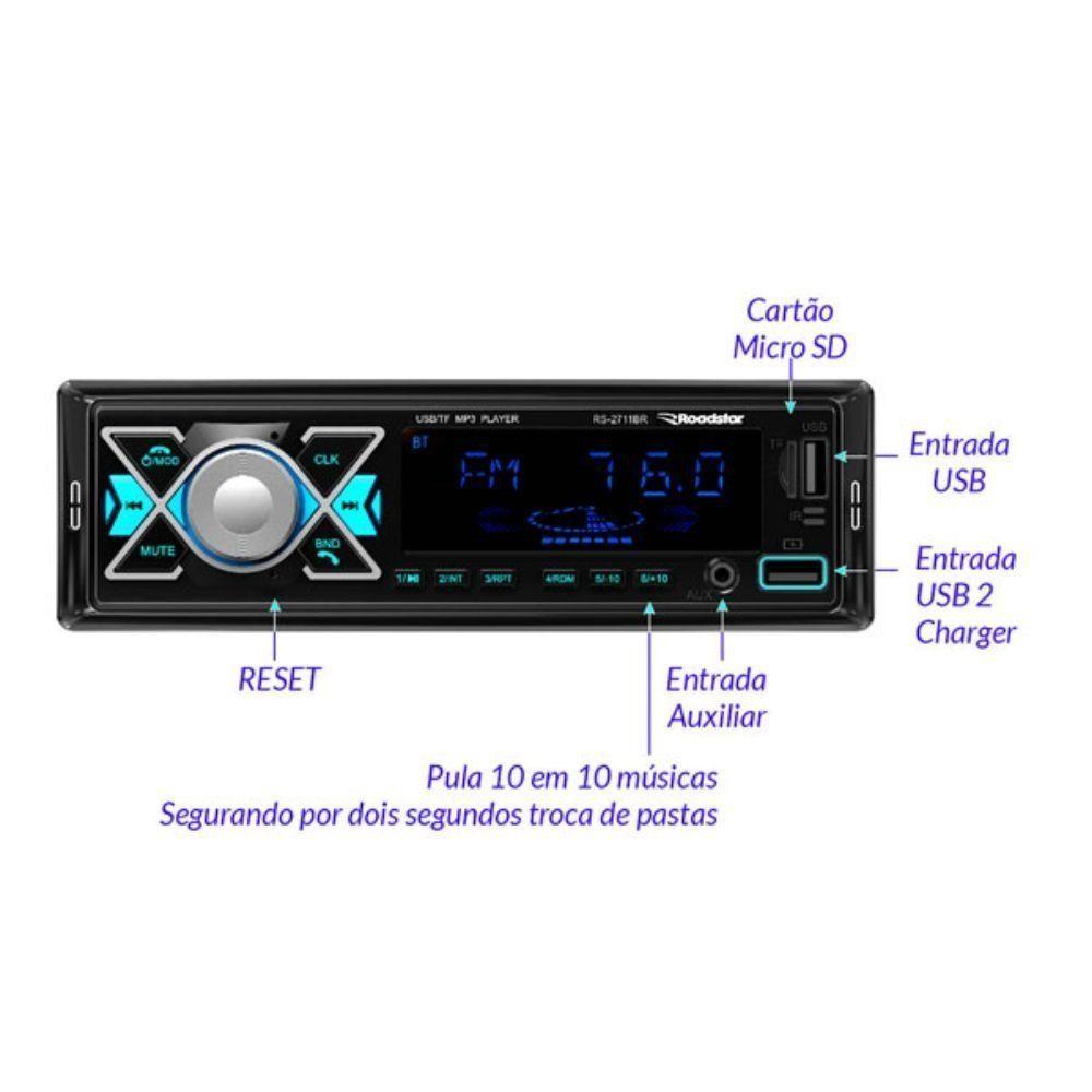 Auto Rádio Roadstar Rs2714br Plus BluetoothDescubra a praticidade e a tecnologia do Auto Rádio Roadstar Bluetooth RS-2714BR Plus, o companheiro ideal para suas viagens e trajetos diários. Com um design moderno e funcional, este auto rádio oferece tudo o que você precisa para transformar sua experiência ao volante em algo realmente especial. Uma das maiores novidades deste modelo é a presença de duas entradas USB frontais que proporcionam máxima conveniência: você pode recarregar seu celular enquanto escuta sua playlist favorita, garantindo praticidade e eficiência sem comprometer o seu tempo ou sua diversão.A conectividade é um dos grandes destaques do RS-2714BR Plus. Além de contar com conexão Bluetooth para você reproduzir músicas diretamente do seu smartphone, o auto rádio também possui entrada auxiliar frontal, entrada para cartão micro SD e duas entradas USB dedicadas: uma para recarregar dispositivos e outra para reproduzir arquivos de áudio a partir de um pen drive. Essa combinação de opções permite que você escolha a melhor forma de aproveitar suas músicas e podcasts, sem complicações.O painel fixo com botões iluminados em azul e o visor LED branco oferecem uma interface intuitiva e elegante, facilitando o uso mesmo em condições de pouca luz. O rádio FM integrado conta com memória para até 18 estações, garantindo que você tenha sempre ao alcance os seus canais favoritos. Para quem gosta de personalização sonora, os controles de graves, agudos e balanço dos canais permitem ajustar o áudio de acordo com suas preferências, tornando a experiência ainda mais imersiva.Equipado com 4 saídas RCA e potência de 55 Watts RMS por canal, o RS-2714BR Plus entrega qualidade sonora impressionante, ideal para quem busca um som potente e claro. Para maior comodidade, o modelo inclui controle remoto físico e também permite operação via aplicativo, oferecendo flexibilidade para ajustar o aparelho sem precisar tocar diretamente no painel.Descubra a praticidade e a tecnologia do Auto Rádio Roadstar Bluetooth RS-2714BR Plus, o companheiro ideal para suas viagens e trajetos diários. Com um design moderno e funcional, este auto rádio oferece tudo o que você precisa para transformar sua experiência ao volante em algo realmente especial. Uma das maiores novidades deste modelo é a presença de duas entradas USB frontais que proporcionam máxima conveniência: você pode recarregar seu celular enquanto escuta sua playlist favorita, garantindo praticidade e eficiência sem comprometer o seu tempo ou sua diversão.A conectividade é um dos grandes destaques do RS-2714BR Plus. Além de contar com conexão Bluetooth para você reproduzir músicas diretamente do seu smartphone, o auto rádio também possui entrada auxiliar frontal, entrada para cartão micro SD e duas entradas USB dedicadas: uma para recarregar dispositivos e outra para reproduzir arquivos de áudio a partir de um pen drive. Essa combinação de opções permite que você escolha a melhor forma de aproveitar suas músicas e podcasts, sem complicações.O painel fixo com botões iluminados em azul e o visor LED branco oferecem uma interface intuitiva e elegante, facilitando o uso mesmo em condições de pouca luz. O rádio FM integrado conta com memória para até 18 estações, garantindo que você tenha sempre ao alcance os seus canais favoritos. Para quem gosta de personalização sonora, os controles de graves, agudos e balanço dos canais permitem ajustar o áudio de acordo com suas preferências, tornando a experiência ainda mais imersiva.Equipado com 4 saídas RCA e potência de 55 Watts RMS por canal, o RS-2714BR Plus entrega qualidade sonora impressionante, ideal para quem busca um som potente e claro. Para maior comodidade, o modelo inclui controle remoto físico e também permite operação via aplicativo, oferecendo flexibilidade para ajustar o aparelho sem precisar tocar diretamente no painel.