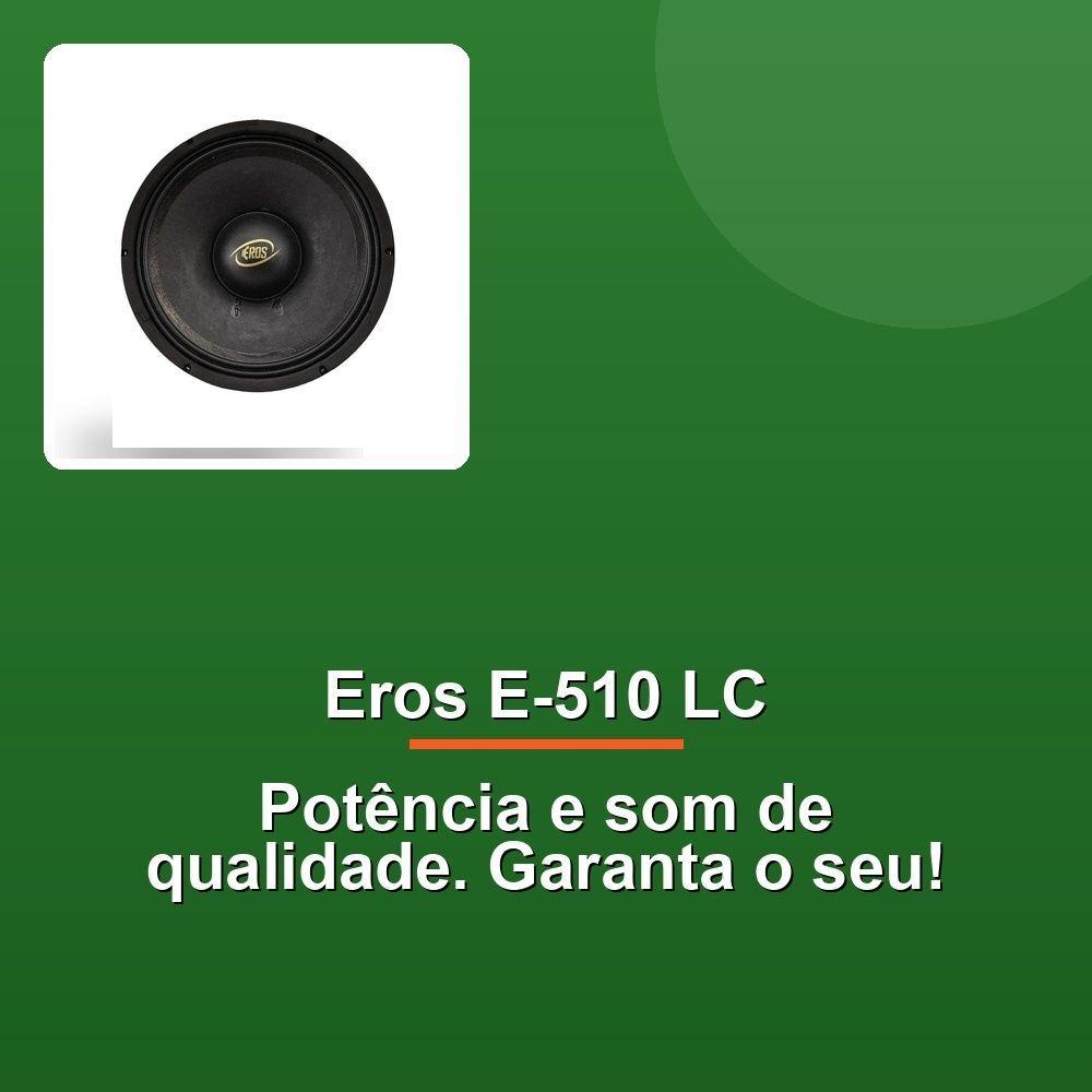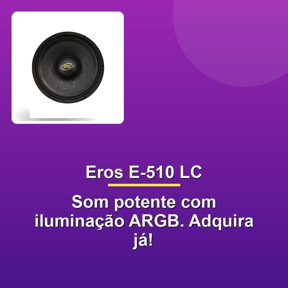 Alto Falante Eros E-510 Lc 10" 500w Rms 4rO Alto Falante Eros E-510 LC de 10 polegadas é a escolha perfeita para quem busca potência, qualidade sonora e durabilidade em um único produto. Com uma impressionante potência RMS de 500 W e capacidade de alcançar até 1.000 W em potência musical, este alto-falante entrega um desempenho robusto e confiável, ideal para sistemas de som automotivo e projetos de áudio profissionais. Sua resposta de frequência de 60 Hz a 4.500 Hz garante graves profundos e médios claros, proporcionando uma experiência sonora rica e envolvente.A sensibilidade de 94.6 dB/SPL, medida em Free-Air, assegura alta eficiência energética, permitindo que você obtenha um som potente mesmo em condições de baixa alimentação. Com uma impedância nominal de 4 ohms, o Eros E-510 LC é versátil e compatível com diversos amplificadores e sistemas de som. Seu cone de 10 polegadas, fabricado com materiais de alta qualidade, oferece excepcional resistência e precisão na reprodução sonora, enquanto a excursão máxima de 7 mm reduz distorções, entregando um áudio limpo e equilibrado.Projetado com atenção aos detalhes, este alto-falante possui uma bobina de 3 polegadas feita de fibra de vidro e fio CCAW, garantindo maior durabilidade e eficiência térmica, mesmo em altas demandas. A estrutura mecânica robusta inclui uma carcaça em alumínio e aço, além de ferrite de bário com densidade de fluxo de 10.400 Gauss, o que aumenta sua capacidade de lidar com altas potências sem comprometer a qualidade sonora.O Eros E-510 LC também se destaca pela sua engenharia avançada. Com características como frequência de ressonância de 77.6 Hz, volume equivalente de 18.9 L e parâmetros de qualidade acústica otimizados (Qms, Qes e Qts), ele é projetado para oferecer excelente desempenho em diferentes aplicações. Sua massa total de 44.063 g e área de cone de 0,037 m² contribuem para uma resposta sonora precisa e impactante, atendendo às expectativas dos mais exigentes amantes do áudio.O Alto Falante Eros E-510 LC de 10 polegadas é a escolha perfeita para quem busca potência, qualidade sonora e durabilidade em um único produto. Com uma impressionante potência RMS de 500 W e capacidade de alcançar até 1.000 W em potência musical, este alto-falante entrega um desempenho robusto e confiável, ideal para sistemas de som automotivo e projetos de áudio profissionais. Sua resposta de frequência de 60 Hz a 4.500 Hz garante graves profundos e médios claros, proporcionando uma experiência sonora rica e envolvente.A sensibilidade de 94.6 dB/SPL, medida em Free-Air, assegura alta eficiência energética, permitindo que você obtenha um som potente mesmo em condições de baixa alimentação. Com uma impedância nominal de 4 ohms, o Eros E-510 LC é versátil e compatível com diversos amplificadores e sistemas de som. Seu cone de 10 polegadas, fabricado com materiais de alta qualidade, oferece excepcional resistência e precisão na reprodução sonora, enquanto a excursão máxima de 7 mm reduz distorções, entregando um áudio limpo e equilibrado.Projetado com atenção aos detalhes, este alto-falante possui uma bobina de 3 polegadas feita de fibra de vidro e fio CCAW, garantindo maior durabilidade e eficiência térmica, mesmo em altas demandas. A estrutura mecânica robusta inclui uma carcaça em alumínio e aço, além de ferrite de bário com densidade de fluxo de 10.400 Gauss, o que aumenta sua capacidade de lidar com altas potências sem comprometer a qualidade sonora.O Eros E-510 LC também se destaca pela sua engenharia avançada. Com características como frequência de ressonância de 77.6 Hz, volume equivalente de 18.9 L e parâmetros de qualidade acústica otimizados (Qms, Qes e Qts), ele é projetado para oferecer excelente desempenho em diferentes aplicações. Sua massa total de 44.063 g e área de cone de 0,037 m² contribuem para uma resposta sonora precisa e impactante, atendendo às expectativas dos mais exigentes amantes do áudio.