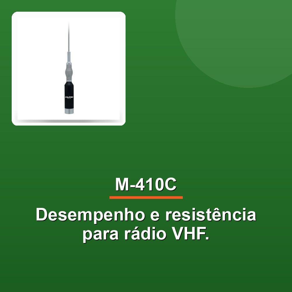 Antena Móvel Aquário M-410ccom Mola 5/8 De Onda Para Rádio VA Antena Móvel Aquário M-410C é a solução ideal para quem busca desempenho excepcional e resistência em operações de comunicação via rádio VHF. Com um comprimento de 150 cm e pesando apenas 280 g, esta antena 5/8 de onda oferece uma experiência de transmissão poderosa e eficiente, perfeita para diversos cenários.O diferencial da M-410C está na sua estrutura robusta com mola na base, que proporciona uma flexibilidade única. Essa característica permite que a antena supere desafios do ambiente, como áreas repletas de obstáculos altos, mantendo sua integridade e funcionalidade. Isso garante que a comunicação não seja interrompida, mesmo nas condições mais adversas, prolongando a vida útil do equipamento e evitando problemas de manutenção frequentes.Versatilidade é a palavra que define a M-410C, que atende a uma ampla gama de usuários, desde órgãos governamentais e empresas públicas até usinas de cana e empresas de segurança. Além disso, é amplamente utilizada em esportes motorizados, como stock car e rally dos sertões, além de ser a escolha preferida dos radioamadores que buscam confiabilidade e alcance superior.A instalação da Antena Móvel Aquário M-410C é simples e prática, graças a um manual de instalação detalhado que acompanha o produto. Este guia garante que você possa configurar a antena de forma rápida e eficiente, maximizando seu investimento e aproveitando ao máximo suas funcionalidades.Invista na Antena Móvel Aquário M-410C para garantir comunicações claras e precisas, mesmo nos ambientes mais desafiadores. Combinando qualidade, durabilidade e desempenho, esta antena é uma escolha segura para profissionais que não podem se dar ao luxo de falhar.A Antena Móvel Aquário M-410C é a solução ideal para quem busca desempenho excepcional e resistência em operações de comunicação via rádio VHF. Com um comprimento de 150 cm e pesando apenas 280 g, esta antena 5/8 de onda oferece uma experiência de transmissão poderosa e eficiente, perfeita para diversos cenários.O diferencial da M-410C está na sua estrutura robusta com mola na base, que proporciona uma flexibilidade única. Essa característica permite que a antena supere desafios do ambiente, como áreas repletas de obstáculos altos, mantendo sua integridade e funcionalidade. Isso garante que a comunicação não seja interrompida, mesmo nas condições mais adversas, prolongando a vida útil do equipamento e evitando problemas de manutenção frequentes.Versatilidade é a palavra que define a M-410C, que atende a uma ampla gama de usuários, desde órgãos governamentais e empresas públicas até usinas de cana e empresas de segurança. Além disso, é amplamente utilizada em esportes motorizados, como stock car e rally dos sertões, além de ser a escolha preferida dos radioamadores que buscam confiabilidade e alcance superior.A instalação da Antena Móvel Aquário M-410C é simples e prática, graças a um manual de instalação detalhado que acompanha o produto. Este guia garante que você possa configurar a antena de forma rápida e eficiente, maximizando seu investimento e aproveitando ao máximo suas funcionalidades.Invista na Antena Móvel Aquário M-410C para garantir comunicações claras e precisas, mesmo nos ambientes mais desafiadores. Combinando qualidade, durabilidade e desempenho, esta antena é uma escolha segura para profissionais que não podem se dar ao luxo de falhar.