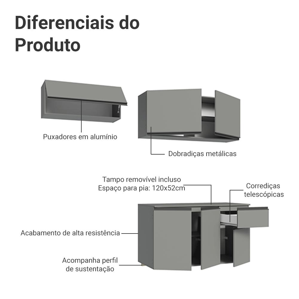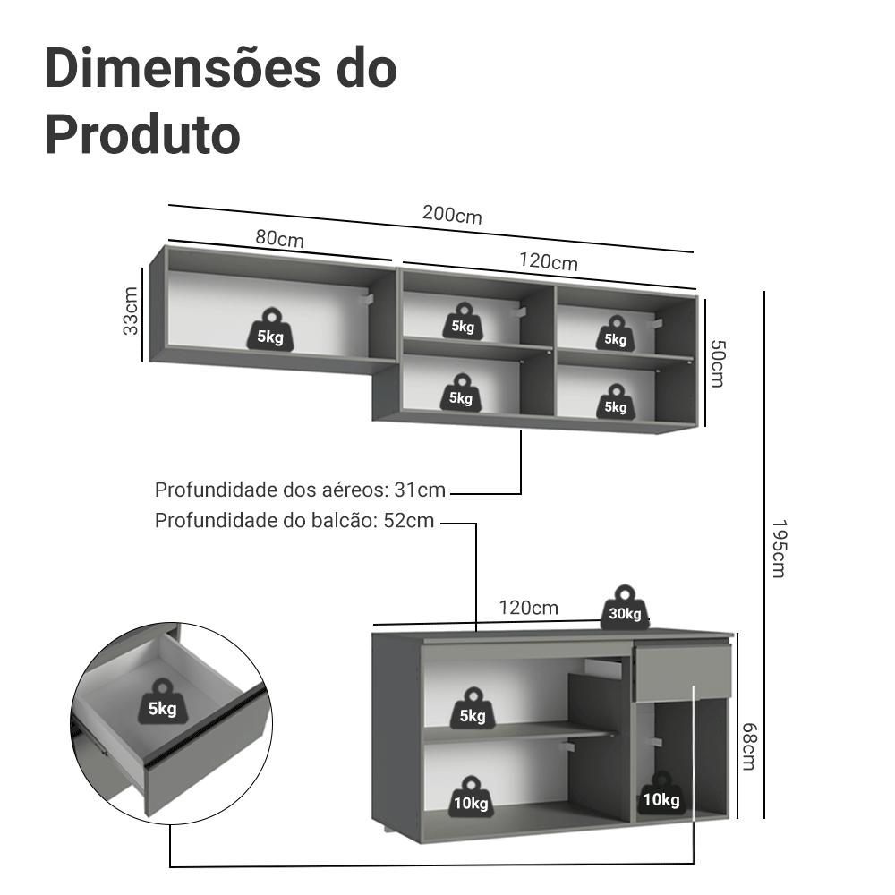 Procurando por um móvel com funcionalidade e estilo? Conheça o Armário de Cozinha da linha Nice da Madesa.Desenvolvido com alta tecnologia, inclui puxadores em alumínio na coloração titanium, corrediças telescópicas para abertura total das gavetas e dobradiças metálicas nas portas.Além de um design moderno, o formato suspenso desta cozinha facilita a limpeza, mantendo a parte inferior livre.O balcão do conjunto acompanha tampo, que pode ser removido ou ajustado para a instalação de um cooktop ou pia de inox/pedra, conforme sua necessidade.Para completar, o acabamento cinza de alta resistência segue as tendências do mercado atual de cozinhas.Medidas totais:- 195 cm de altura- 200 cm de largura- 52 cm de profundidade no balcão e 31 cm nos aéreosO que você recebe:- Um (1) Aéreo de 80 cm com uma (1) porta basculante- Um (1) Aéreo de 120 cm com duas (2) portas- Um (1) Balcão de 120 cm com duas (2) portas e tampo- Manual e ferragensCódigo do produto: XAGRNC2000043BÉ bom saber:- Imagens meramente ilustrativas- A Madesa não disponibiliza serviço de montagem- A cozinha não acompanha pés, deve ser instalada de forma suspensa, com fixação na paredeA Madesa se dedica à sustentabilidade com várias iniciativas: temos uma usina própria para gerar energia que abastece uma de nossas fábricas. Selecionamos nossos fornecedores, priorizando aqueles que possuem um compromisso com a sustentabilidade e proteção do meio ambiente. Todo o plástico utilizado no setor produtivo é proveniente de reciclagem e as suas sobras são encaminhadas ao fornecedor que os recicla. Também investimos no desenvolvimento contínuo de nossos colaboradores e em ações educacionais que beneficiem a comunidade.