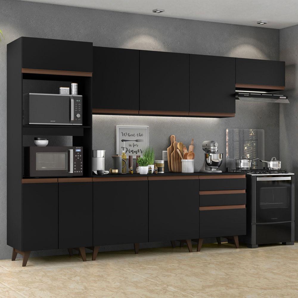Projetada com base em tendências atuais de design, a linha de Cozinhas Reims da Madesa é fabricada com materiais nobres, como dobradiças metálicas e puxadores embutidos em alumínio na coloração marrom. Os pés em madeira conferem mais resistência e trazem sofisticação ao móvel.Nesta versão, oferece muito espaço para organizar seus utensílios, louças e mantimentos. A torre ainda conta com dois nichos que podem ser usados para forno e micro-ondas. Além disso, o tampo do balcão maior pode ser removido para colocação de pia de inox ou pedra, no espaço de 120 x 52 cm.O acabamento da cozinha é preto, com exceção das partes internas das gavetas e das costas, que são brancas. O processo é feito em Pintura Poliéster ecológica de alta resistência, que dá maior destaque à tonalidade e protege o móvel.As medidas totais são: 320 cm de largura e 210 cm de altura. A profundidade é de 52 cm nos balcões e na torre e 31 cm nos aéreos.(Imagens meramente ilustrativas: os eletros e as decorações não acompanham o produto. É obrigatória a fixação da torre na parede.)Itens inclusos:- Uma (1) Torre de 70 cm com três (3) portas, sendo uma delas basculante- Um (1) Aéreo de 120 cm com duas (2) portas- Um (1) Balcão de 120 cm com duas (2) portas e tampo- Um (1) Aéreo de 60 cm com uma (1) porta- Um (1) Balcão de 60 cm com três (3) gavetas e tampo- Um (1) Aéreo de 70 cm com uma (1) porta basculanteCódigo do produto: XAGRRM320001D8Obs.: A Madesa não disponibiliza serviço de montagem. O produto segue com manual e todas as ferragens necessárias para a instalação.1 – O produto é novo ou usado?R.: Todos os produtos da Madesa são novos, enviados da nossa fábrica diretamente para as casas de nossos clientes.2 – O produto vem montado? Se não, vocês realizam a montagem?R.: A Madesa não disponibiliza serviço de montagem. Todos os produtos seguem com manual de instalação e as ferragens necessárias. Alguns produtos possuem vídeo explicando o passo a passo da montagem.3 – Vocês possuem loja física? Posso retirar meu produto em mãos?R.: Não possuímos loja física, apenas loja virtual. Confira as opções de envio ao colocar o seu CEP.4 – Qual é o valor do envio? Posso pagar separadamente?R.: O valor do envio é calculado com base no peso e volume do produto, e no CEP de destino. Você pode calcular o valor e prazo de entrega no simulador.5 – A Madesa entrega em todo Brasil? Como é feita a entrega?R.: Sim, entregamos no Brasil inteiro através de transportadoras parceiras.6 – O produto acompanha Nota Fiscal?R.: Sim, todos os produtos são entregues com suas respectivas notas fiscais.7 – Os produtos possuem garantia?R.: Sim. A Madesa oferece 3 meses de garantia para defeitos de fabricação.A Madesa se dedica à sustentabilidade com várias iniciativas: temos uma usina própria para gerar energia que abastece uma de nossas fábricas. Selecionamos nossos fornecedores, priorizando aqueles que possuem um compromisso com a sustentabilidade e proteção do meio ambiente. Todo o plástico utilizado no setor produtivo é proveniente de reciclagem e as suas sobras são encaminhadas ao fornecedor que os recicla. Também investimos no desenvolvimento contínuo de nossos colaboradores e em ações educacionais que beneficiem a comunidade.