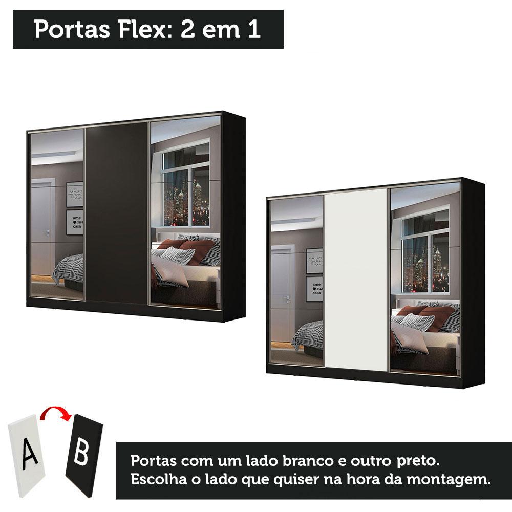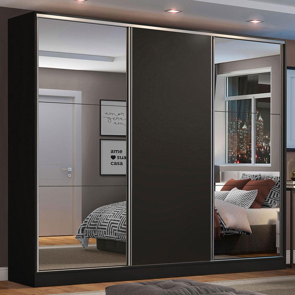 Guarda Roupa Casal 100% MDF Madesa Zurique 3 Portas de Correr com Espelhos - Preto