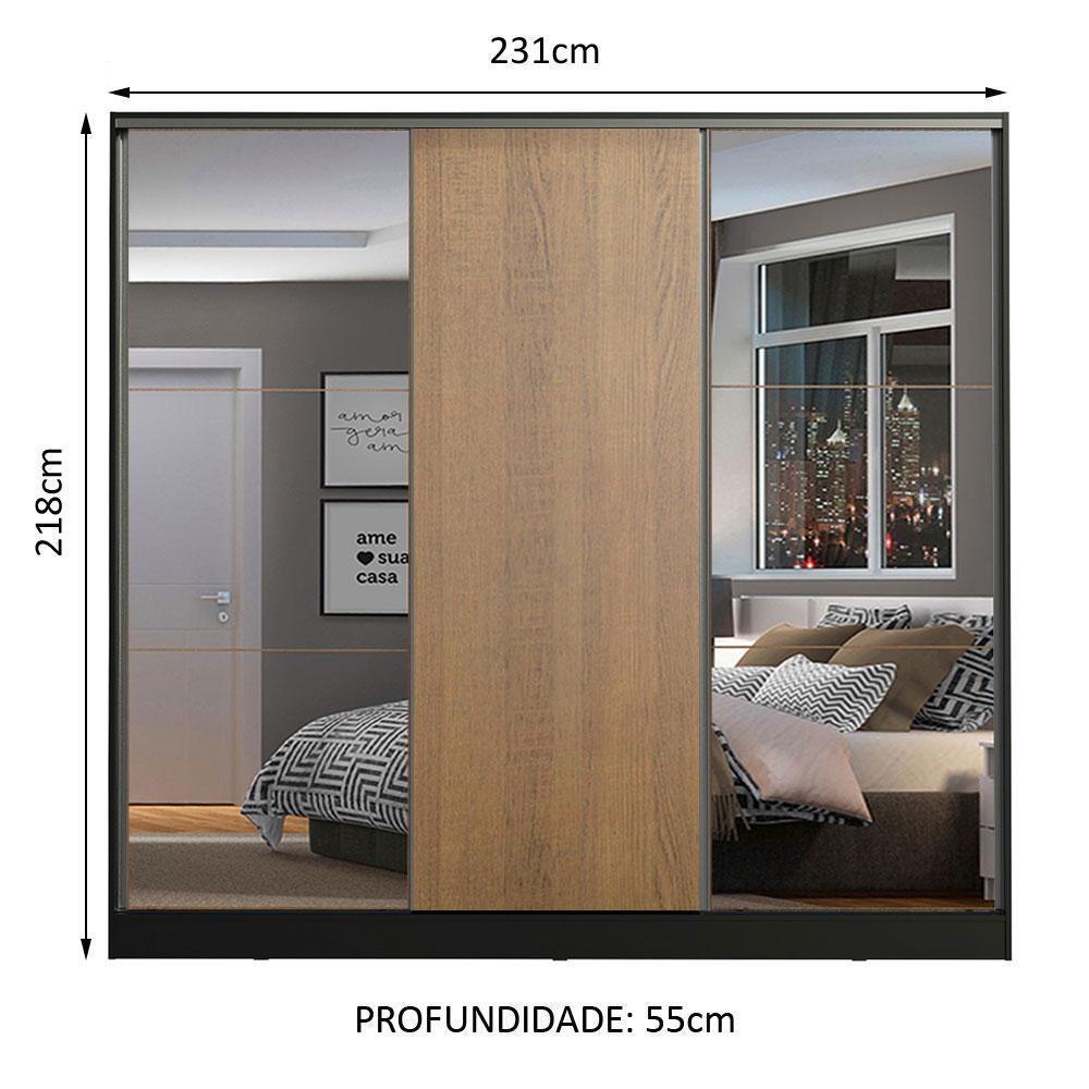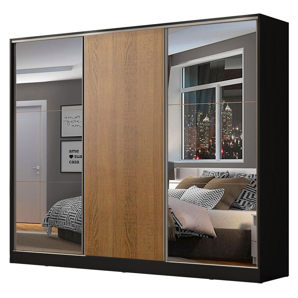 Guarda Roupa Casal 100% MDF Madesa Zurique 3 Portas de Correr com Espelhos - Preto/Rustic