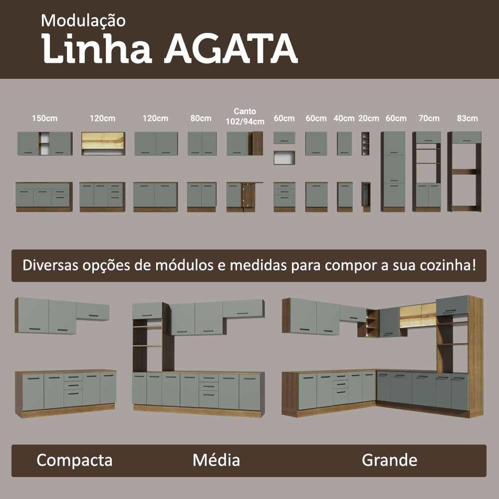 Este Armário de Cozinha Compacta da linha Agata da Madesa é moderno e funcional.O móvel conta com puxadores com alça em alumínio, gavetas com corrediças telescópicas de abertura total, portas com amortecimento para fechamento suave e pés reguláveis em PVC.O grande diferencial deste modelo é a cristaleira. Super sofisticada, possui duas portas de vidro e muito espaço disponível para organizar louças, copos e demais objetos.A cozinha ainda conta com diversas gavetas, prateleiras e nichos. Assim, fica mais fácil fazer a organização de todos os utensílios. Além disso, o balcão acompanha tampo, que pode ser removido para instalação de pia de inox ou pedra, nas medidas de 120 x 52 cm.Esta cozinha é planejada, composta por módulos avulsos que podem ser organizados conforme o espaço do seu ambiente. Também pode ser posteriormente complementada pelos módulos da linha Agata da Madesa.Medidas totais:- 225 cm de altura- 190 cm de largura- 52 cm de profundidade nos balcões e 31 cm no aéreo e na cristaleiraItens inclusos:- Uma (1) Cristaleira de 70 cm com duas (2) portas- Um (1) Balcão de 70 cm com duas (2) portas e tampo- Um (1) Aéreo de 120 cm com duas (2) portas- Um (1) Balcão de 120 cm com duas (2) portas, três (3) gavetas e tampoCódigo do produto:XMGRAG1900017KXMGRAG190001F9XMGRAG1900017GXMGRAG1900016EXMGRAG19000173XMGRAG190001F8XMGRAG1900015LXMGRAG19000109Obs.:- A cristaleira não acompanha pés nem kit para suspender na parede. Deve ser instalada sobre o balcão e fixada na parede.- As imagens são meramente ilustrativas, os eletros e a decoração não acompanham o produto