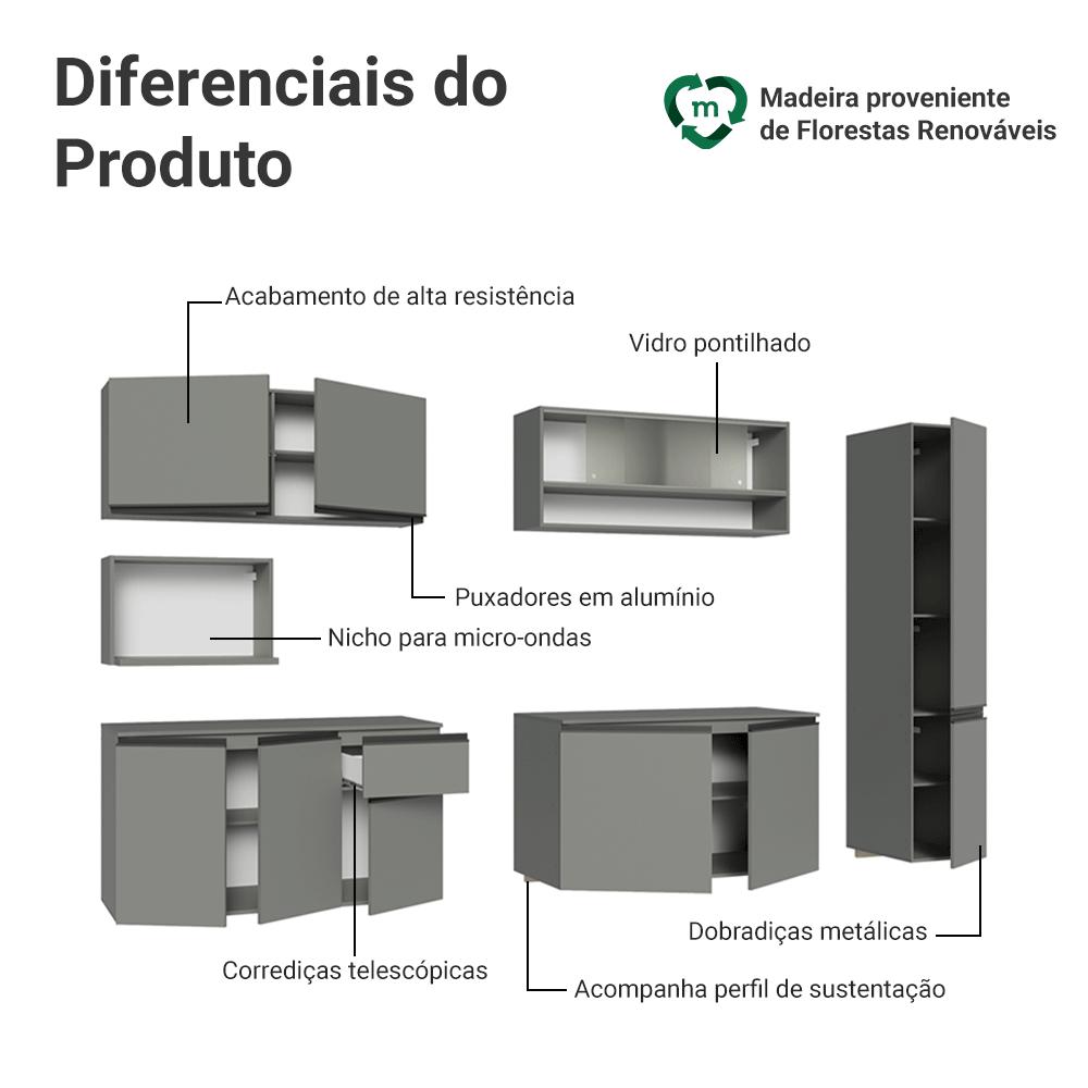 A Cozinha Completa é a solução perfeita para quem busca praticidade e organização. O armário com vidro pontilhado traz um toque de elegância ao ambiente. Com a opção de ser instalada de forma suspensa, essa cozinha oferece um visual moderno.O acabamento se destaca por sua tonalidade sofisticada e atemporal, transmite modernidade, adaptando-se a diferentes estilos de decoração.O balcão conta com dobradiças metálicas nas portas e puxadores em perfil de alumínio, discretos e resistentes. O tampo é removível, o que permite a instalação de cuba ou pedra. O acabamento é de alta resistência, garantindo durabilidade.Medidas totais:- 211 cm de altura- 280 cm de largura- 52 cm de profundidade nos balcões e paneleiro, 31 cm nos aéreos e 45 cm no nicho para micro-ondasO que você recebe:- Um Armário Aéreo de 120 cm com duas portas- Um Nicho aéreo de 60 cm com espaço para forno- Um Armário Aéreo de 120 cm com duas portas em vidro pontilhado- Um Balcão de 120 cm com três portas e uma gaveta - Um Armário Aéreo de 120 cm com duas portas- Um Paneleiro de 40 cm com duas portasCódigo do produto: XMGRNC2800043BXMGRNC2800047PÉ importante saber:- Material: MDP- Imagens meramente ilustrativas, a decoração não acompanha o produto.- A Madesa não oferece serviço de montagem.- O produto segue com manual e todas as ferragens necessárias.- A cozinha não acompanha pés, deve ser instalada de forma suspensa, com fixação na parede.A Madesa se dedica à sustentabilidade com várias iniciativas: temos uma usina própria que gera energia para uma das fábricas. Priorizamos fornecedores responsáveis com o meio ambiente. Todo o plástico utilizado na produção é reciclado, e as sobras também são reaproveitadas. Investimos no desenvolvimento de nossos colaboradores e em ações que beneficiem a comunidade.