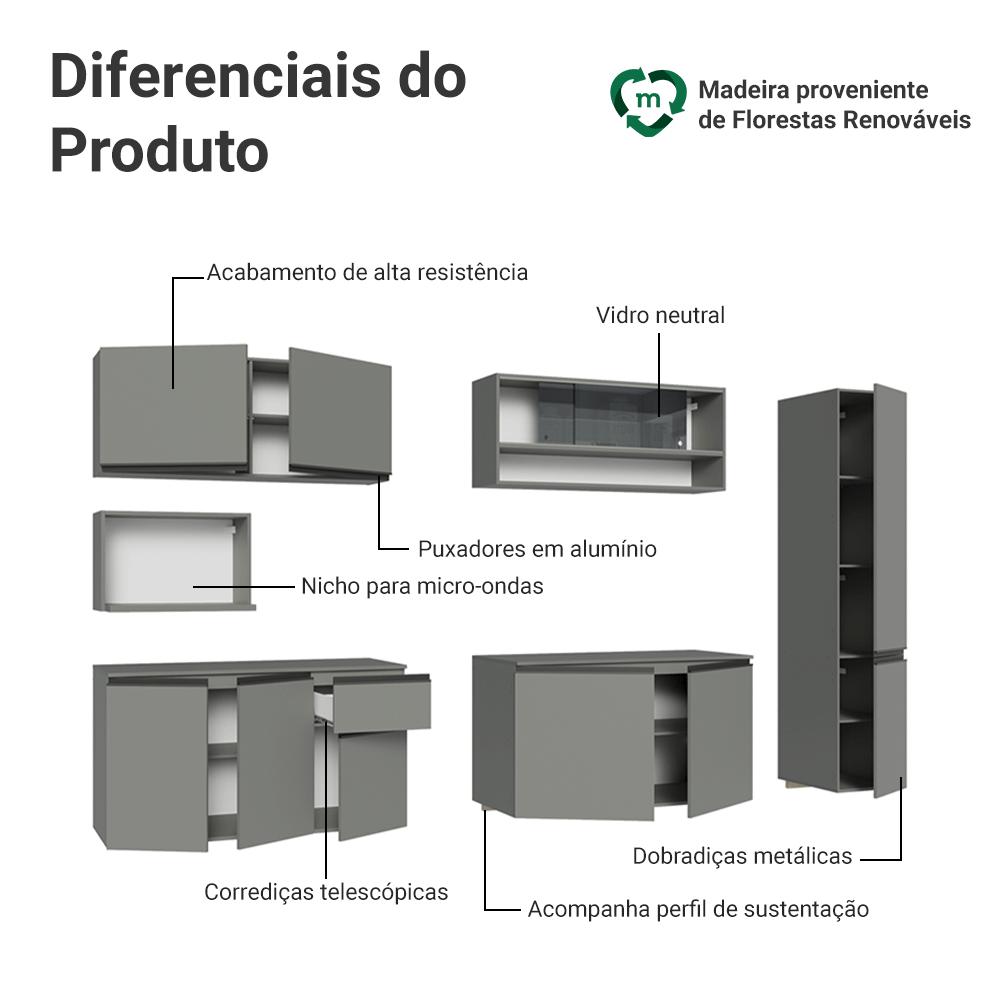 A Cozinha Completa é a solução perfeita para quem busca praticidade e organização. O armário com vidro neutral traz um toque de elegância ao ambiente. Com a opção de ser instalada de forma suspensa, essa cozinha oferece um visual moderno.O acabamento se destaca por sua tonalidade sofisticada e atemporal, transmite modernidade, adaptando-se a diferentes estilos de decoração.O balcão conta com dobradiças metálicas nas portas e puxadores em perfil de alumínio, discretos e resistentes. O tampo é removível, o que permite a instalação de cuba ou pedra. O acabamento é de alta resistência, garantindo durabilidade.Medidas totais:- 211 cm de altura- 280 cm de largura- 52 cm de profundidade nos balcões e paneleiro, 31 cm nos aéreos e 45 cm no nicho para micro-ondasO que você recebe:- Um Armário Aéreo de 120 cm com duas portas- Um Nicho aéreo de 60 cm com espaço para forno- Um Armário Aéreo de 120 cm com duas portas em vidro neutral- Um Balcão de 120 cm com três portas e uma gaveta - Um Armário Aéreo de 120 cm com duas portas- Um Paneleiro de 40 cm com duas portasCódigo do produto:XMGRNC2800053BXMGRNC2800057PÉ importante saber:- Material: MDP- Imagens meramente ilustrativas, a decoração não acompanha o produto.- A Madesa não oferece serviço de montagem.- O produto segue com manual e todas as ferragens necessárias.- A cozinha não acompanha pés, deve ser instalada de forma suspensa, com fixação na parede.A Madesa se dedica à sustentabilidade com várias iniciativas: temos uma usina própria que gera energia para uma das fábricas. Priorizamos fornecedores responsáveis com o meio ambiente. Todo o plástico utilizado na produção é reciclado, e as sobras também são reaproveitadas. Investimos no desenvolvimento de nossos colaboradores e em ações que beneficiem a comunidade.