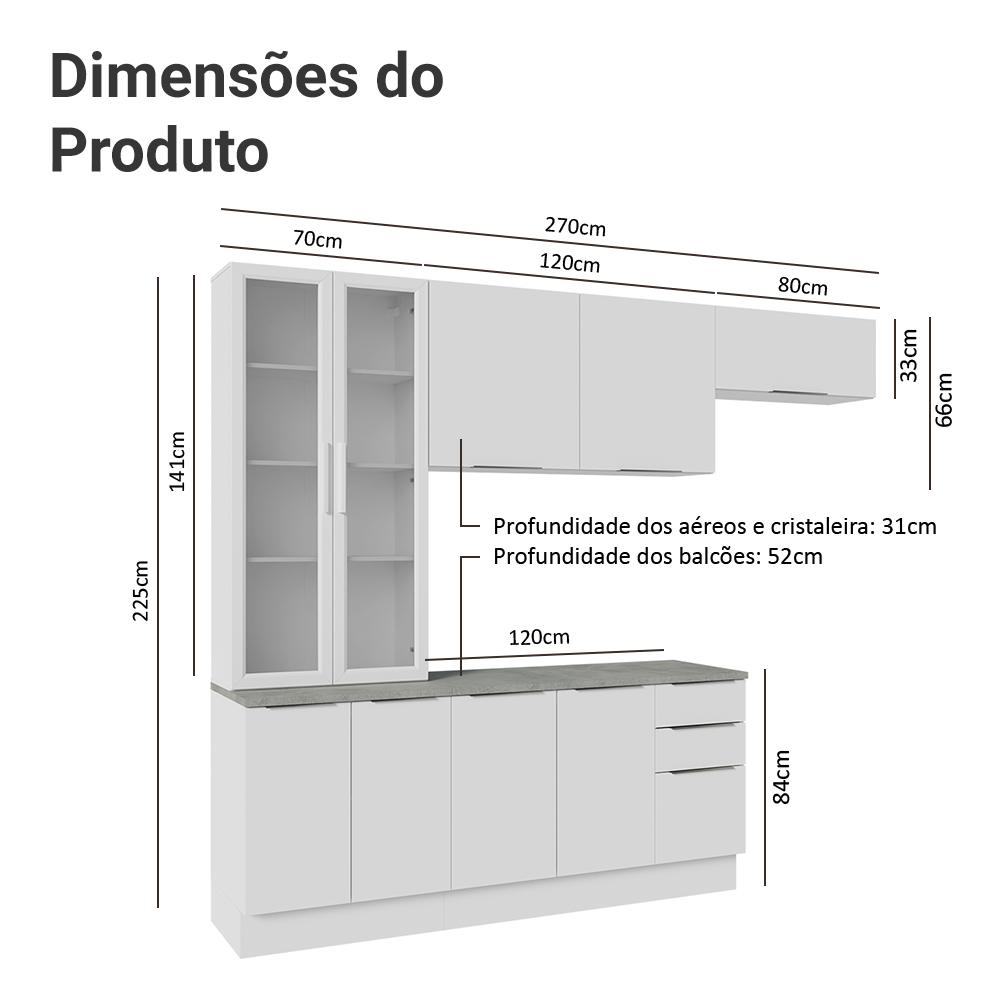 A Cozinha Completa Stella da Madesa é a opção ideal para deixar sua cozinha mais sofisticada e moderna.Um destaque especial desta versão é a cristaleira, que adiciona um toque de elegância ao ambiente. Com duas portas de vidro, proporciona um amplo espaço para exibir louças, copos e itens decorativos.Outros diferenciais deste móvel são os puxadores em alumínio e as gavetas com corrediças telescópicas de abertura total. Possui ainda portas com amortecimento para fechamento suave e pés reguláveis em PVC.Esta cozinha é formada por módulos avulsos, permitindo que você os organize de acordo com a necessidade do seu ambiente. E, se desejar, você poderá ampliá-la futuramente com outros módulos da linha Stella.Para completar, o acabamento de alta resistência é brancoMedidas totais:- 225 cm de altura- 270 cm de largura- 52 cm de profundidade nos balcões e 31 cm nos aéreosO que você recebe:- Uma Cristaleira de 70 cm com duas portas- Um Balcão de 70 cm com duas portas e tampo- Um Aéreo de 120 cm com duas portas- Um Balcão de 120 cm com duas portas, três gavetas e tampo- Um Aéreo de 80 cm com uma porta basculanteCódigo do produto: XMGRTE27001109XMGRTE2700119BXMGRTE2700115ZXMGRTE2700116EÉ bom saber:- A cristaleira não acompanha pés nem kit para suspender na parede. Deve ser instalada sobre o balcão e fixada na parede.- As imagens são meramente ilustrativas, os eletros e a decoração não acompanham o produto- A Madesa não oferece serviço de montagemA Madesa se dedica à sustentabilidade com várias iniciativas: temos uma usina própria para gerar energia que abastece uma de nossas fábricas. Selecionamos nossos fornecedores, priorizando aqueles que possuem um compromisso com a sustentabilidade e proteção do meio ambiente. Todo o plástico utilizado no setor produtivo é proveniente de reciclagem e as suas sobras são encaminhadas ao fornecedor que os recicla. Também investimos no desenvolvimento contínuo de nossos colaboradores e em ações educacionais que beneficiem a comunidade.