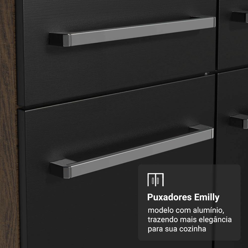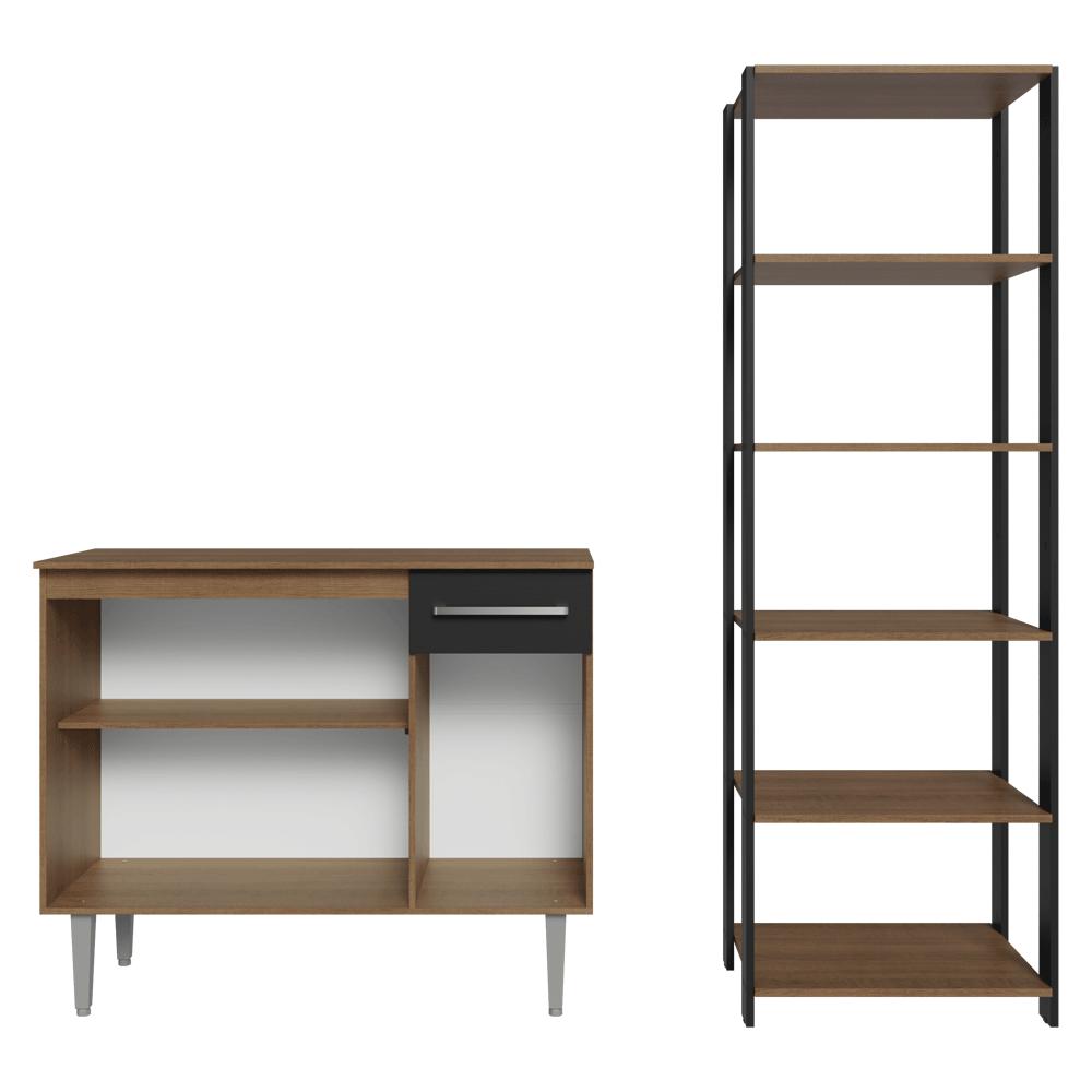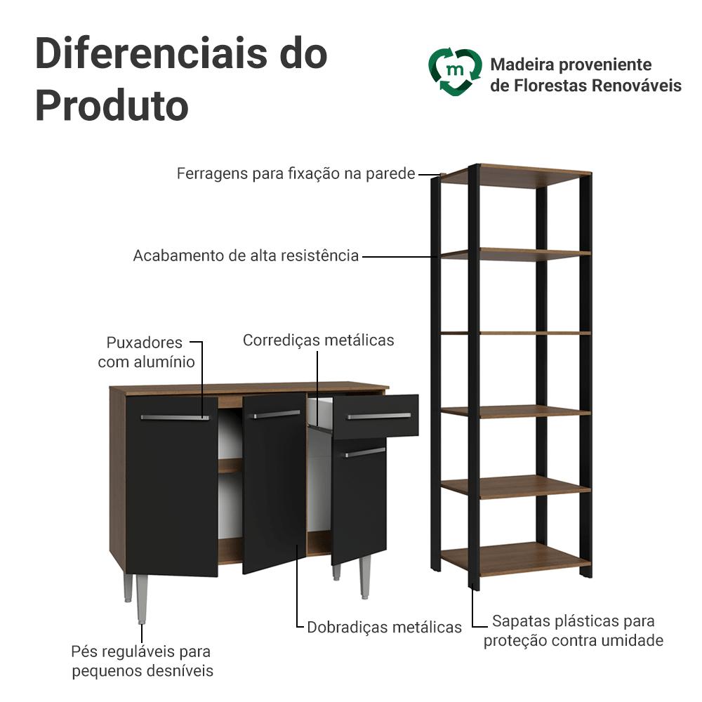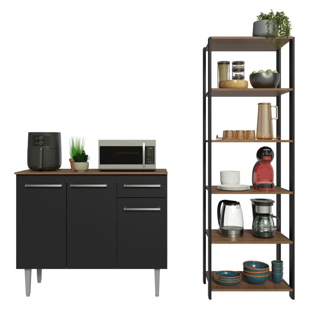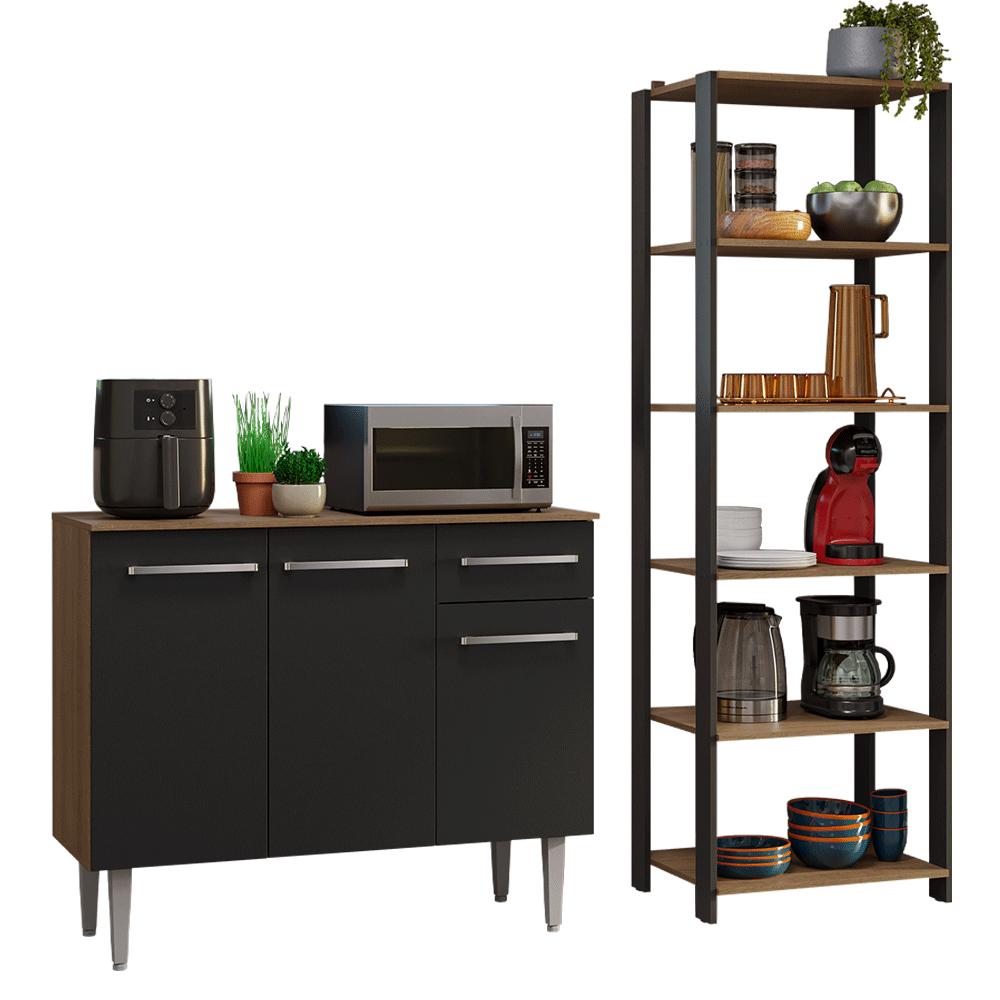 Maximize o espaço da sua cozinha com o kit de balcão e estante, projetado para oferecer praticidade e elegância ao seu ambiente.Com um design moderno e funcional, este móvel é ideal para armazenar utensílios, mantimentos e eletros de forma organizada.Esta composição é versátil, permitindo diferentes formas de uso para atender às suas necessidades.A qualidade dos móveis é um diferencial. O balcão possui pés reguláveis, puxadores com alumínio, além de corrediças e dobradiças metálicas.O acabamento de alta resistência dos móveis combina os tons preto e amadeirado Rustic.Medidas do balcão:- 87 cm de altura- 105 cm de largura- 44 cm de profundidadeMedidas da estante:- 180 cm de altura- 59 cm de largura- 45 cm de profundidadeO que você recebe:- Um (1) Balcão de 105 cm com três portas, uma gaveta e tampo- Uma (1) Estante de 59 cm com cinco prateleiras- Ferragens e manual de montagemCódigo do produto: MDMU020010L3É bom saber:- As imagens são meramente ilustrativas- A Madesa não oferece serviço de montagem- Por segurança, é obrigatório fixar a estante na parede- Material: MDP. Inclusive nas estruturas laterais da estante.A Madesa se dedica à sustentabilidade com várias iniciativas: temos uma usina própria para gerar energia que abastece uma de nossas fábricas. Selecionamos nossos fornecedores, priorizando aqueles que possuem um compromisso com a sustentabilidade e proteção do meio ambiente. Todo o plástico utilizado no setor produtivo é proveniente de reciclagem e as suas sobras são encaminhadas ao fornecedor que os recicla. Também investimos no desenvolvimento contínuo de nossos colaboradores e em ações educacionais que beneficiem a comunidade.