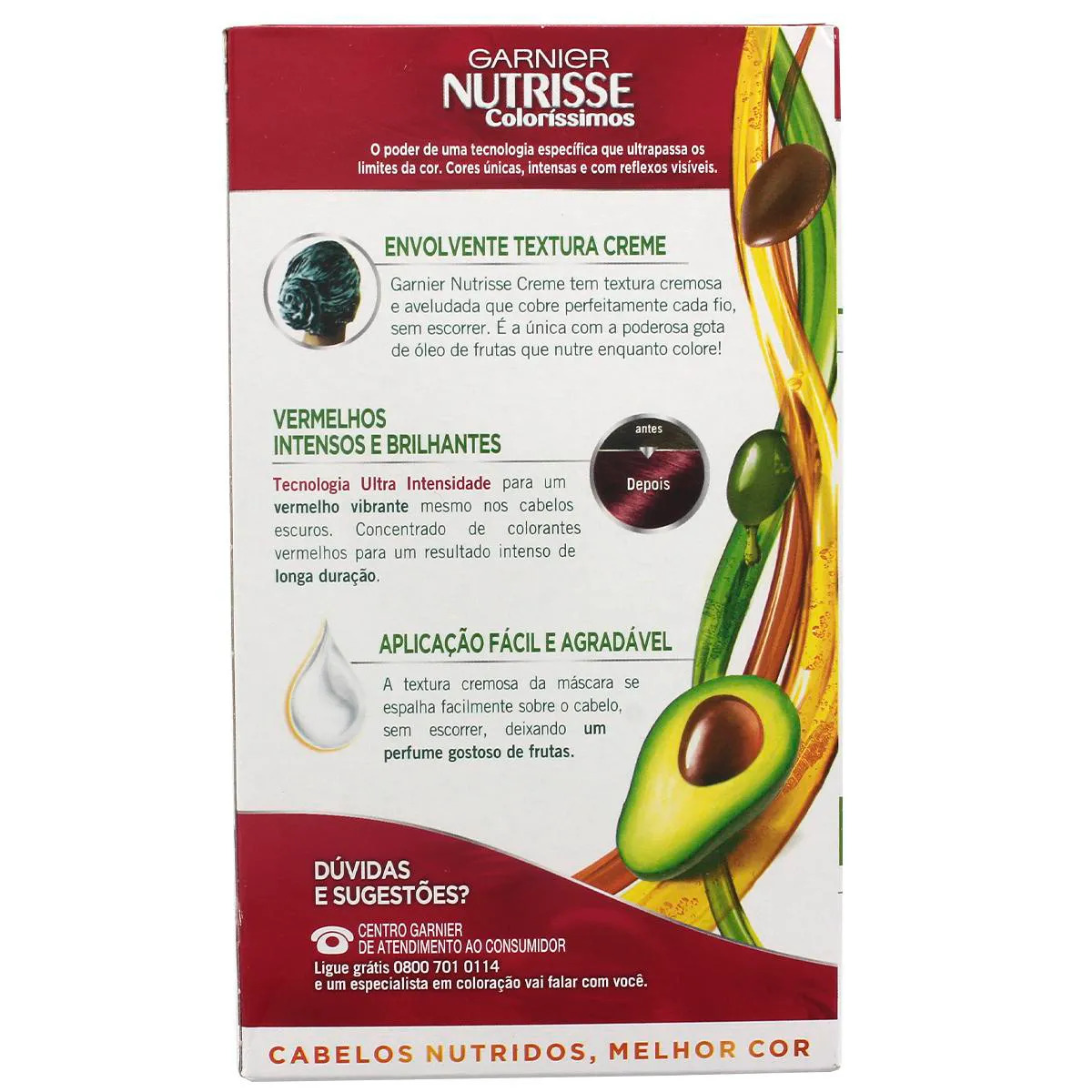 O que é: Nutrisse Creme é enriquecido com óleos de frutas. Só ele tem a gota poderosa, que nutre enquanto colore. Tecnologia que protege a fibra capilar do ressecamento. Seus cabelos macios, brilhantes e com delicioso perfume de frutas. Para que serve: A Tintura para Cabelos da Nutrisse possui textura em creme, mais fácil de aplicar e não escorre e ainda conta com óleo Vitamina, em sua formulação, que penetra na fibra capilar e a protege do ressecamento, deixando seus cabelos mais macios, brilhantes e perfumados. Cor profunda e vibrante por mais tempo, 100% de cobertura dos fios brancos. Modo de usar: Misture a Gota Poderosa e a Máscara Colorante no aplicador o Creme revelador. Misture tudo até obter uma mistura homogênea. Divida os fios: com os cabelos secos, comece por separar os fios em mechas de mais ou menos dois centímetros de espessura. Aplique a cor nos cabelos: coloque as luvas nas mãos e espalhe a mistura em cada seção de forma uniforme, usando um pincel específico ou os próprios dedo. Deixe agir: agora, deixe a mistura agir nas madeixas pelo empo indicado na caixinha, aproximadamente 40 minutos. Enxágue: com o chuveiro, remova toda a fórmula dos fios, sem usar shampoo; 6. Hidrate: aplique o tratamento de Blindagem Nutritiva em todo o cabelo e enxágue.