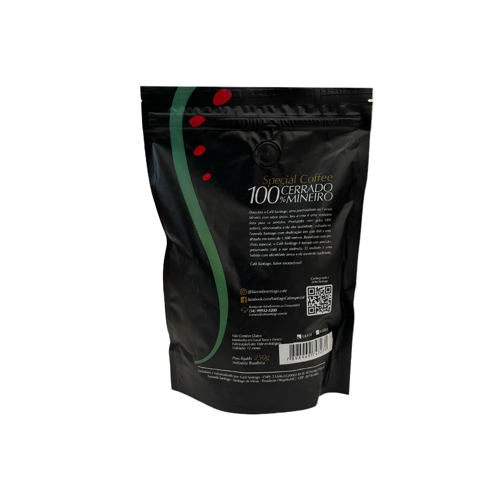 Santiago é um café cuidadosamente produzido a partir de grãos 100% arábica, selecionados e de alta qualidade. Esses grãos são cultivados na Fazenda Santiago, situada a uma altitude entre 950 e 1.100 metros, resultando em um café de identidade única e excelente qualidade.